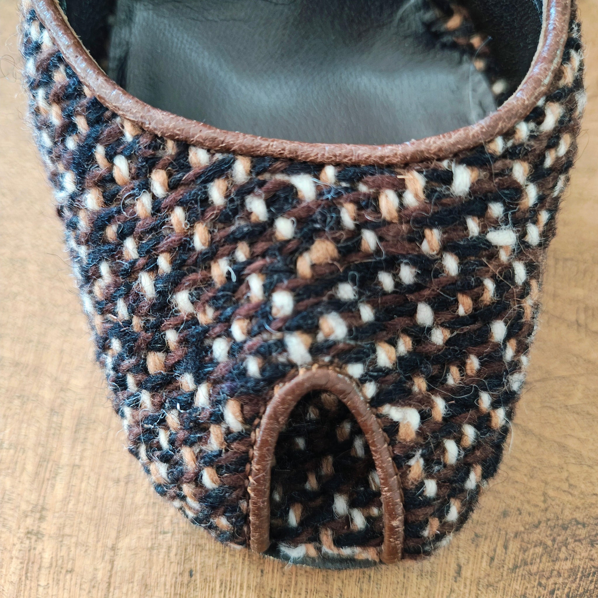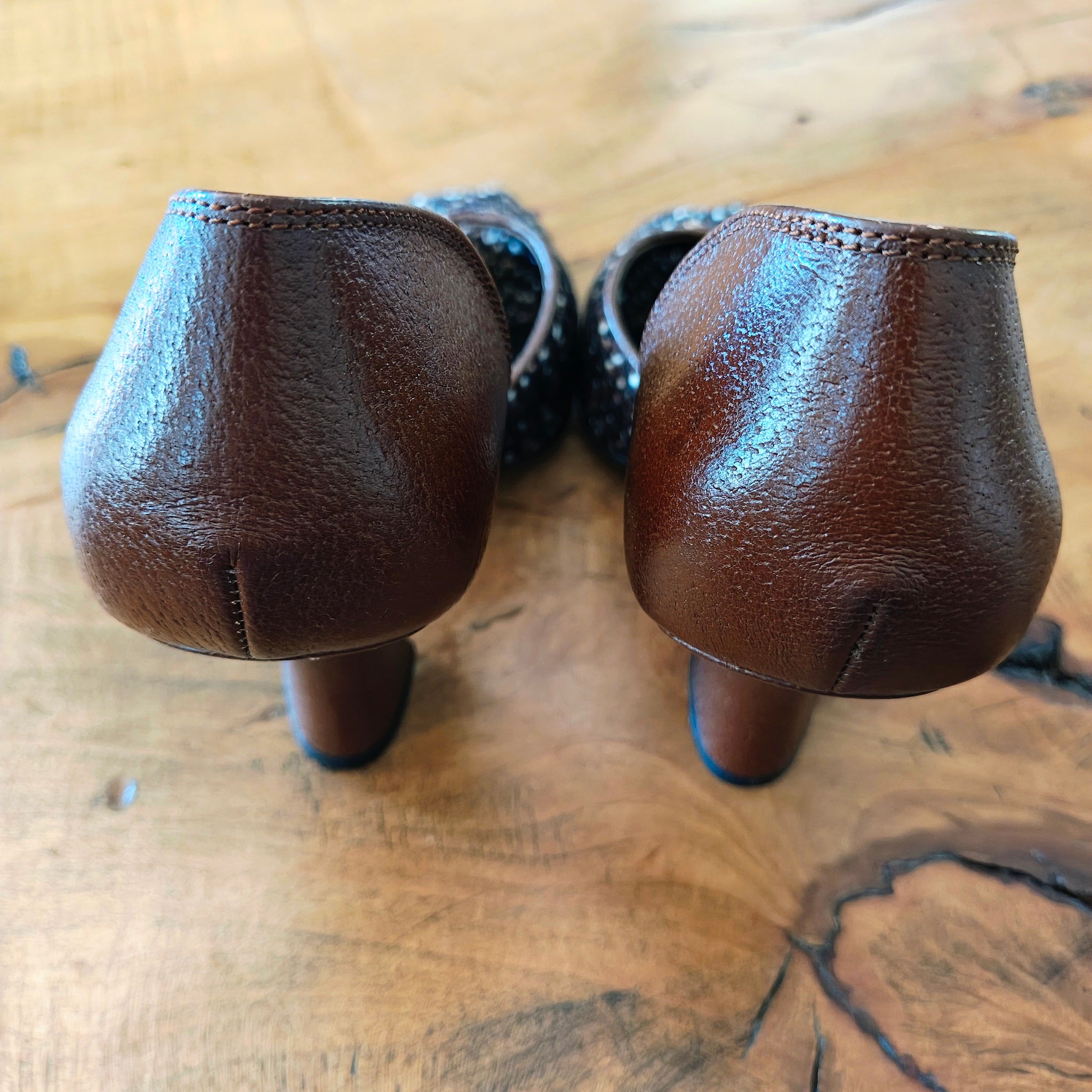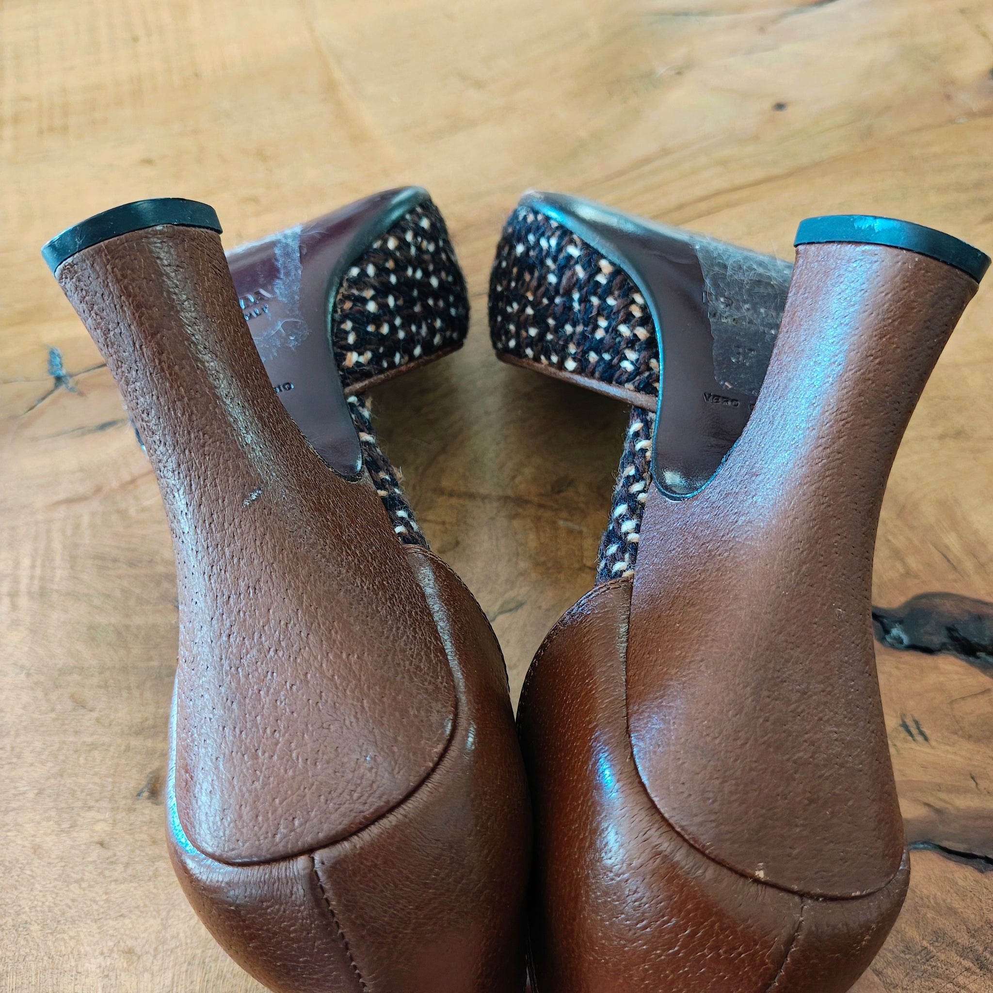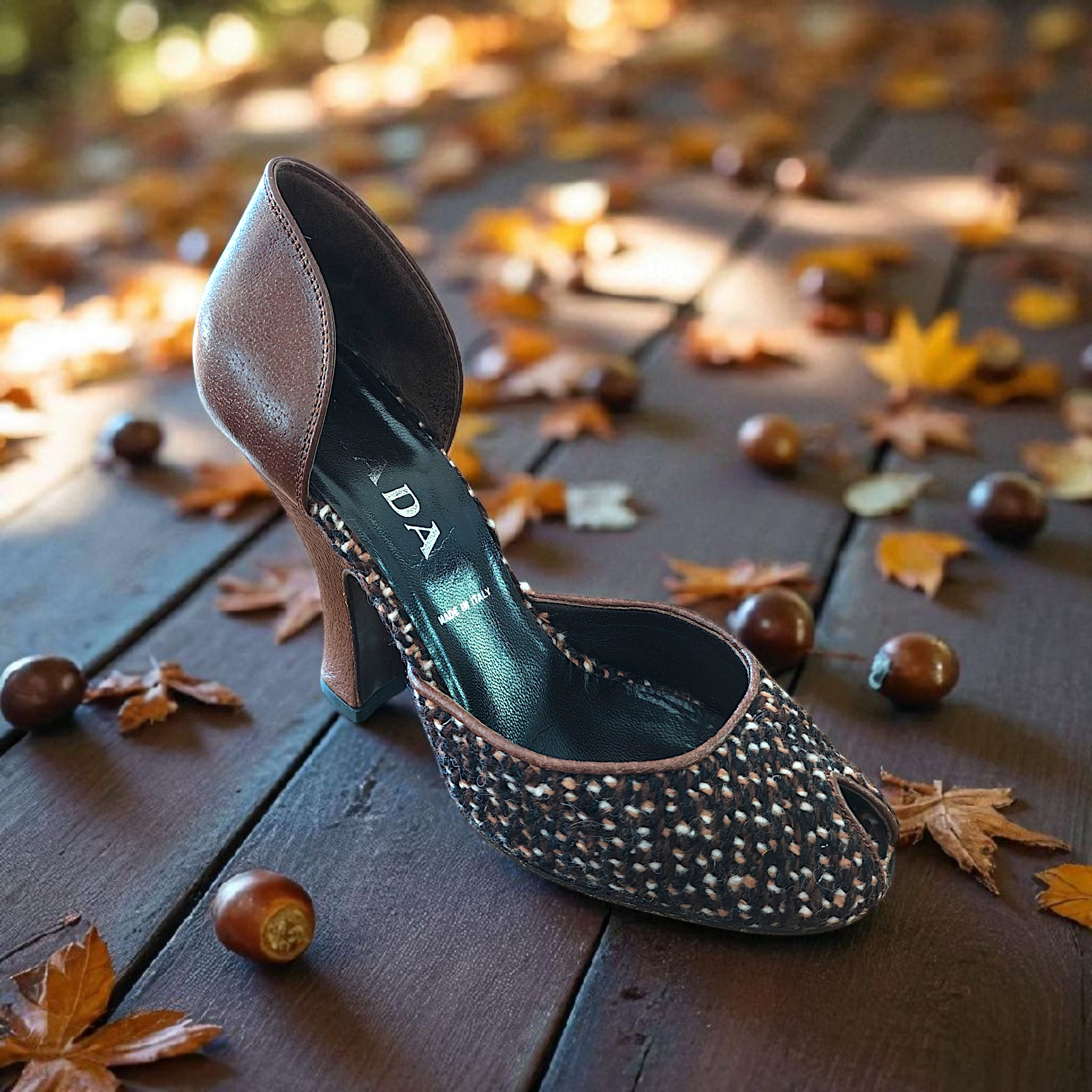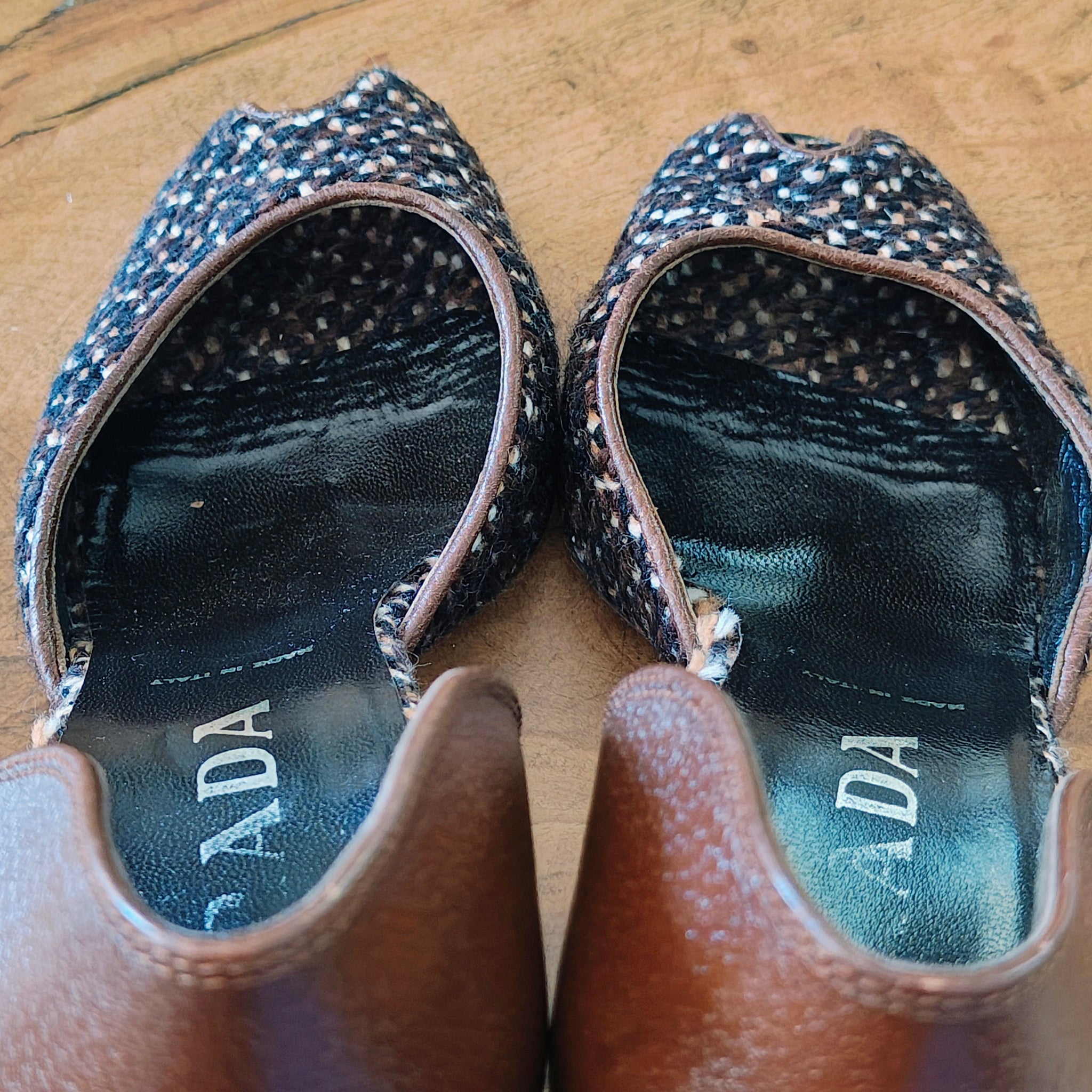 Prada tweed and leather peep-toe d'Orsay heels. The d'Orsay style is characterized by the cut-away sides, revealing the arch of the foot, and a peep-toe style features an opening at the front of the shoe where the toes are visible. The heels have a chunky heel and a mix of brown leather and a woven, tweed-like texture.