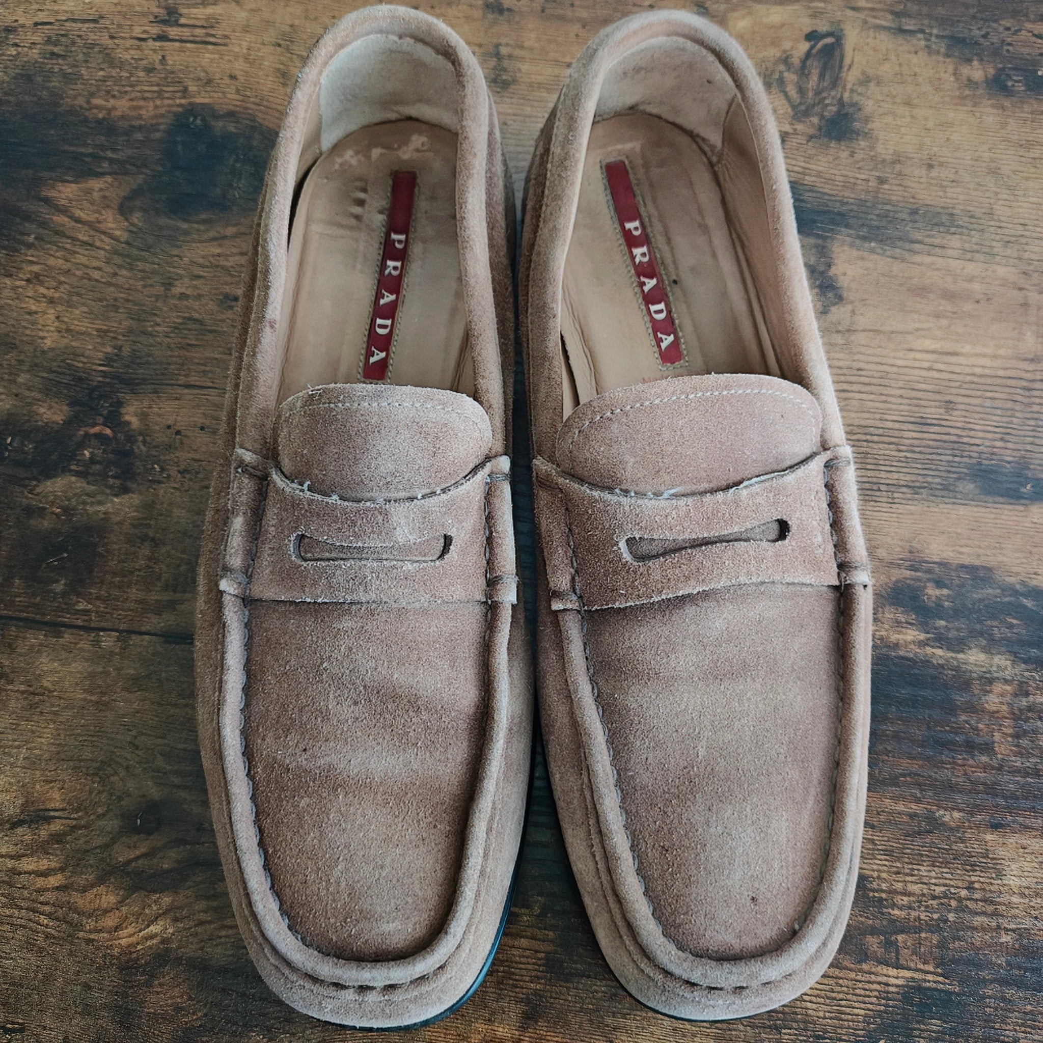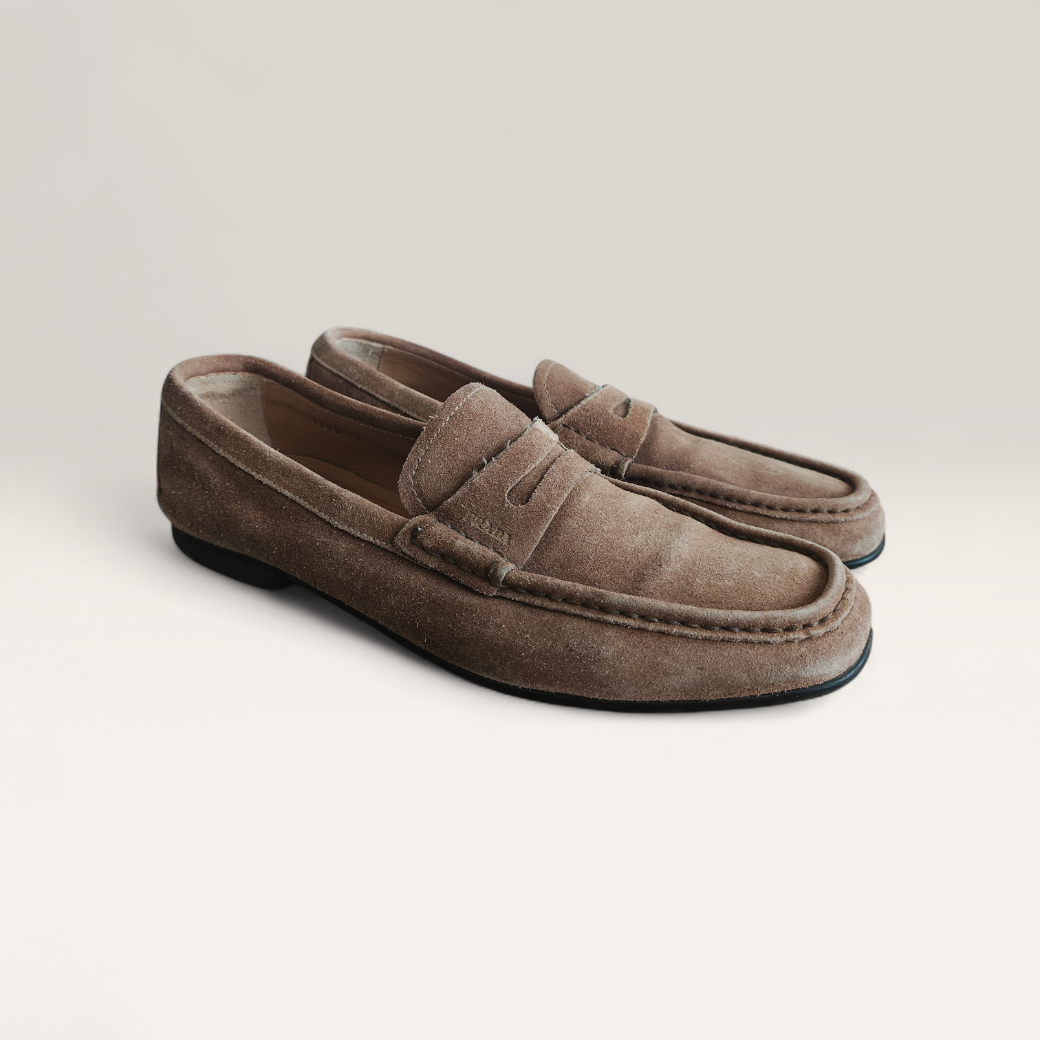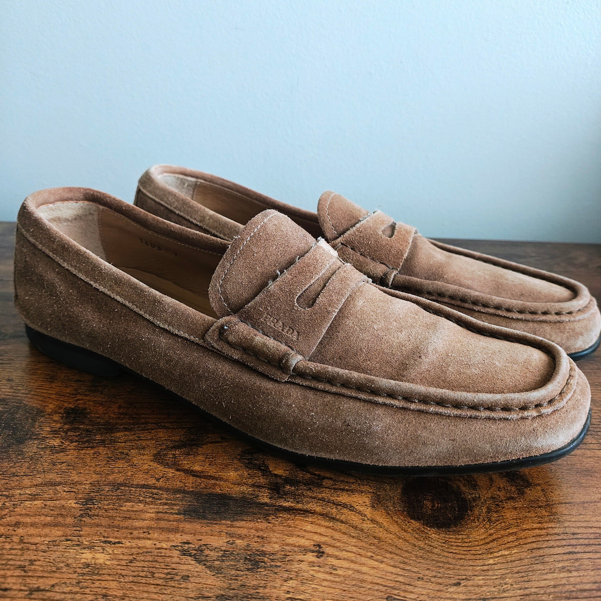 Prada brown suede penny loafers or driving shoes. Feature a classic moc-toe design, a penny keeper strap across the vamp, and a flat rubber driving-style sole.
