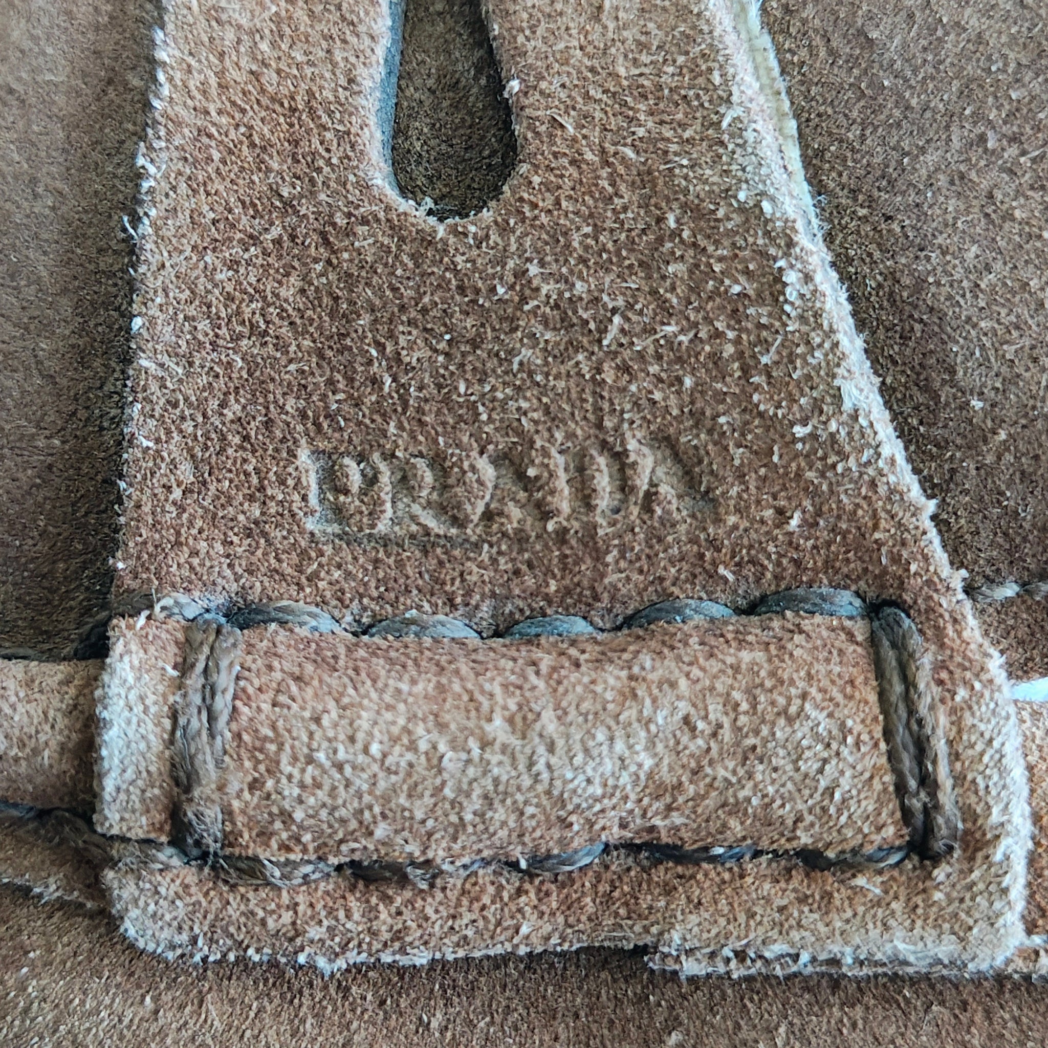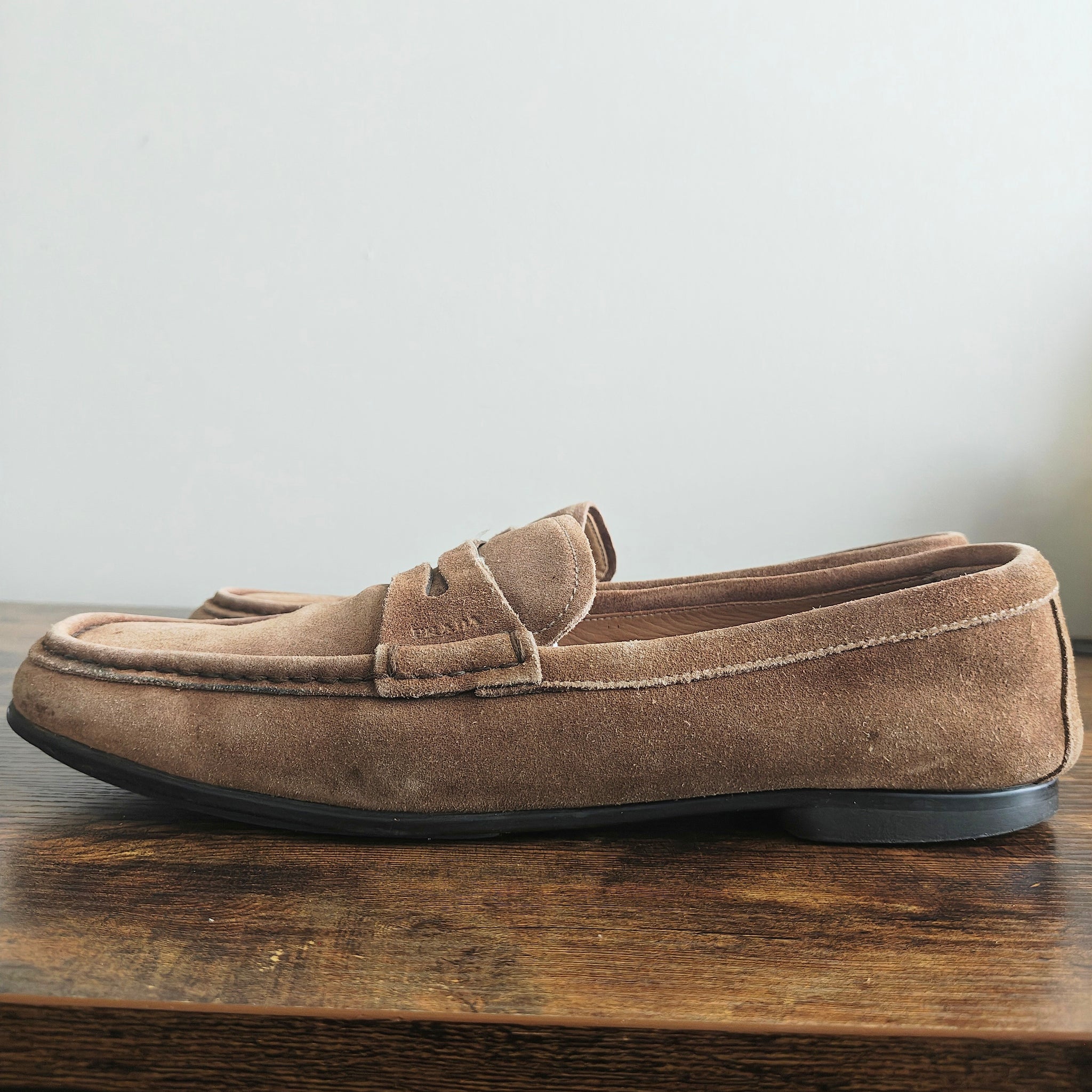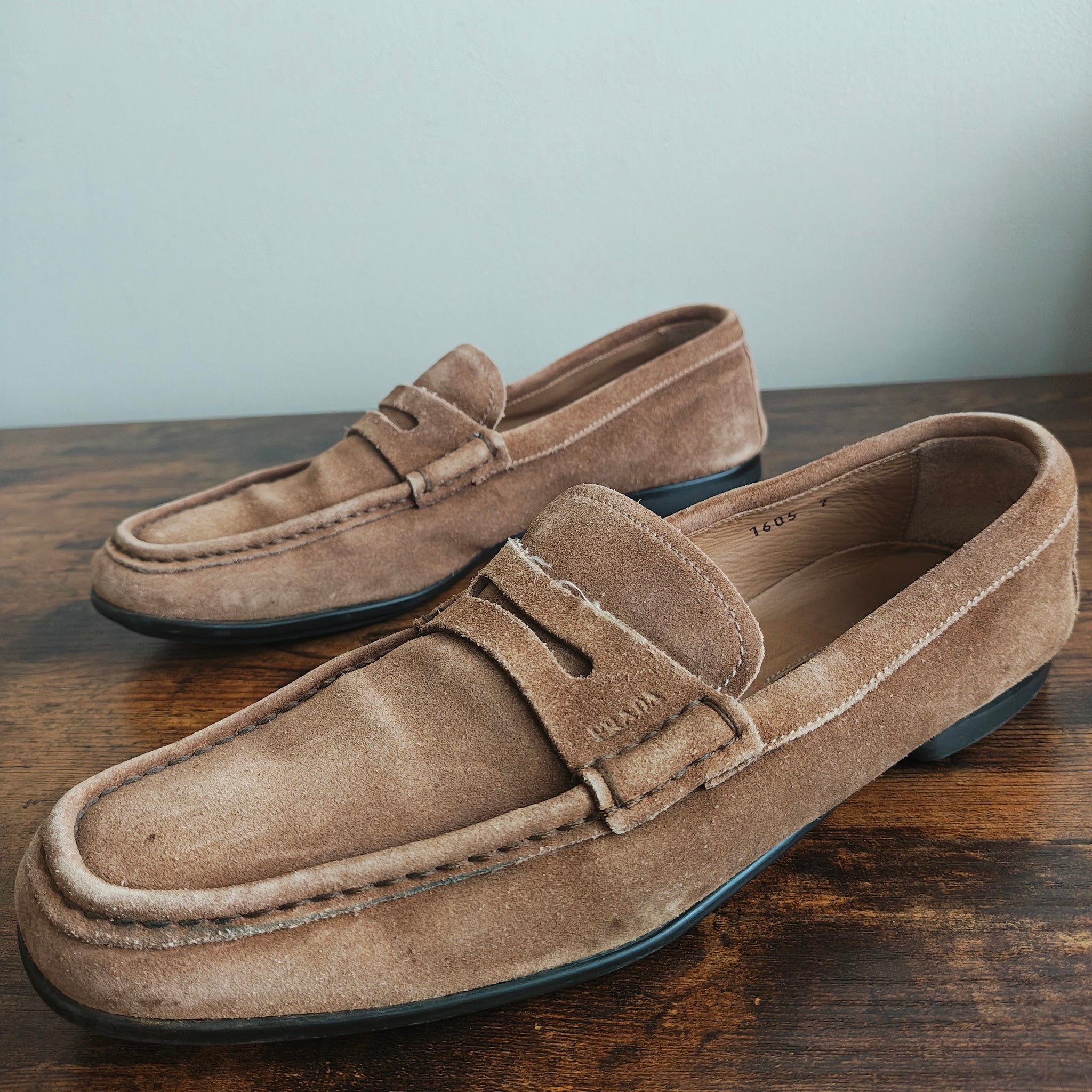 Prada brown suede penny loafers or driving shoes. Feature a classic moc-toe design, a penny keeper strap across the vamp, and a flat rubber driving-style sole.