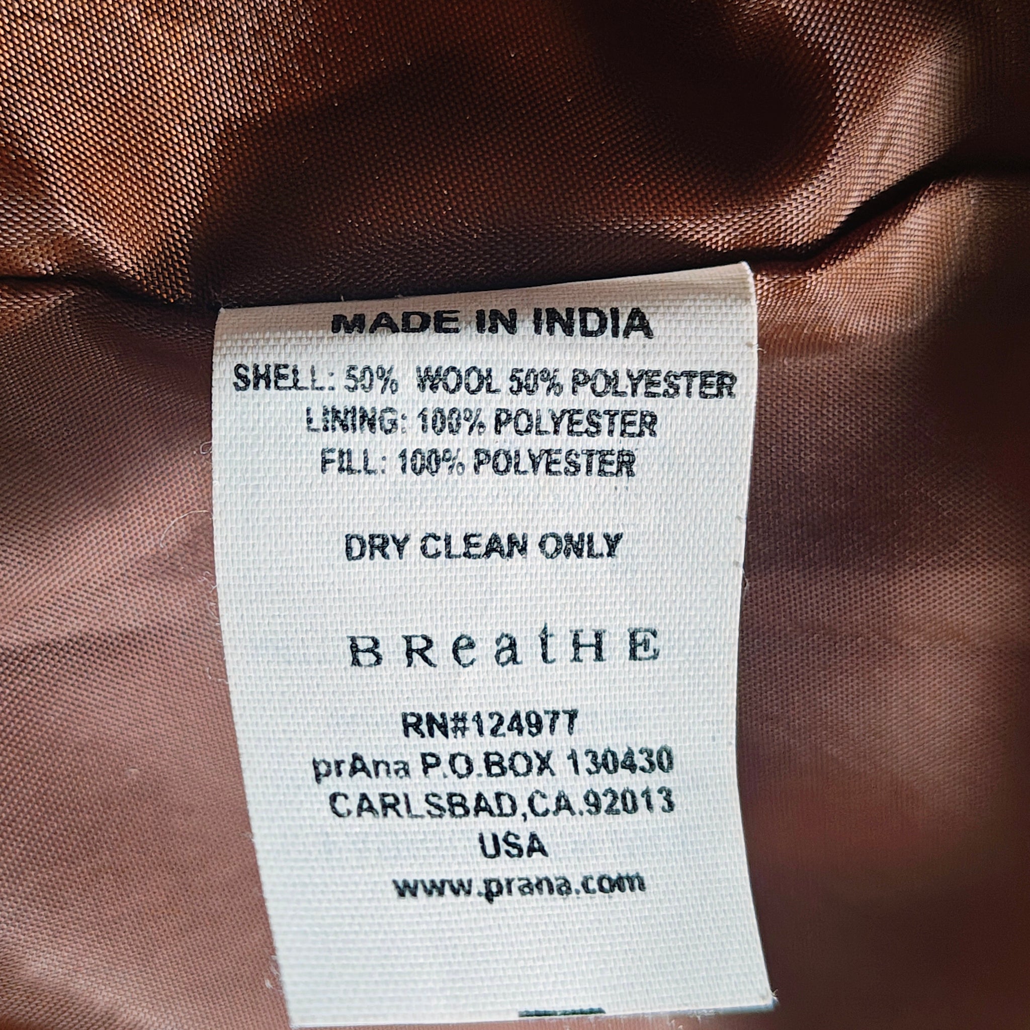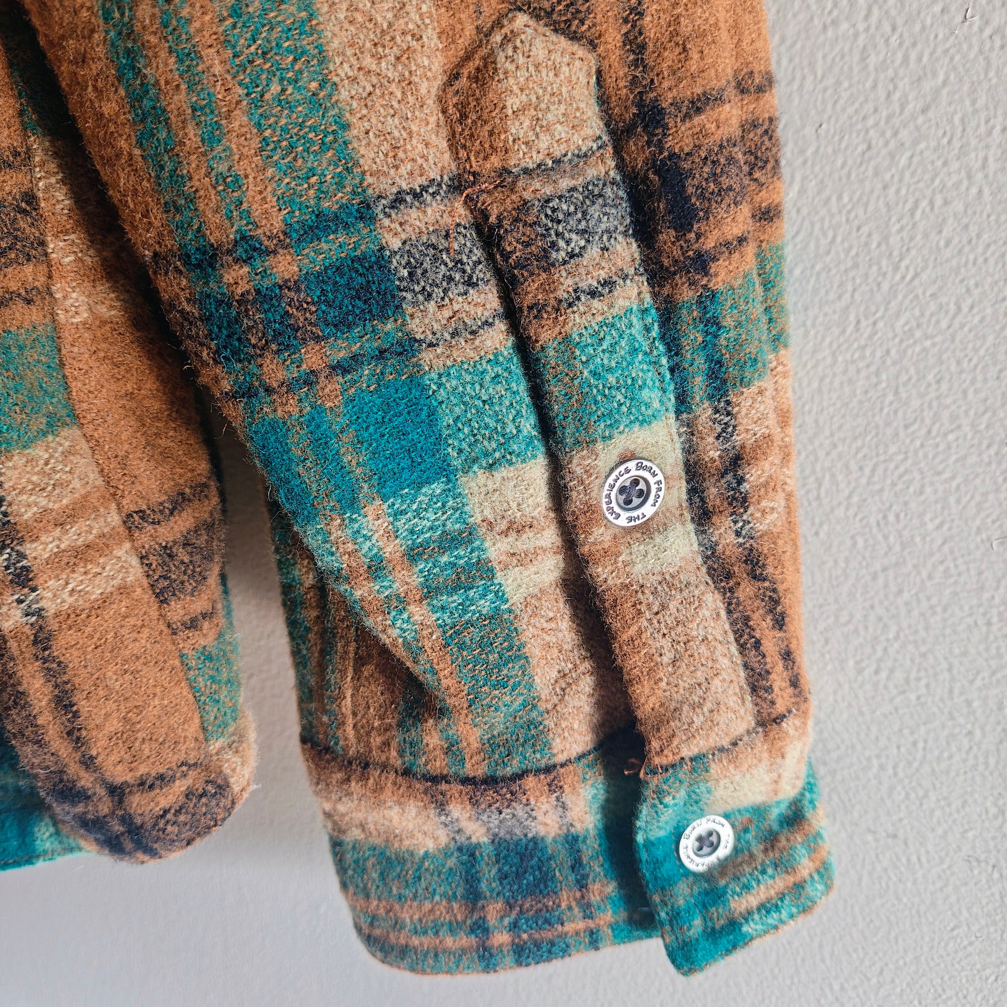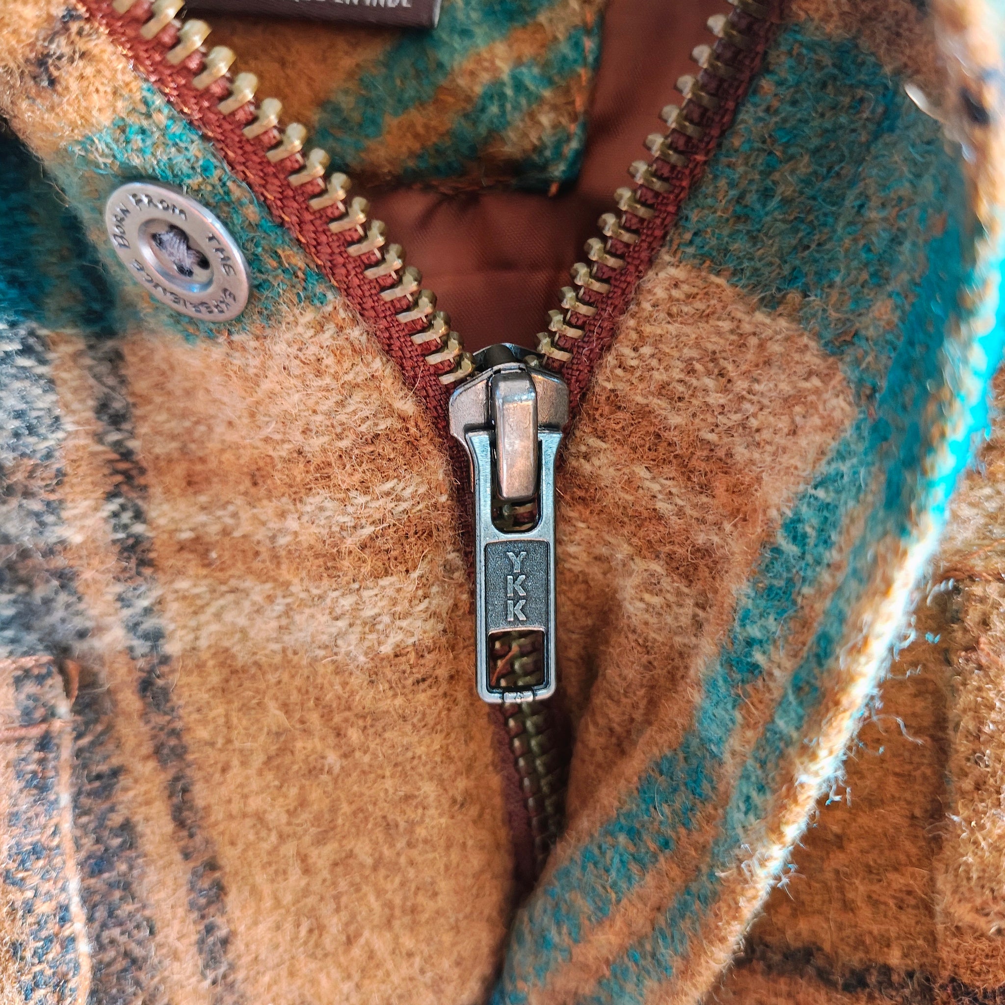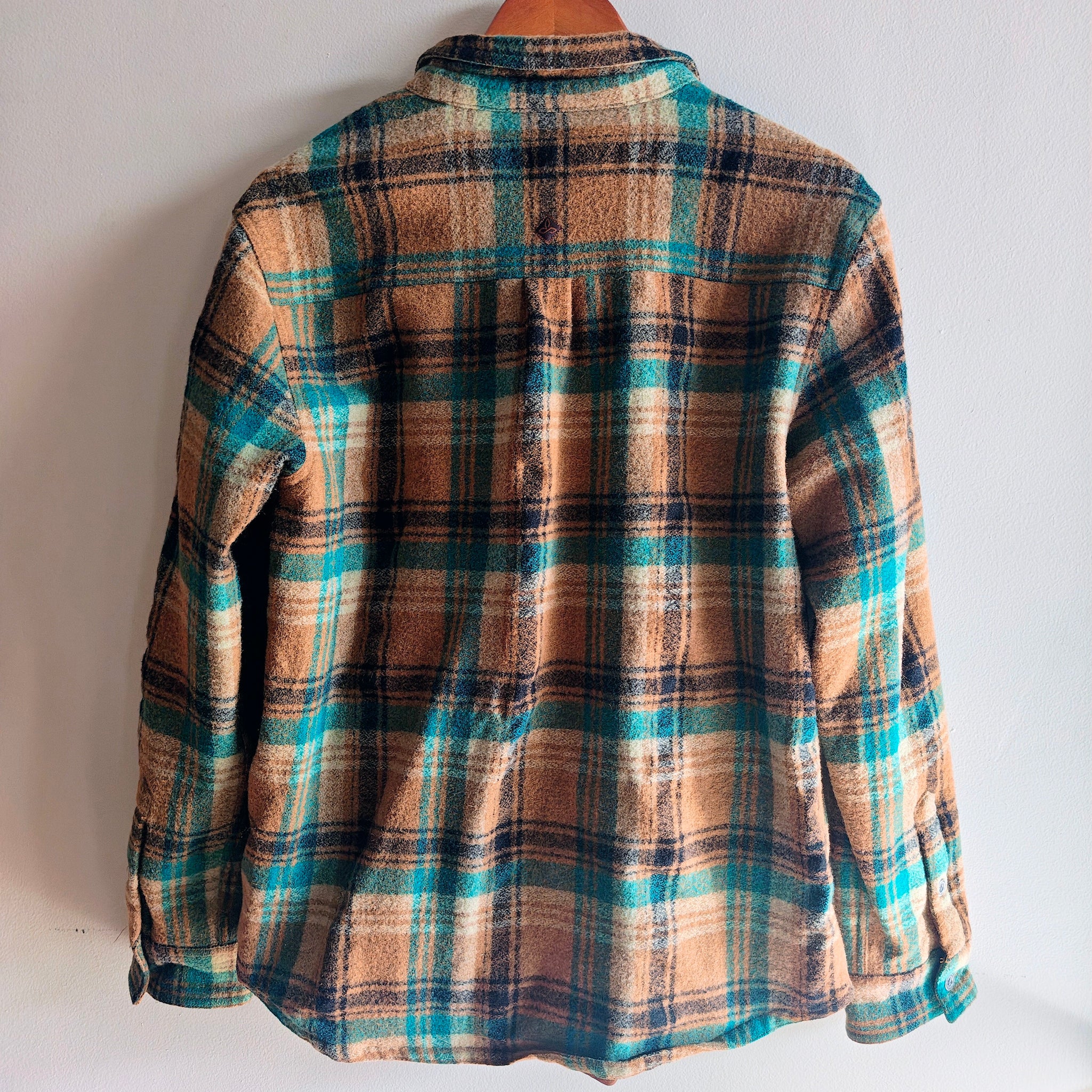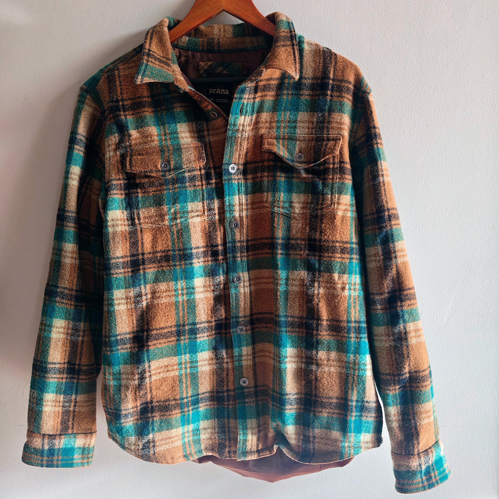 Prana wool-blend plaid flannel shirt jacket, specifically in a colorway featuring brown, tan, and teal.