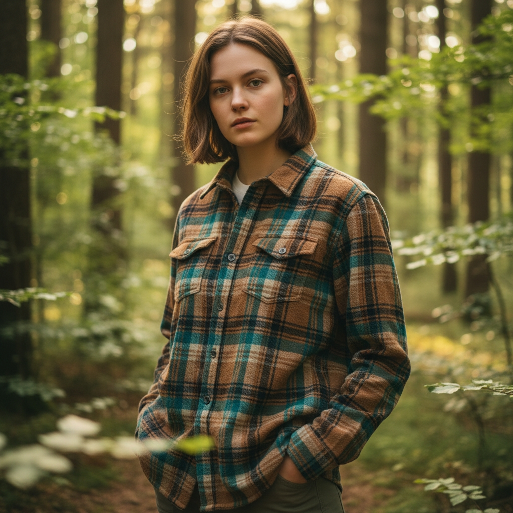 Color: The plaid pattern uses various shades of brown, tan, black, and a distinct teal/turquoise blue.