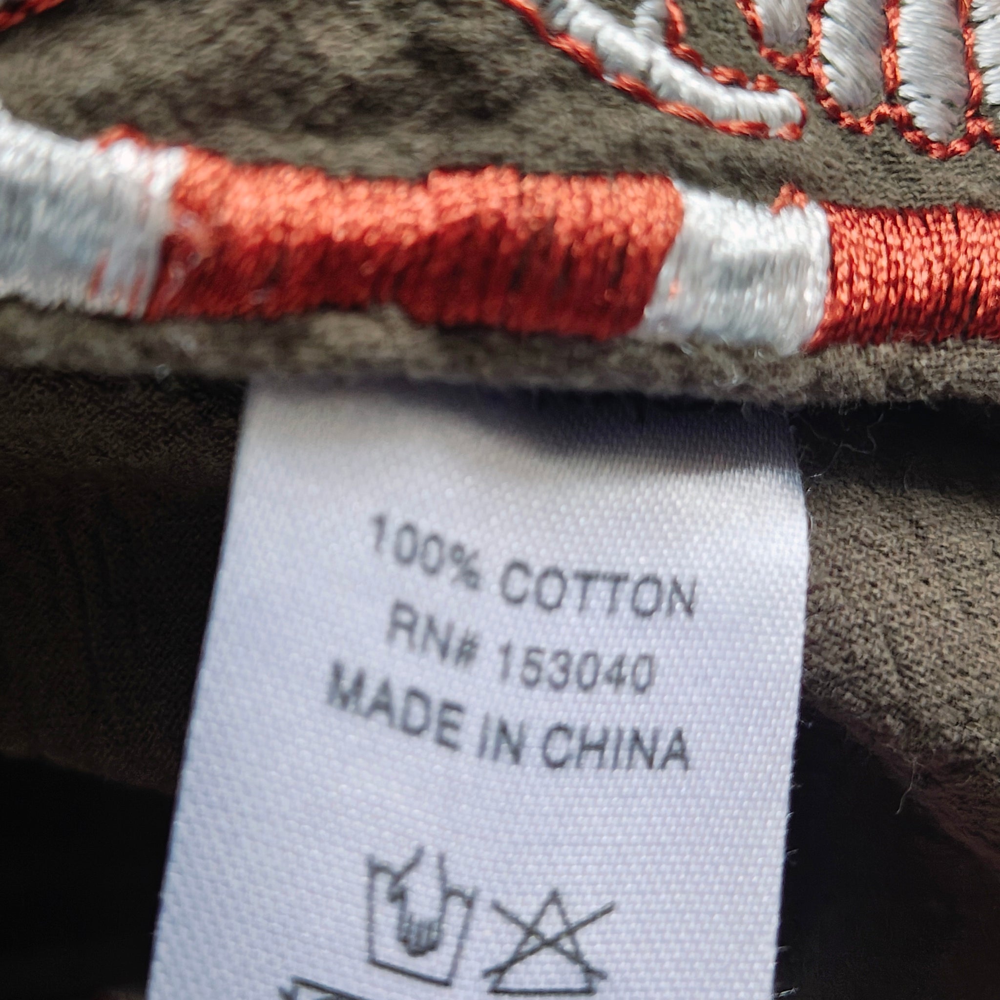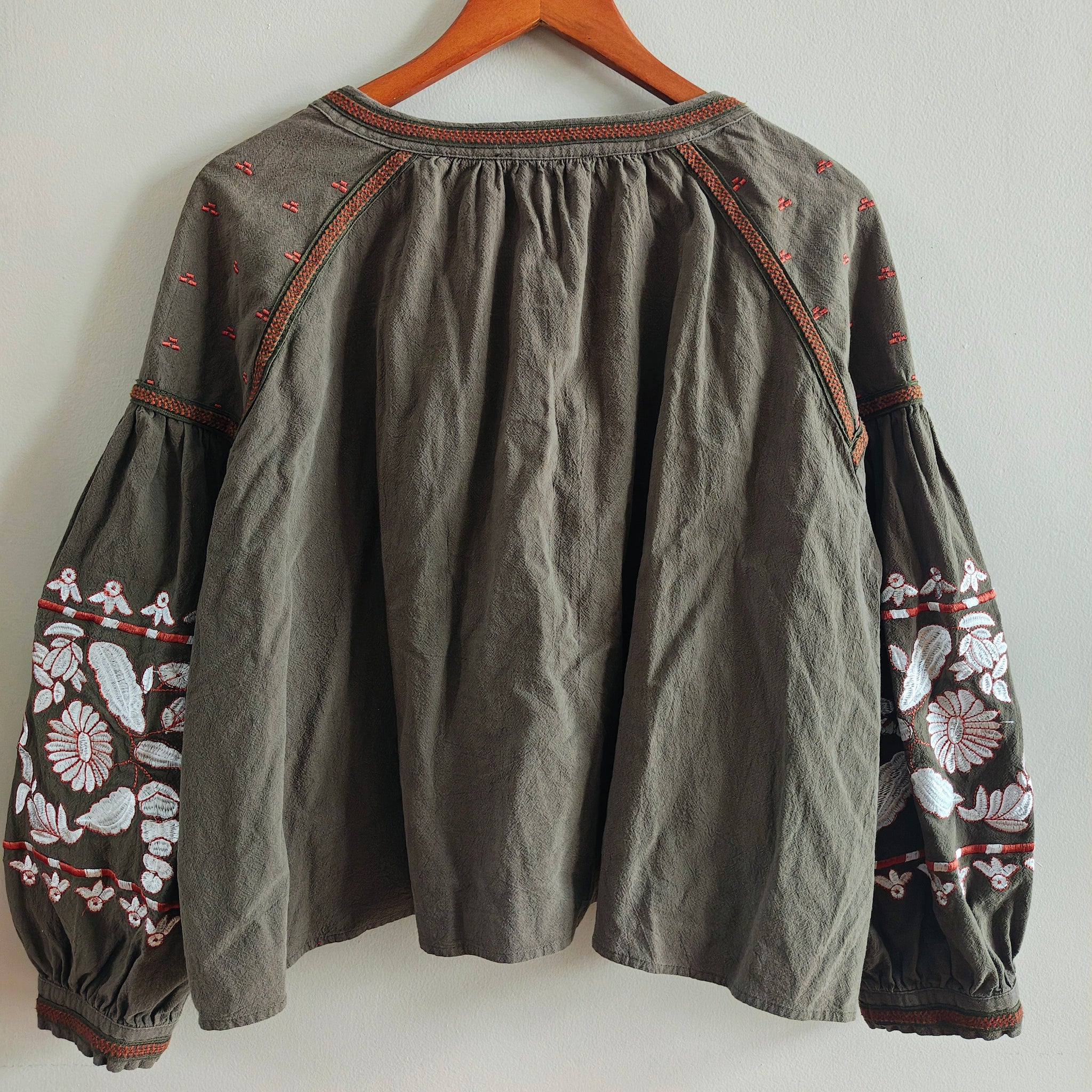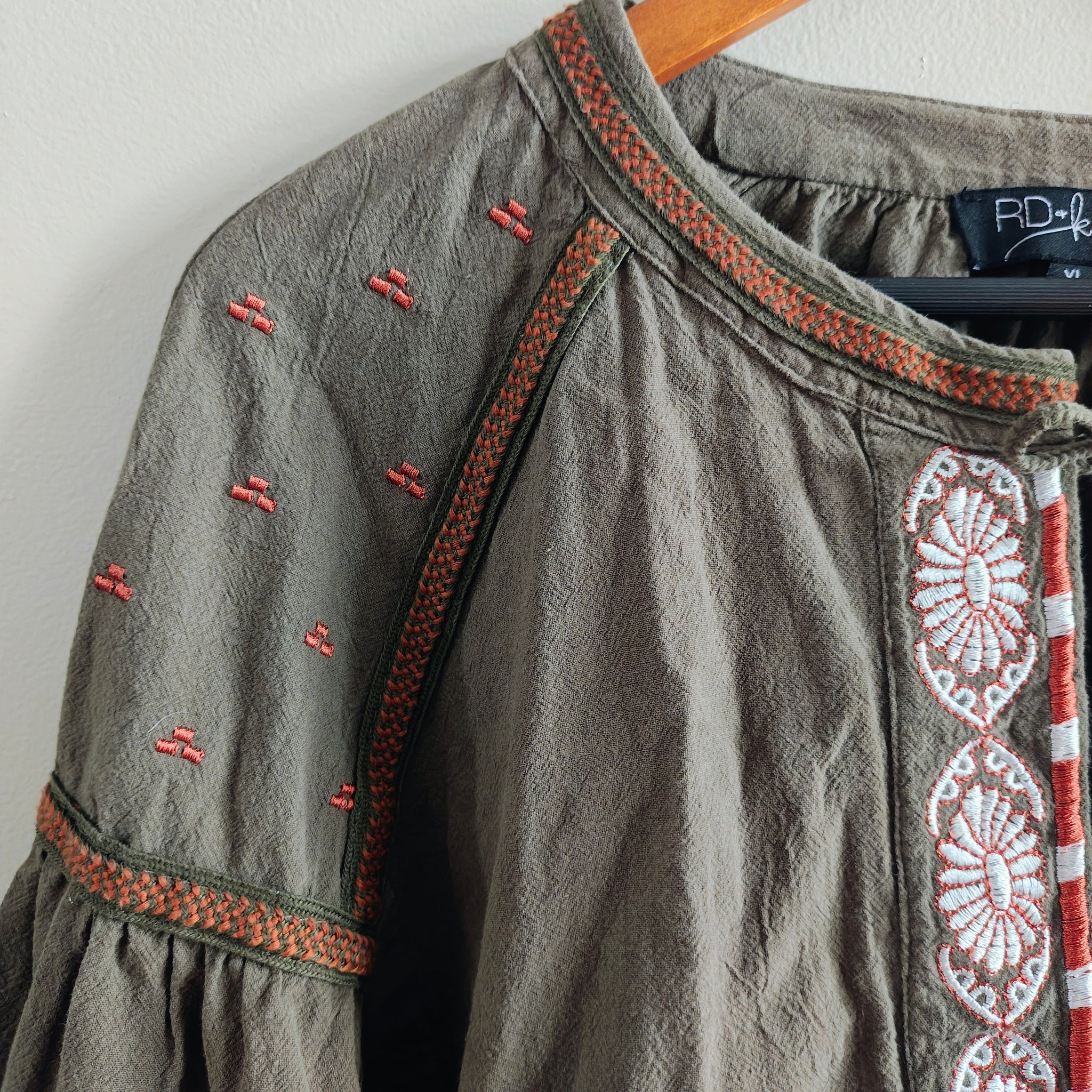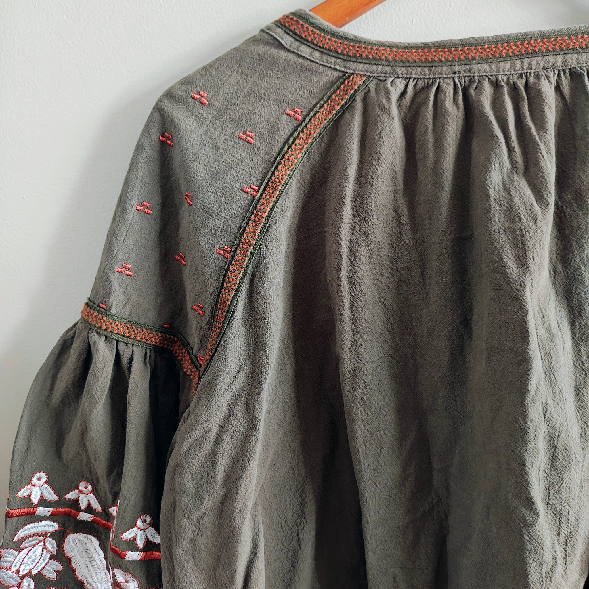 Color: Olive green base with white, orange, and red embroidery accents
