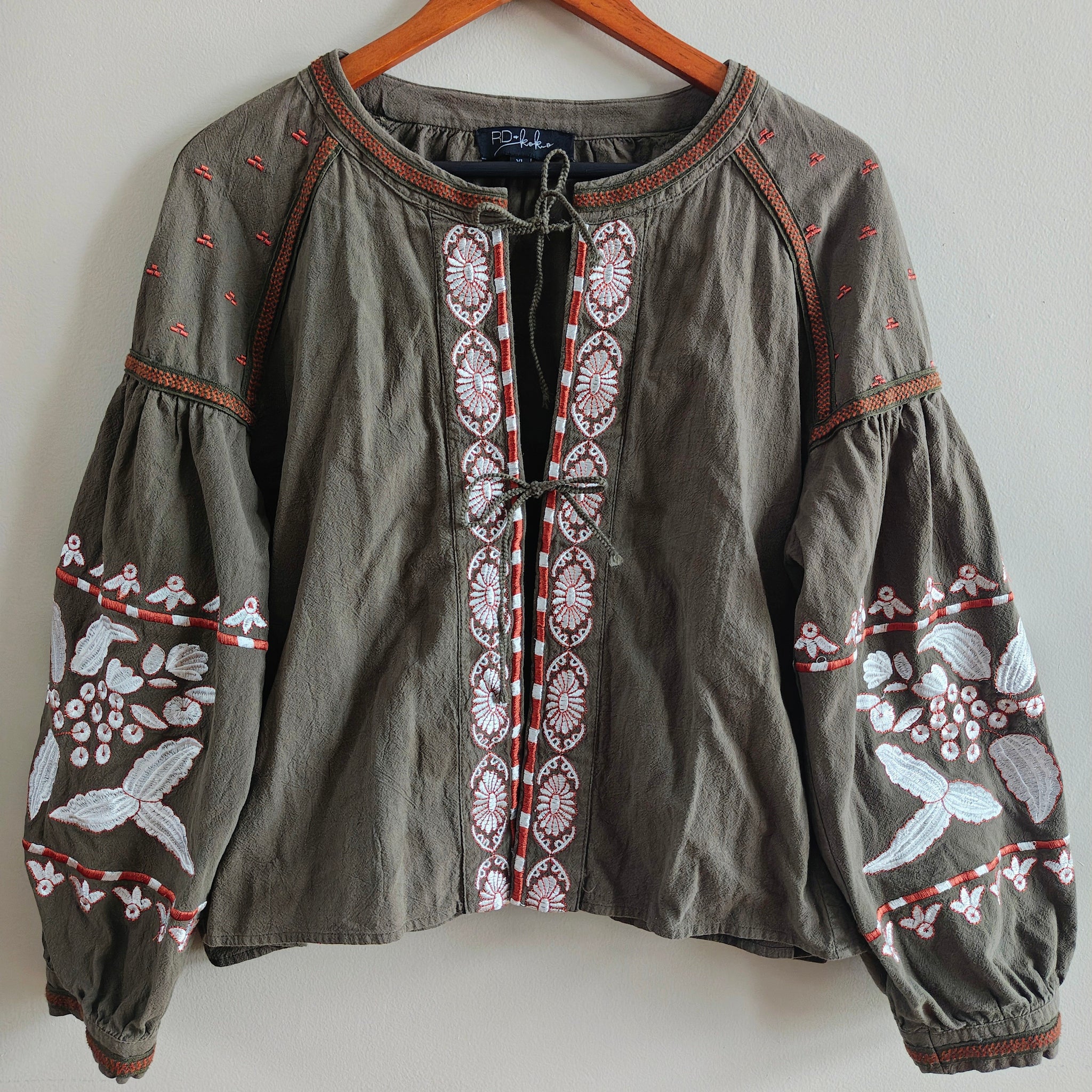 RD + Kokio embroidered boho top/jacket. The piece was sold by Anthropologie and features puff sleeves, a tie front closure, side pockets, and intricate floral and geometric embroidery.