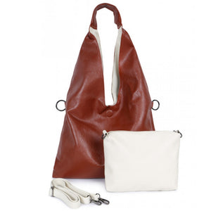 Classic hobo bag with detachable shoulder strap and matching cosmetic bag. Completely reversible so it's like getting two bags in one! Double sided magnetic closure.