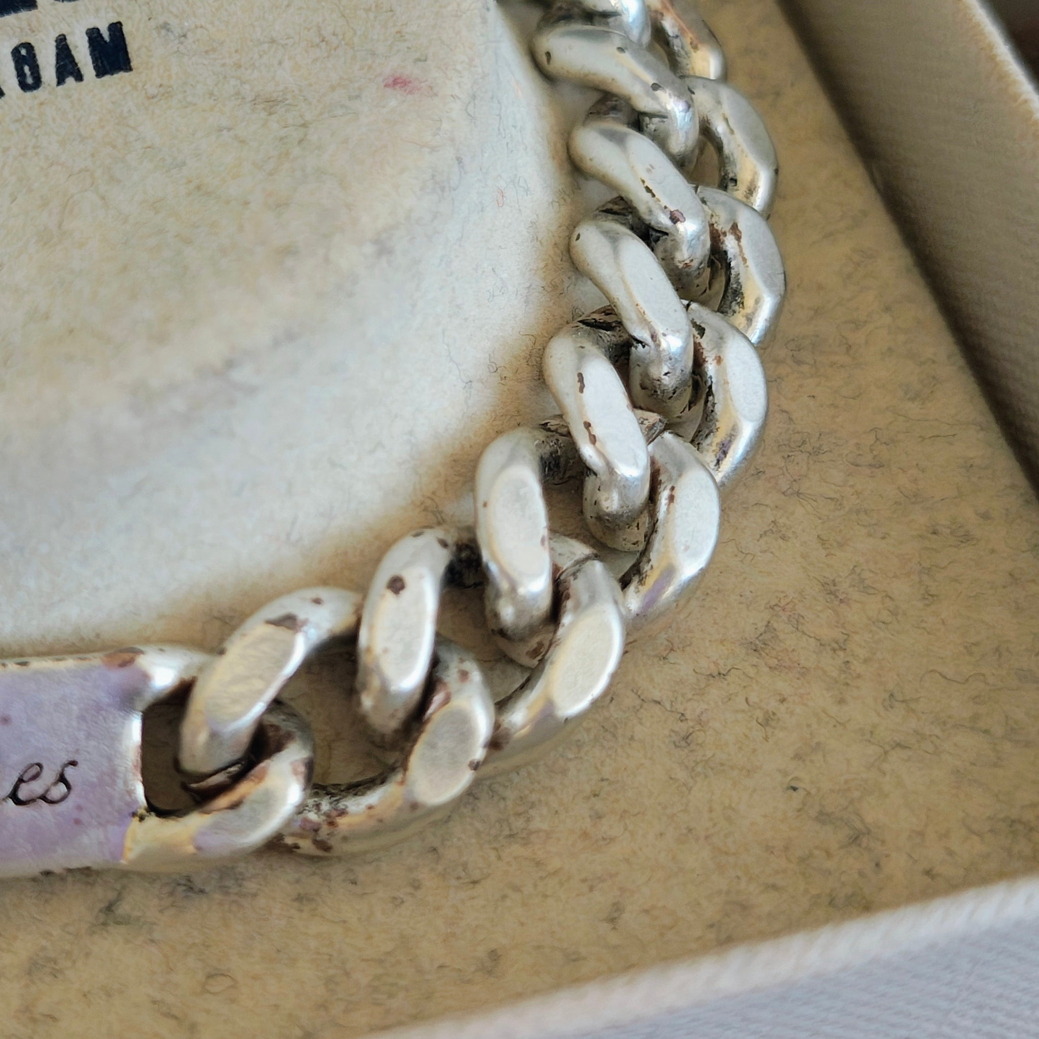 This handsome link bracelet from R.T. James features logo detail and is available in silver-tone. Bracelet has what appears to be tarnish, giving it a very vintage look.