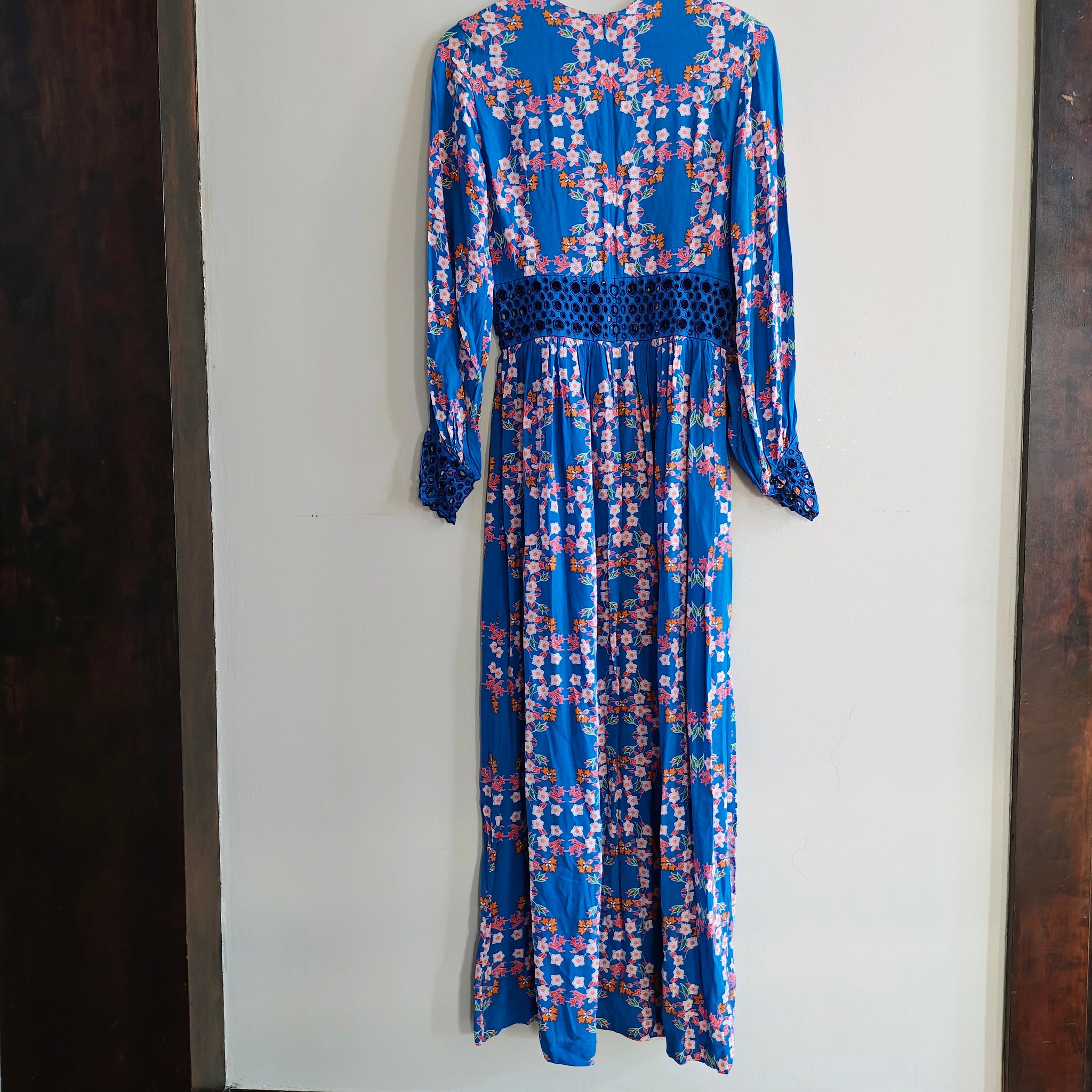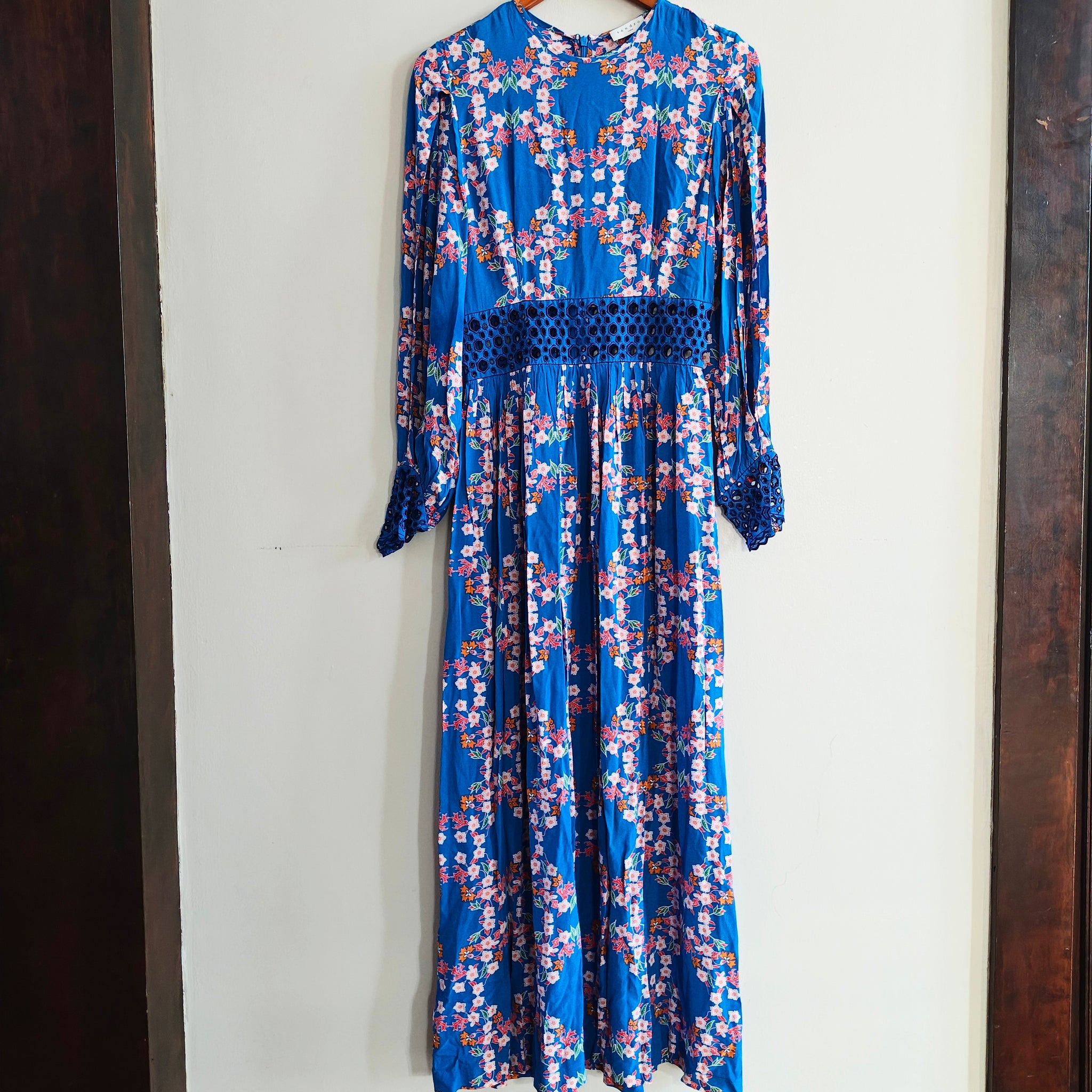 Design: Features a round neck, long slit bishop sleeves with eyelet-lace cuffs, and an empire waist with a contrasting dark blue eyelet-lace band. It has a concealed back-zip closure and an A-line maxi silhouette.