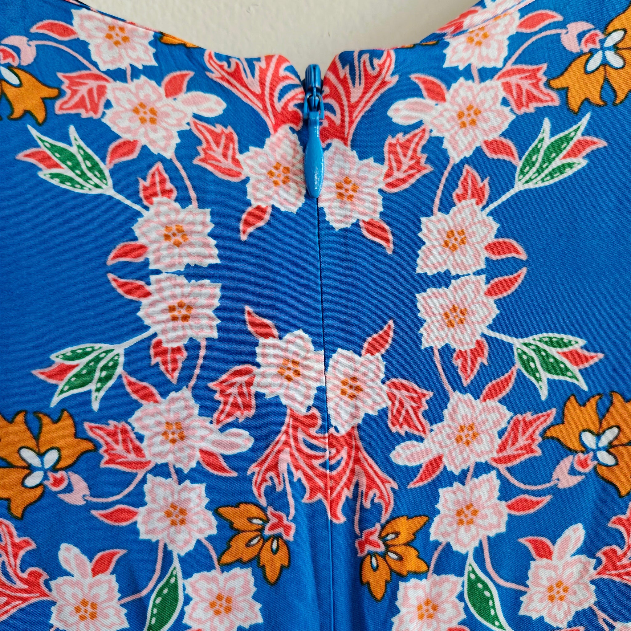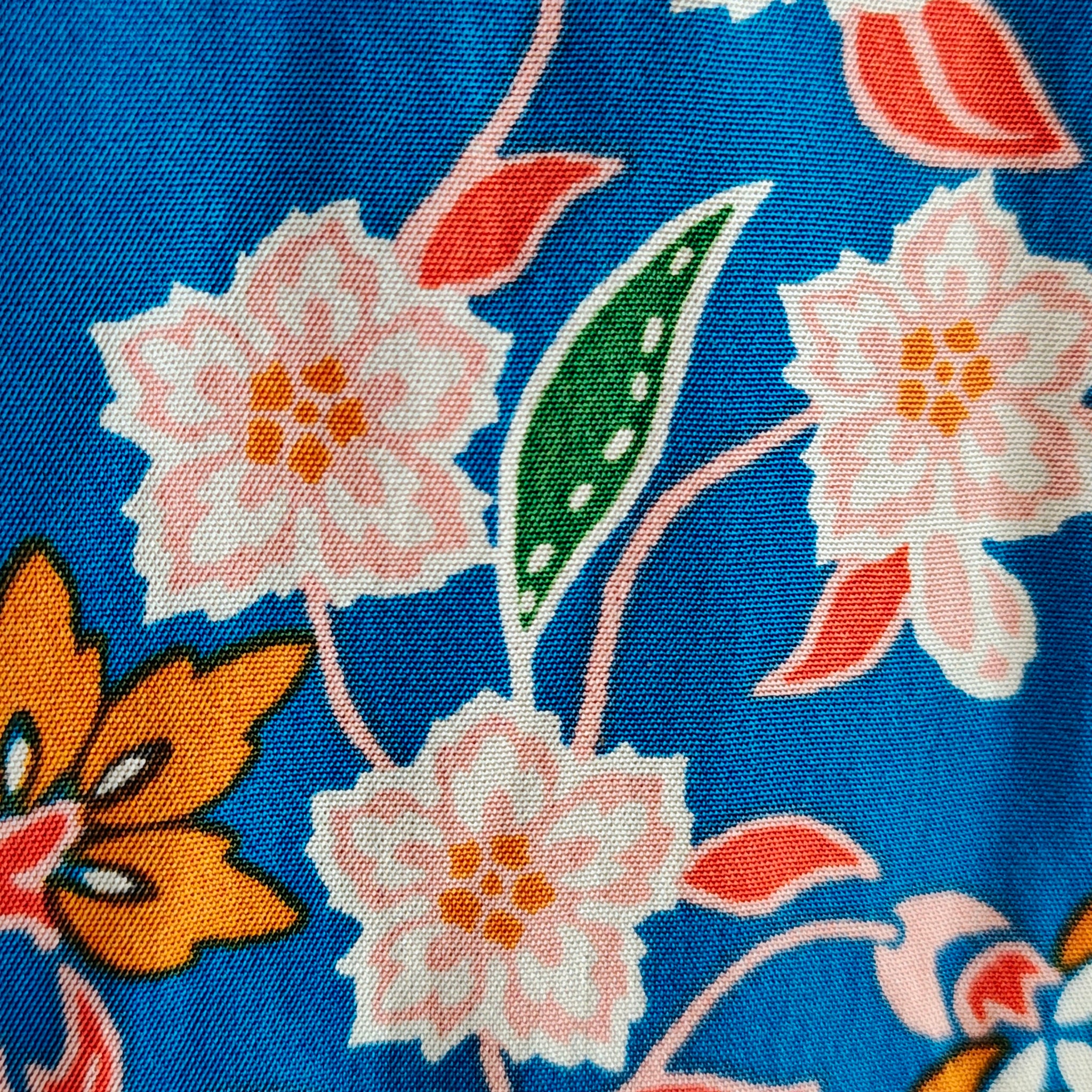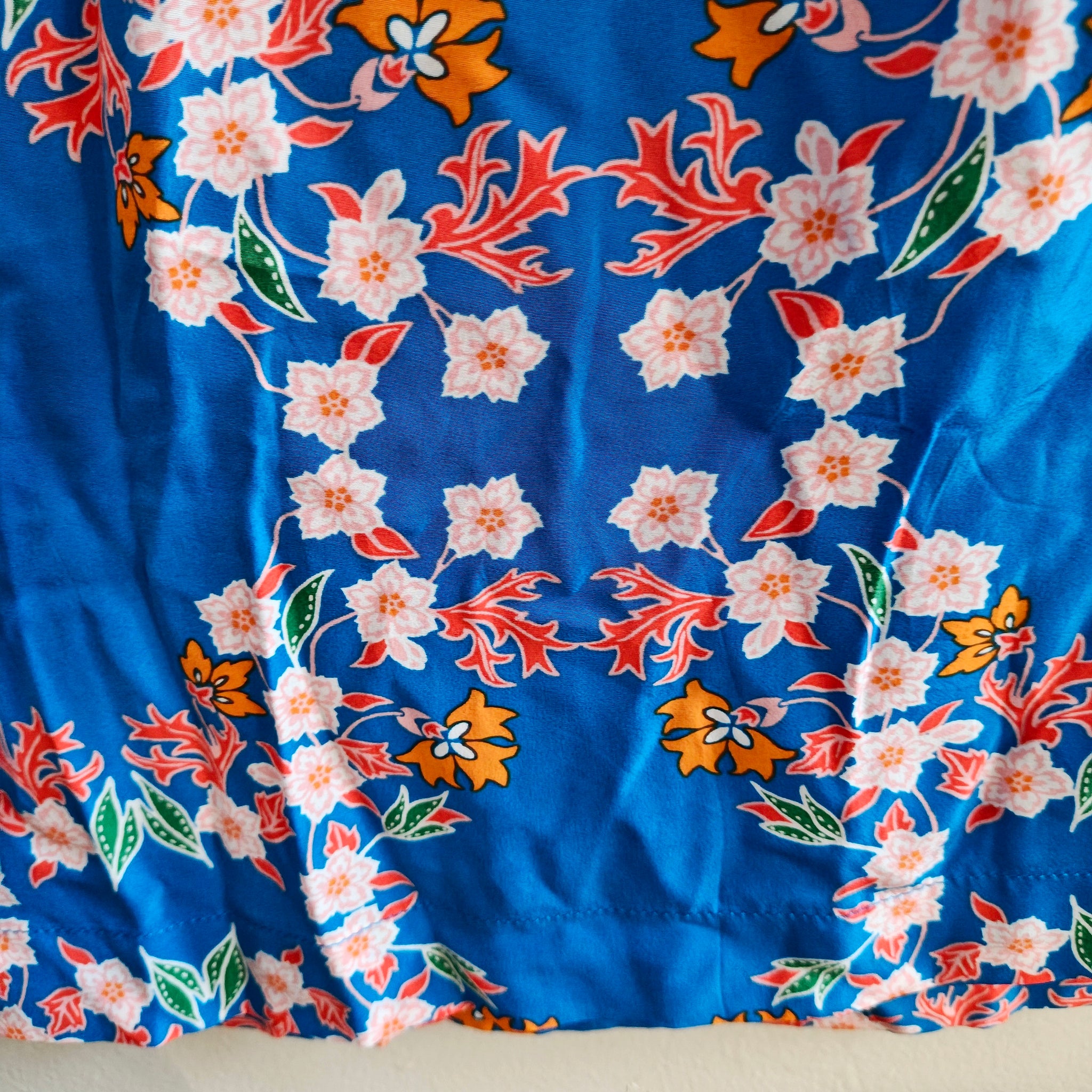 Color: Blue with a floral print (pink, orange, and white flowers)