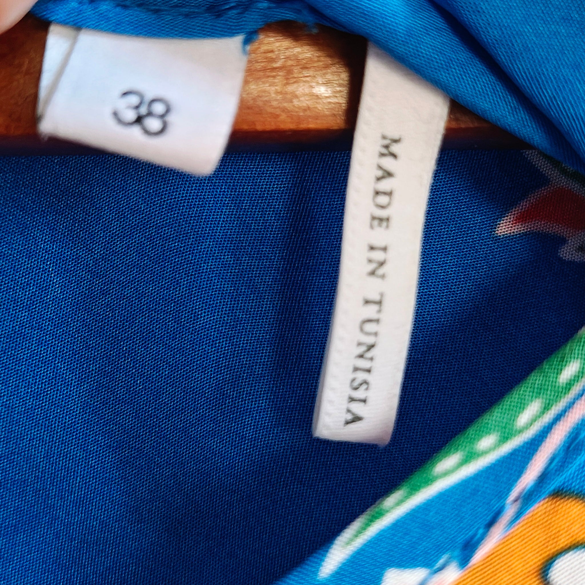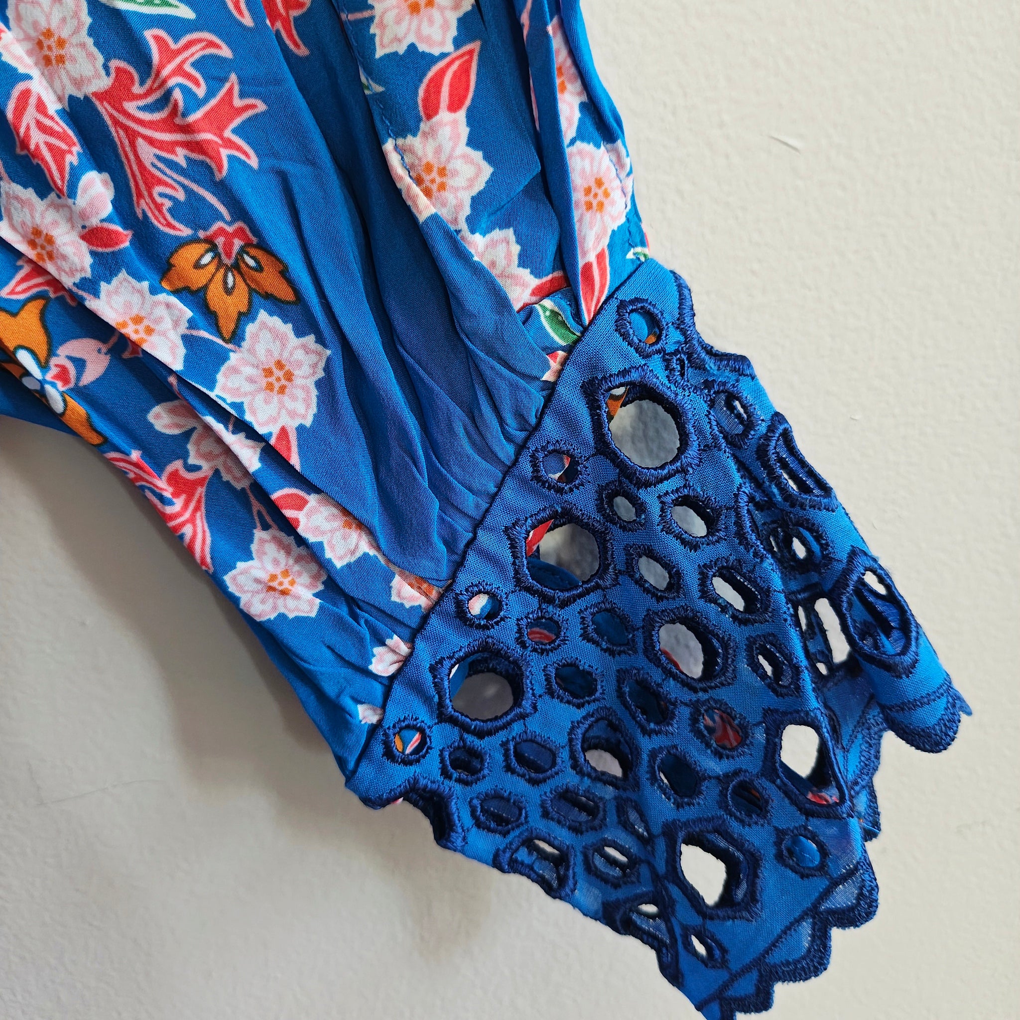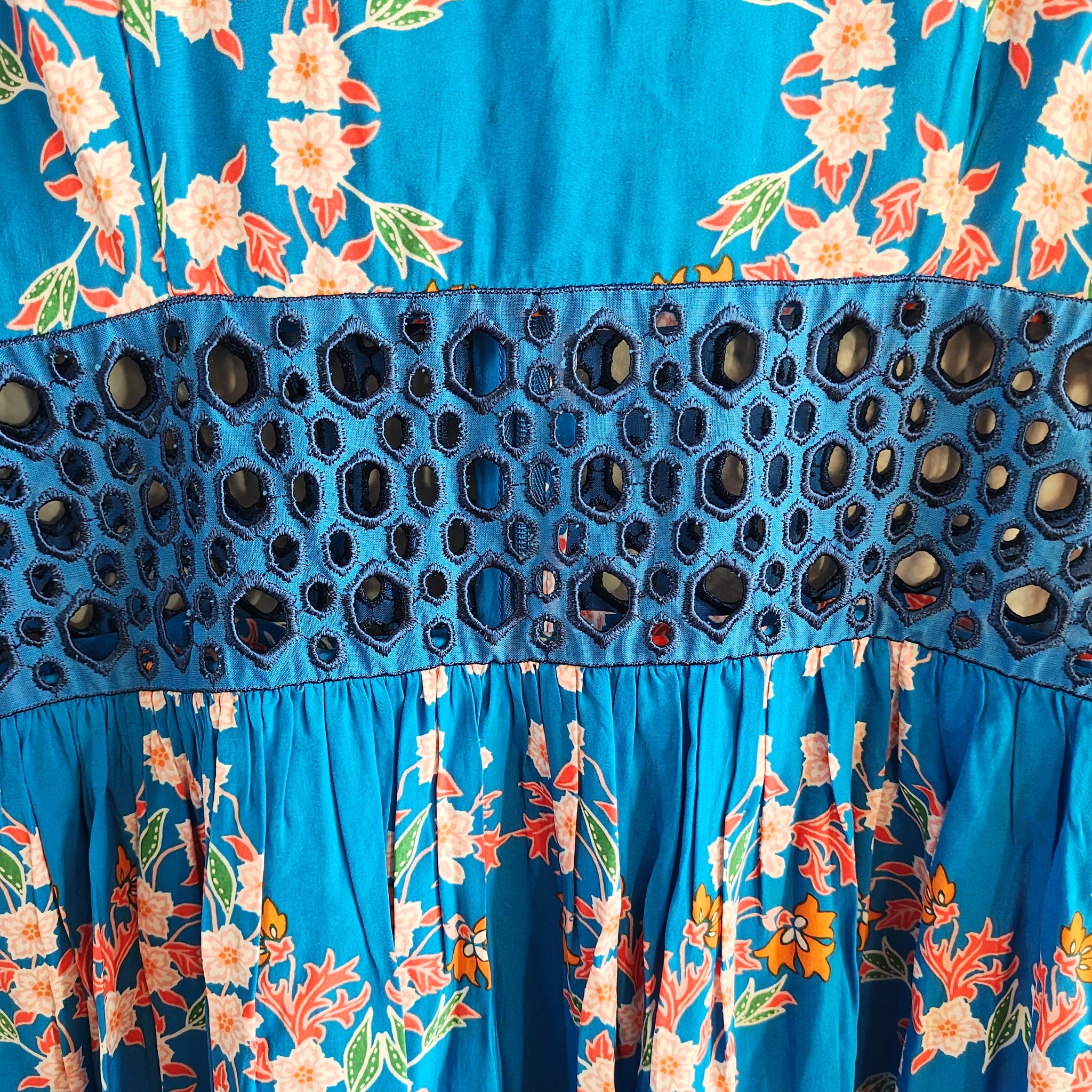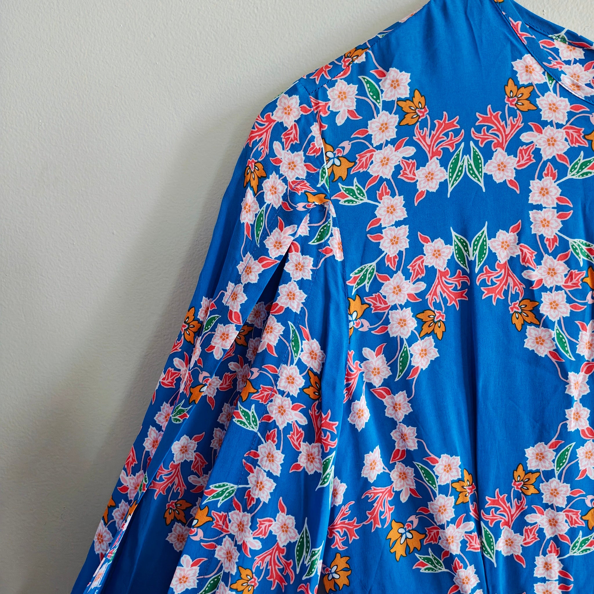 Color: Blue with a floral print (pink, orange, and white flowers)