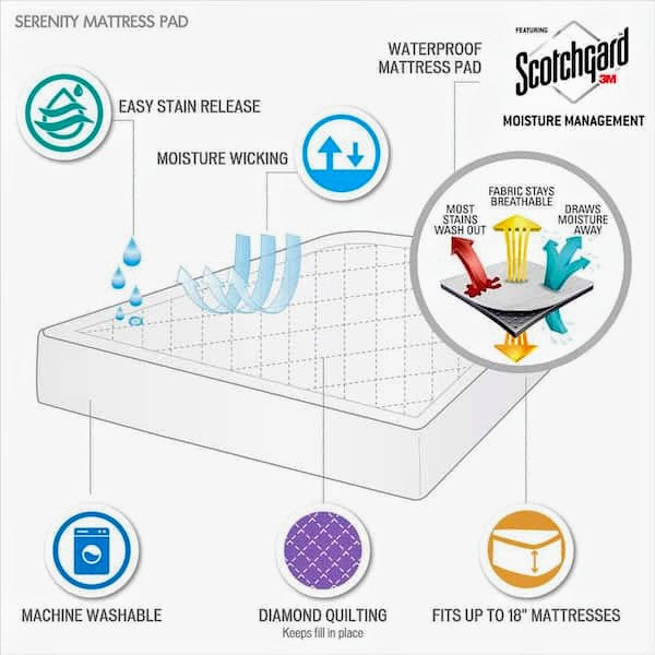 Sleep worry-free with this hypoallergenic mattress pad, offering the ultimate blend of comfort and protection. It features a 3M Scotchgard Moisture Management Treatment that wicks away moisture while helping release stains. The knit deep pocket skirt stretches to fit up to an 18" mattress. Machine washable for easy care. This mattress pad is also OEKO-TEX certified, meaning it does not contain any harmful substances or chemicals, ensuring quality comfort and wellness.