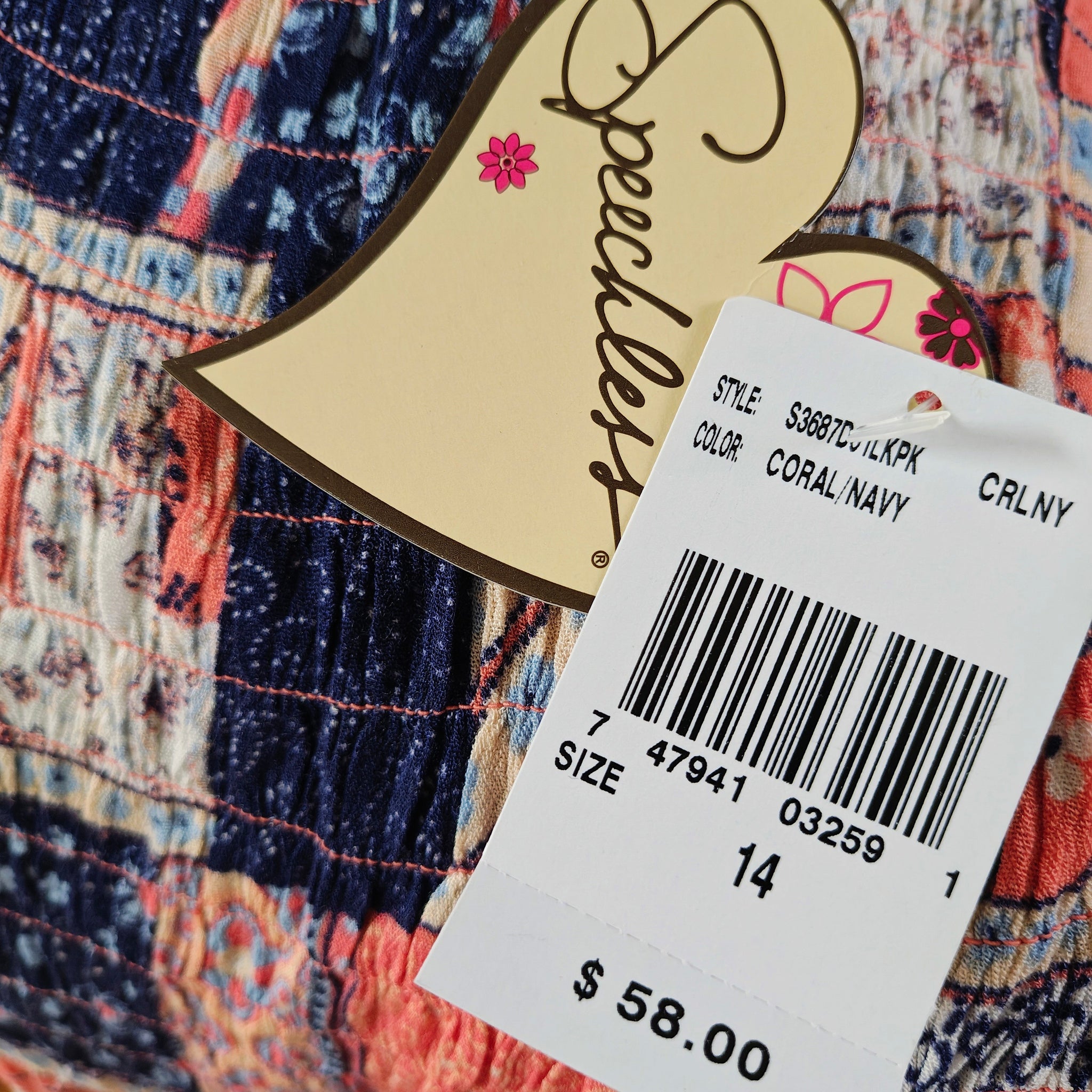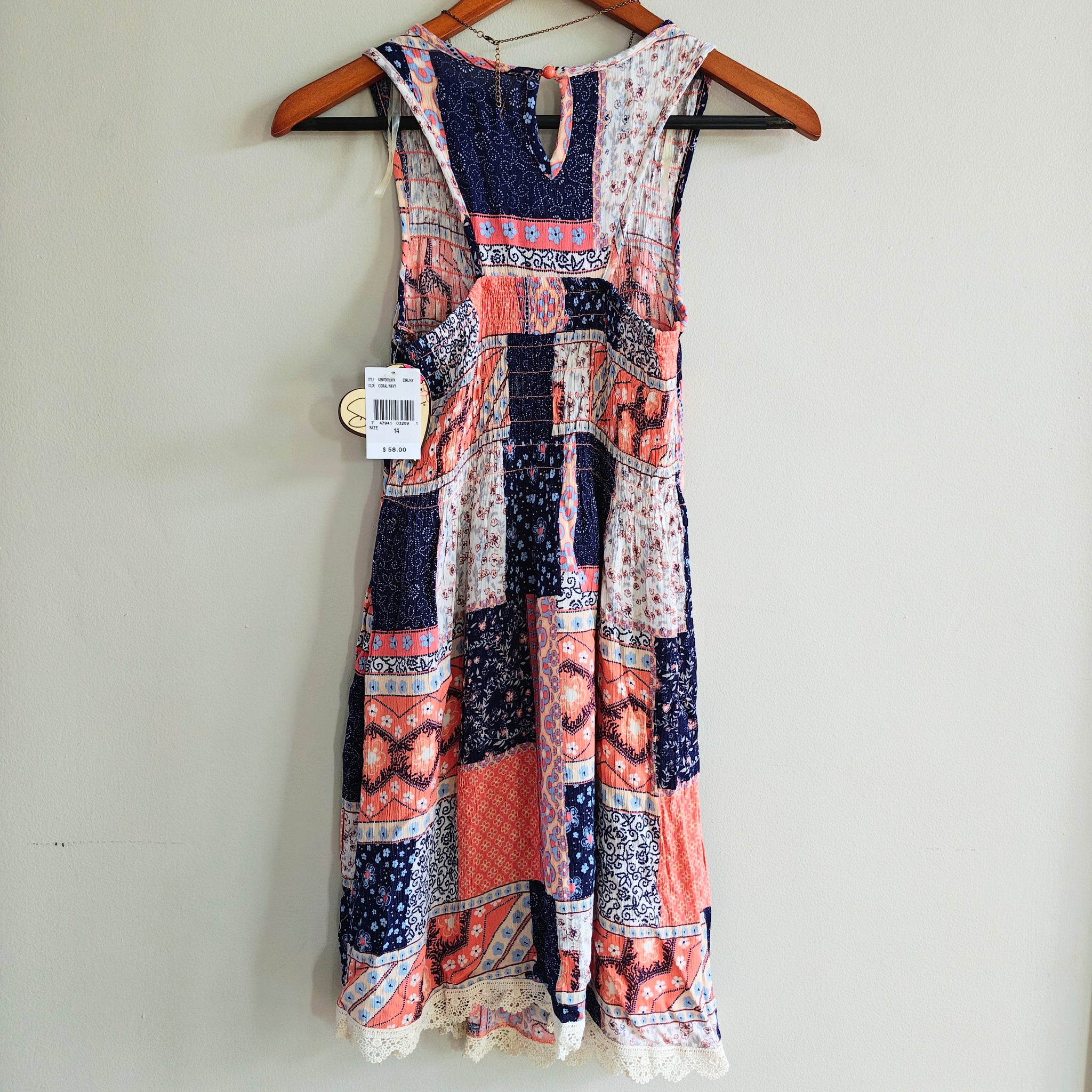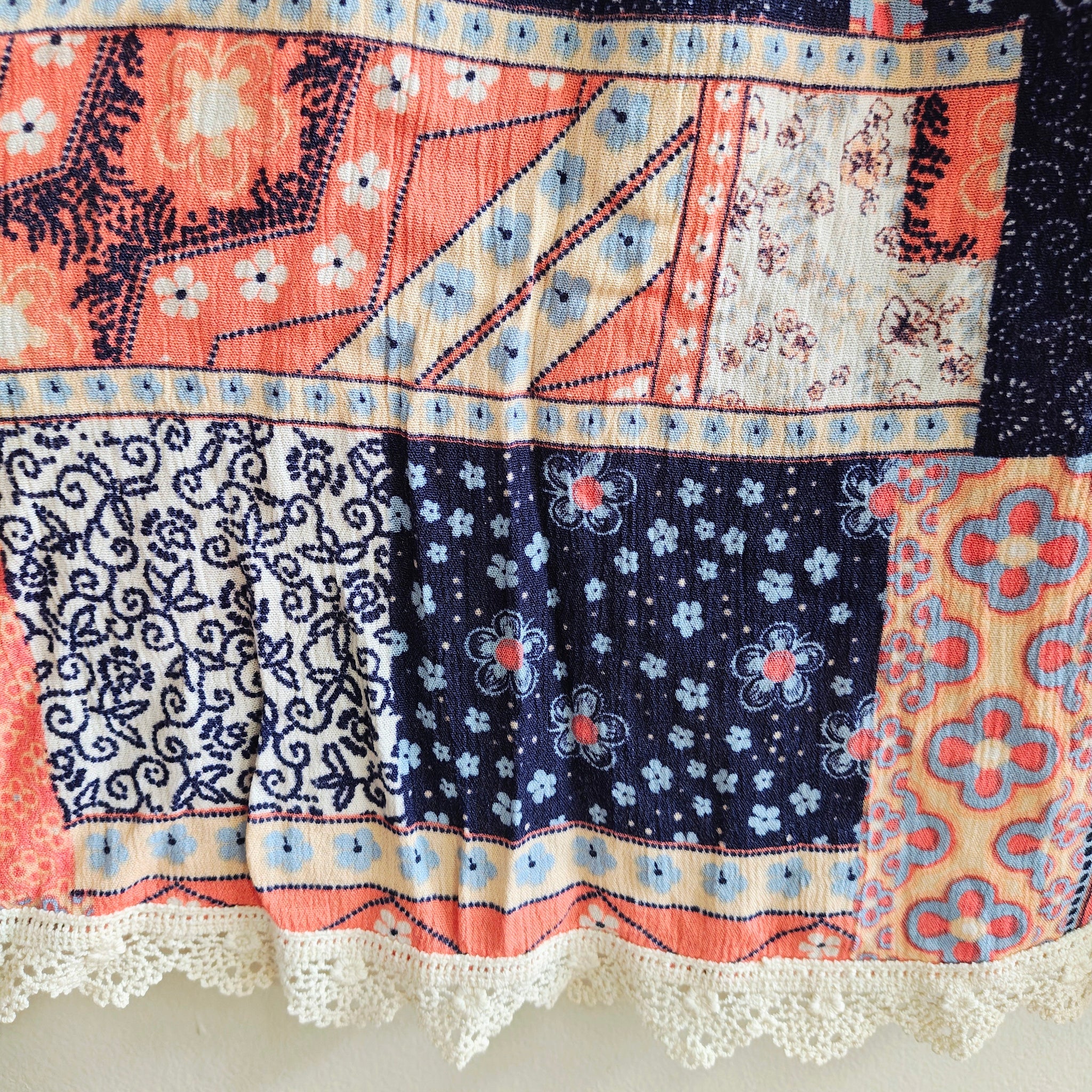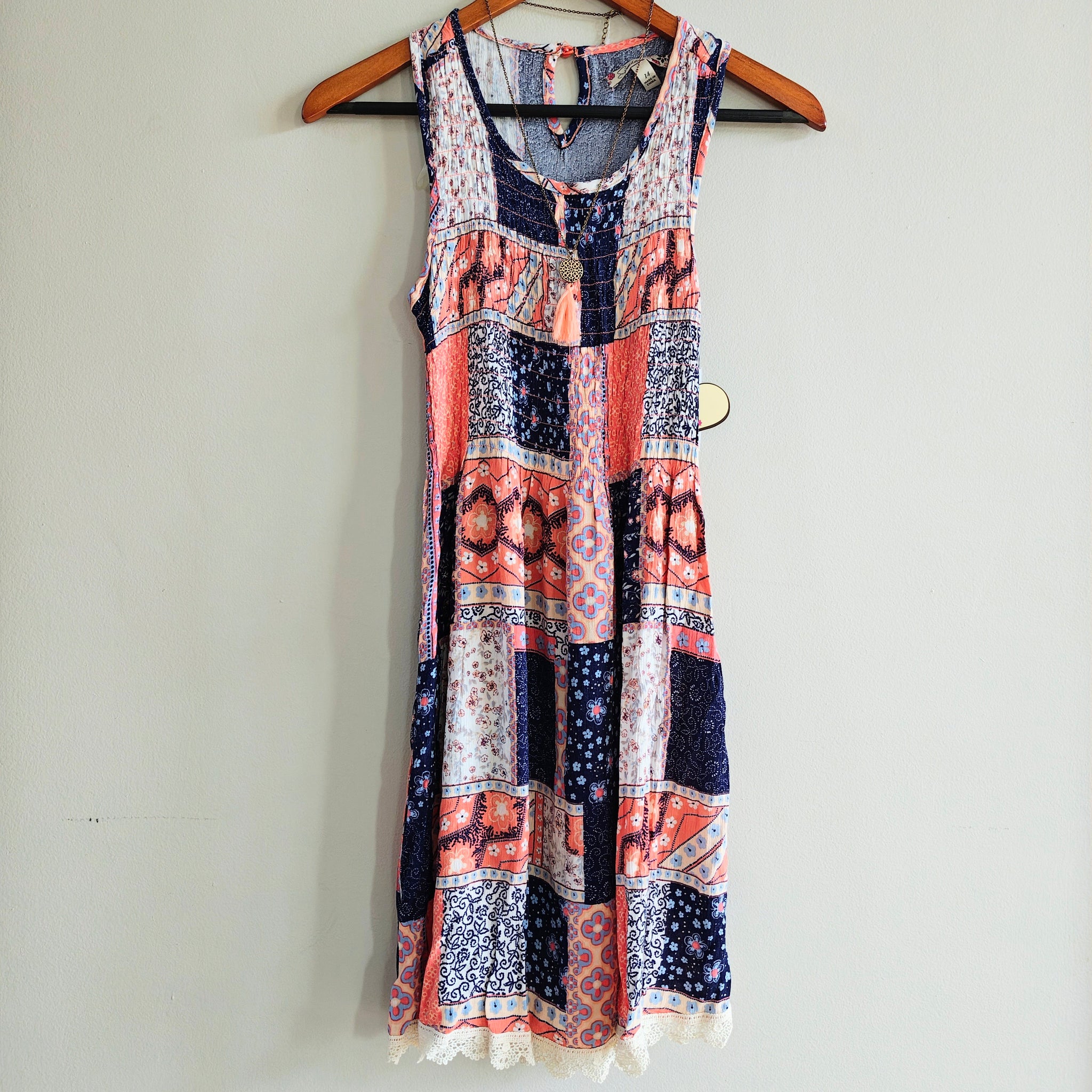 This dress is a sleeveless, bohemian-style sun dress defined by its eclectic patchwork print. The design features a mix of navy blue, coral orange, and white panels decorated with varying floral, paisley, and geometric patterns. Junior's sizing.