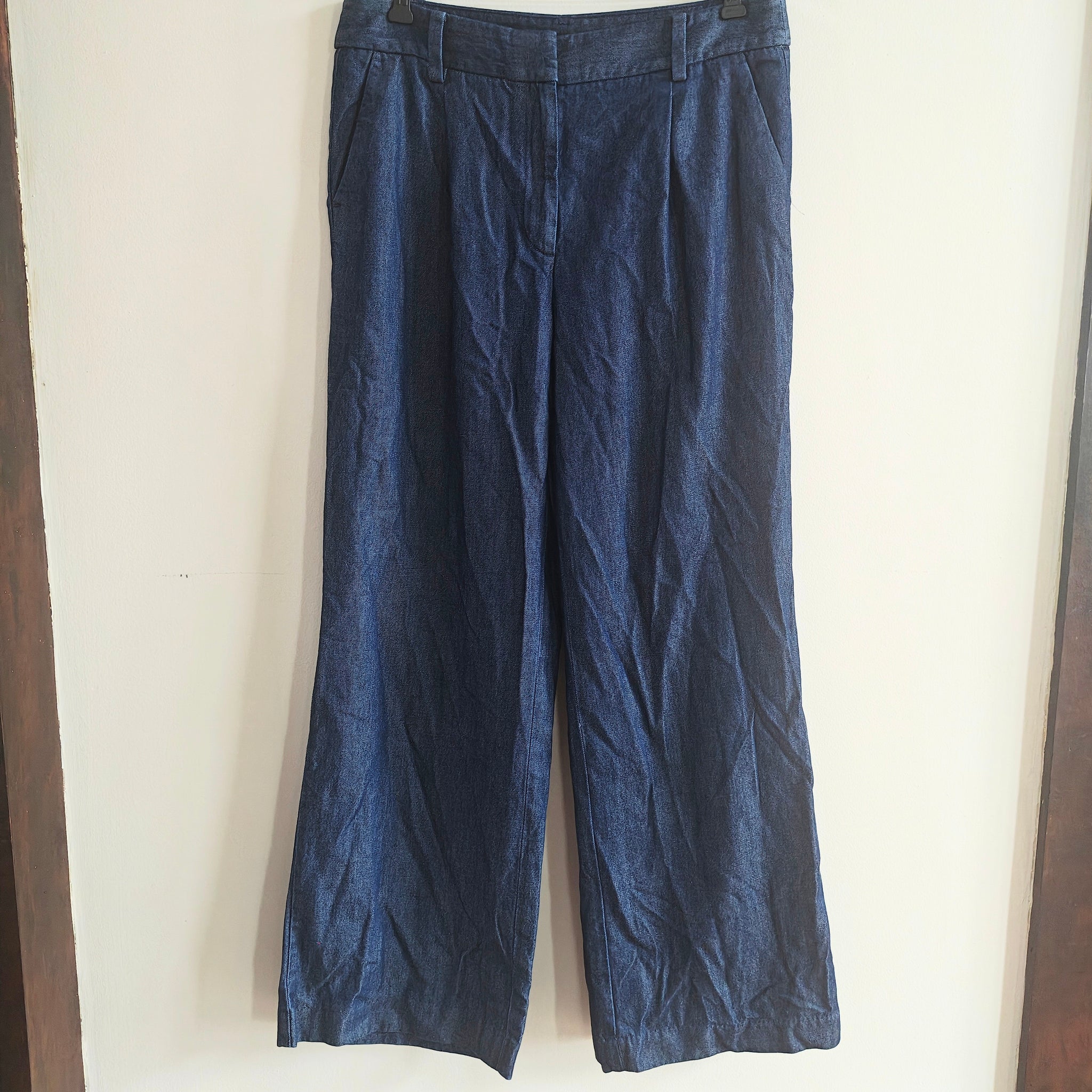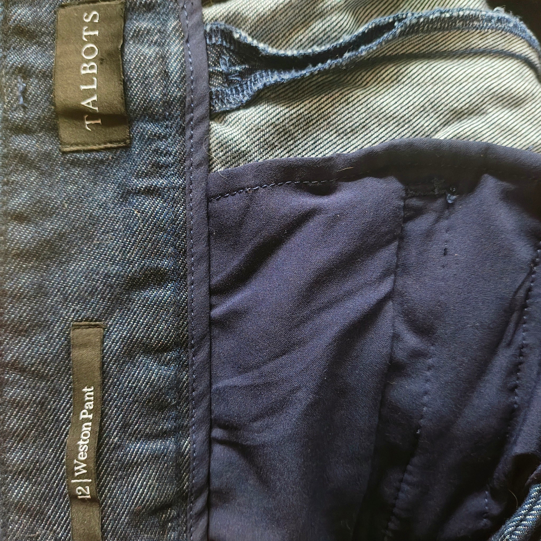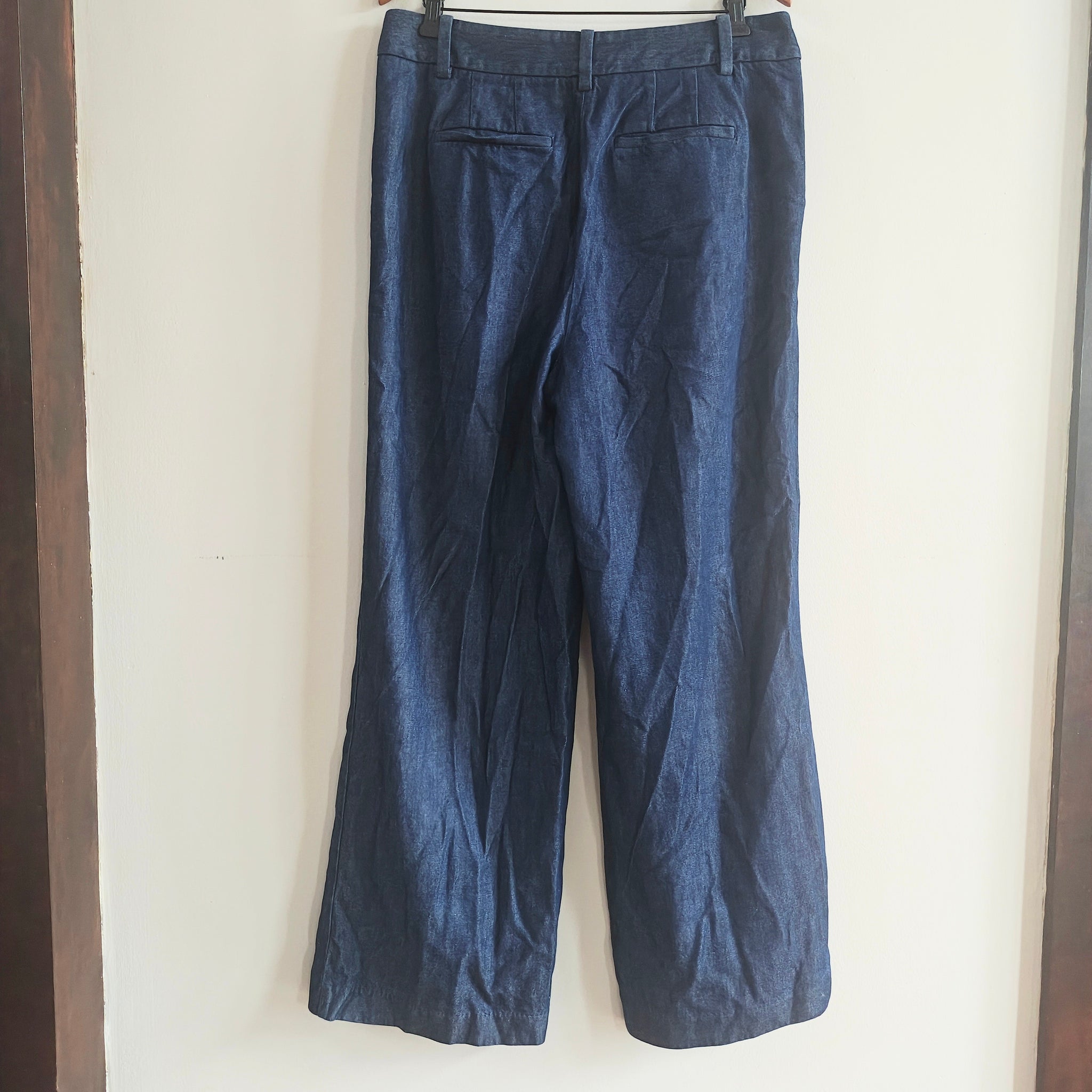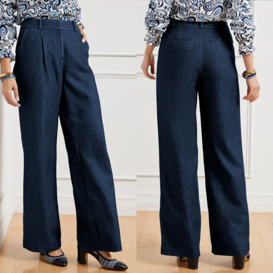 Talbots Weston wide leg pants in a dark blue, denim-look fabric. High-waist, full-length, wide-leg trouser style with pleats in the front and back welt pockets.
