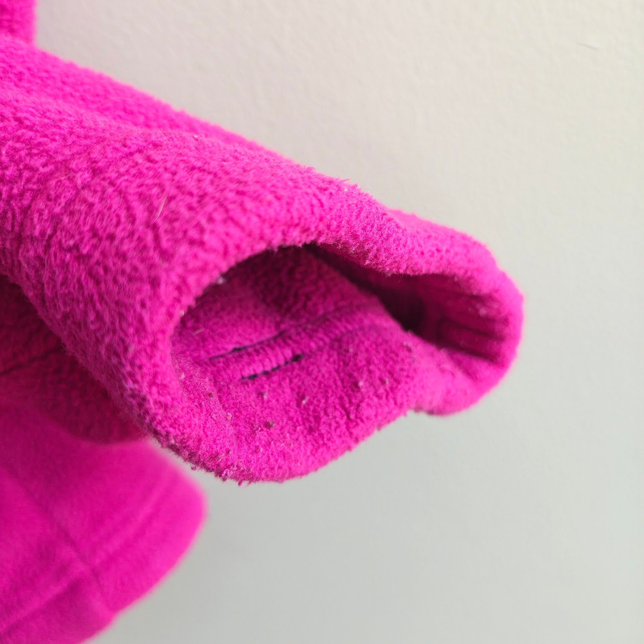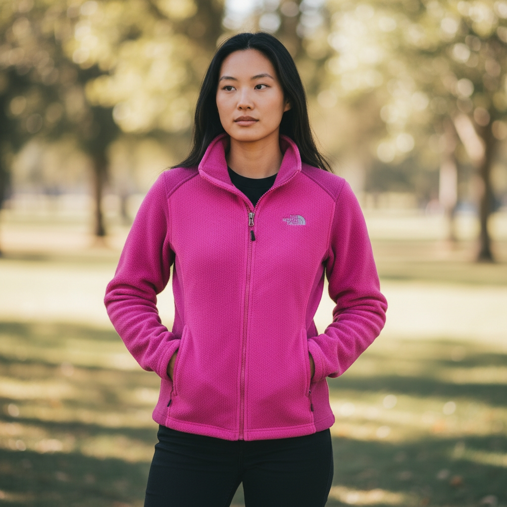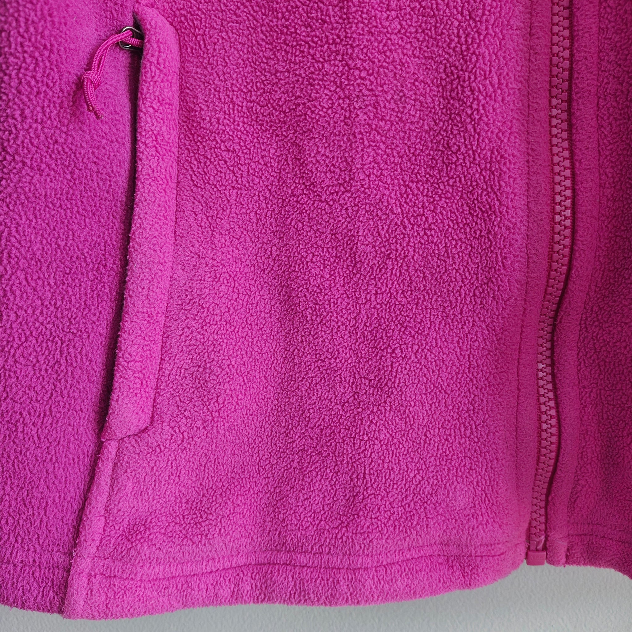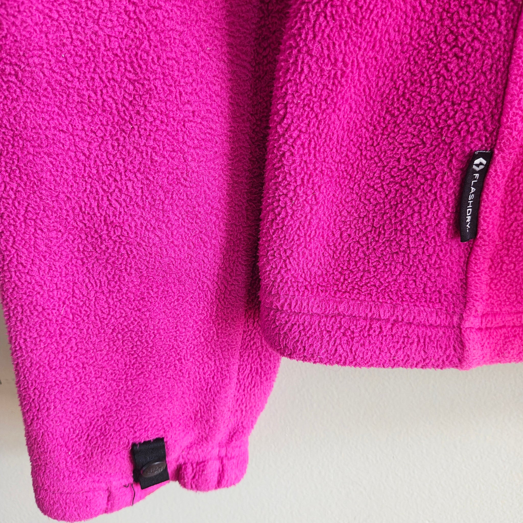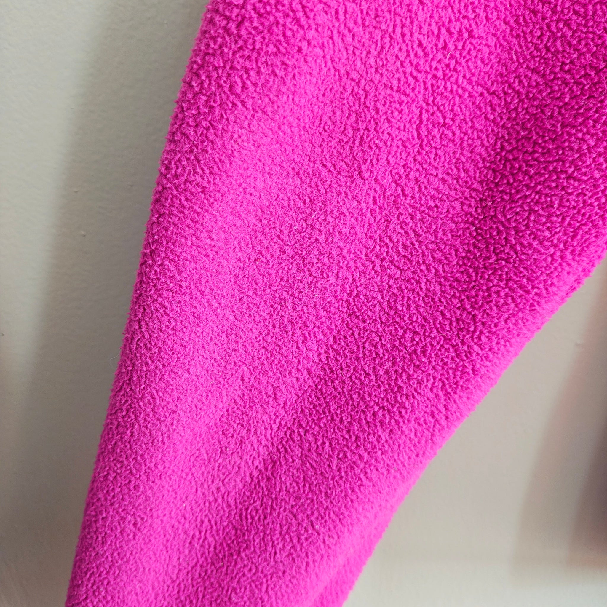 The North Face women's full-zip fleece jacket features a high collar, full-zip closure, and soft, fleece material in a fuchsia and magenta pink color.