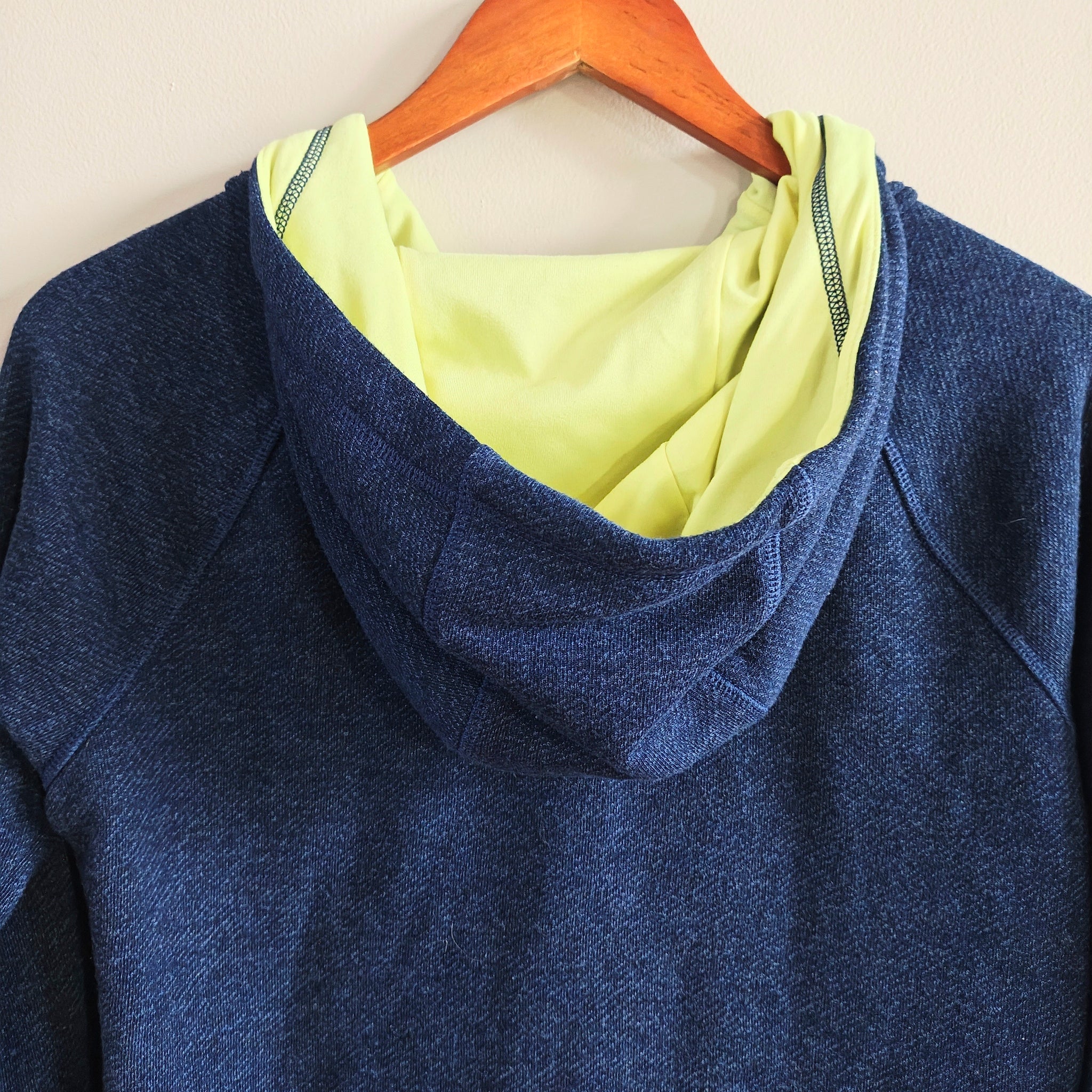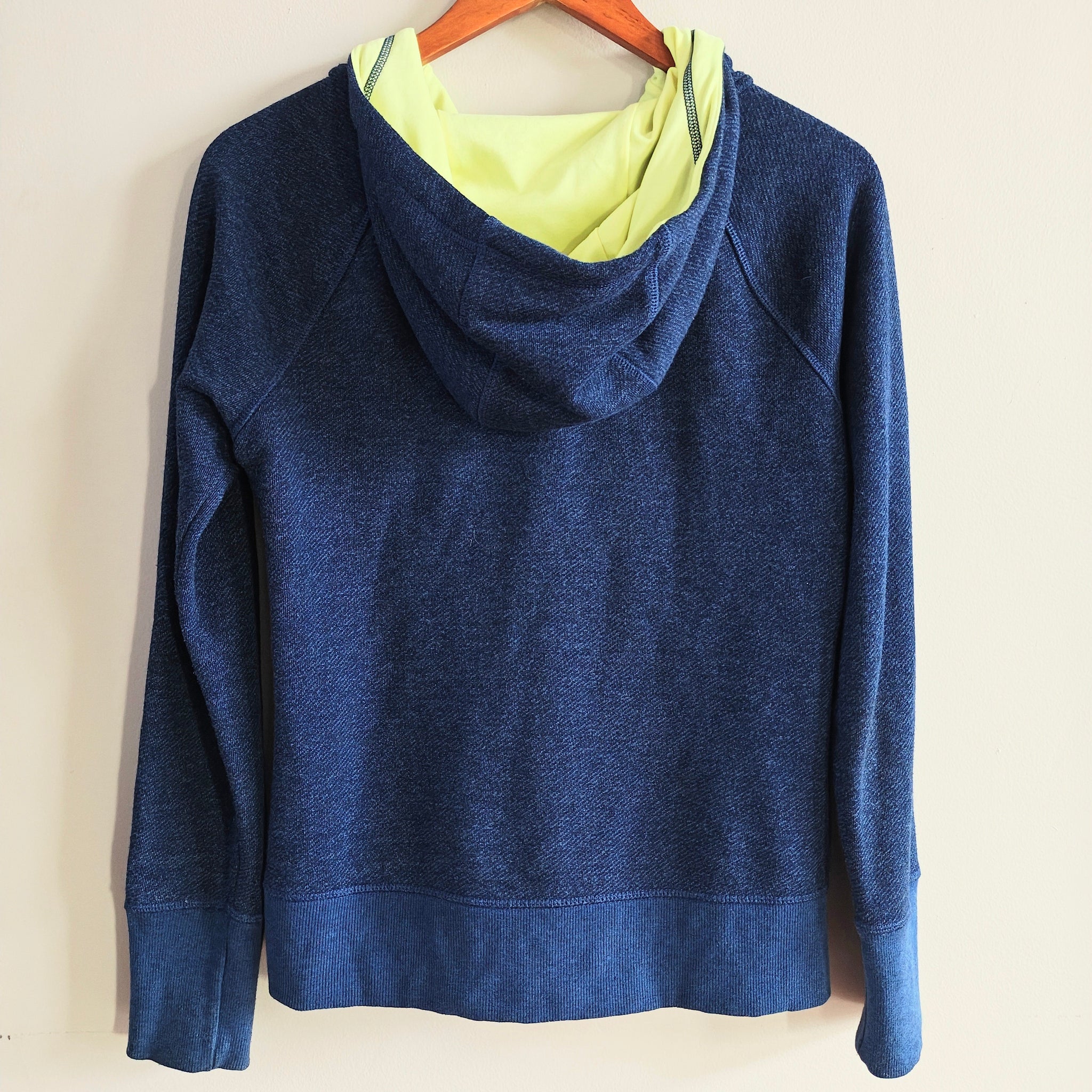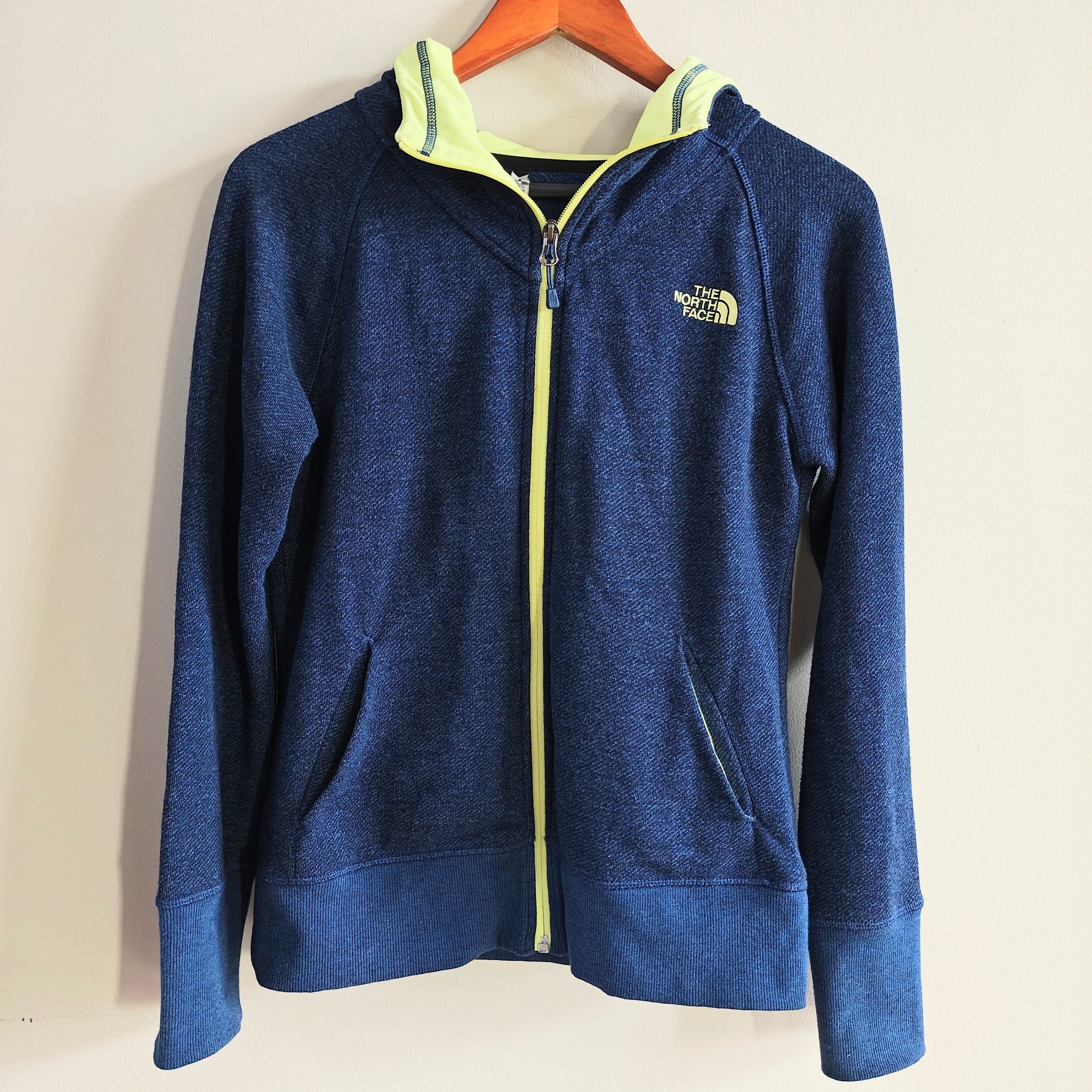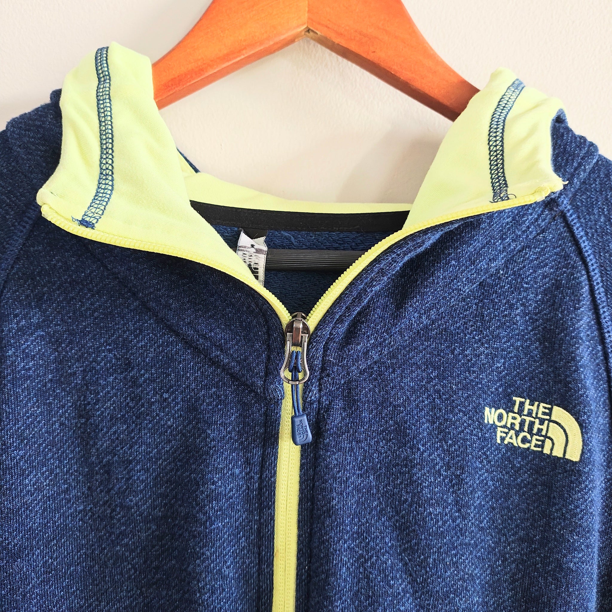 The North Face women's full zip hoodie with a navy blue body and bright yellow zipper and hood lining accents.