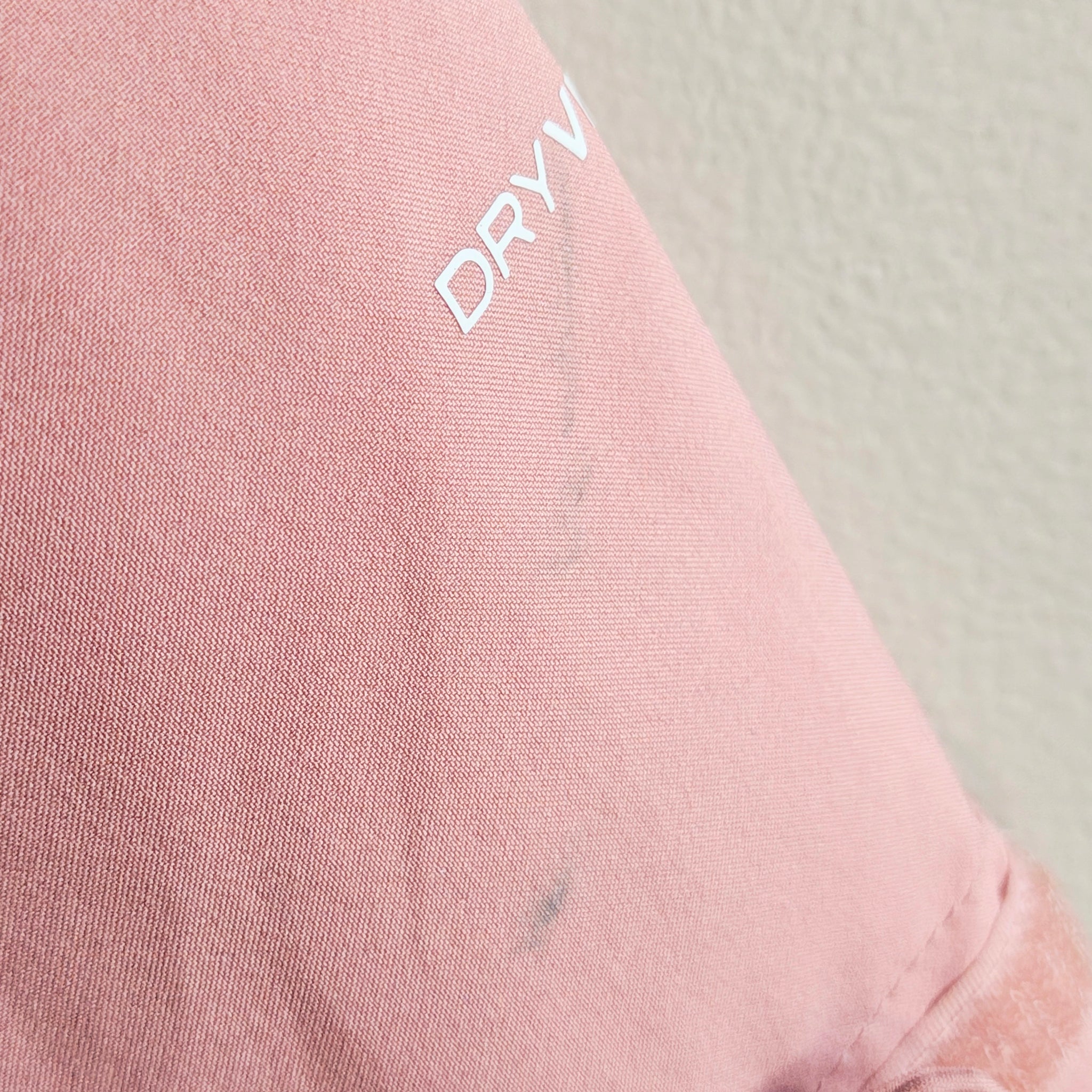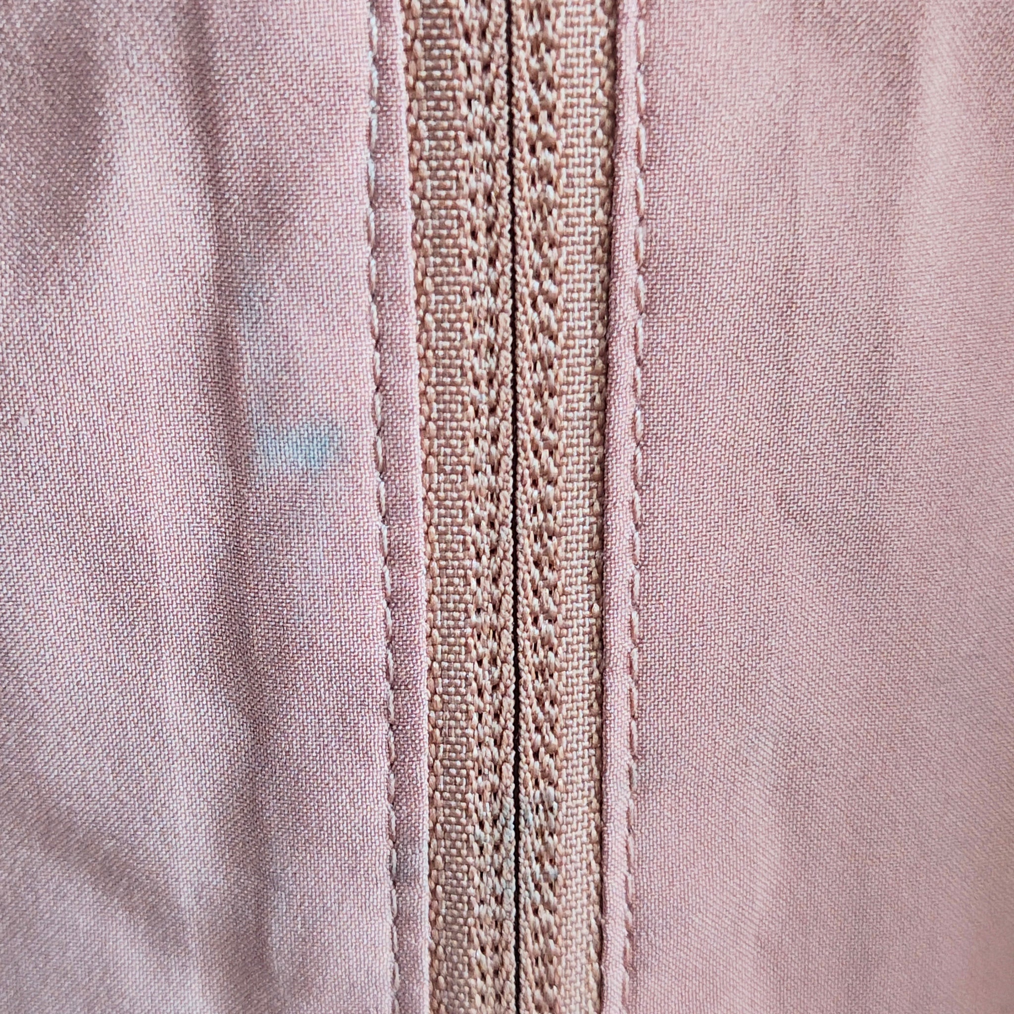 Jacket is pre-owned with no flaws. There are darker spots on the sleeve and a light spot on front by the zipper. The sleeve may not be a deep stain, but the front spot appears to be. It doesn't look like something a stain remover would take out. Please see photos.