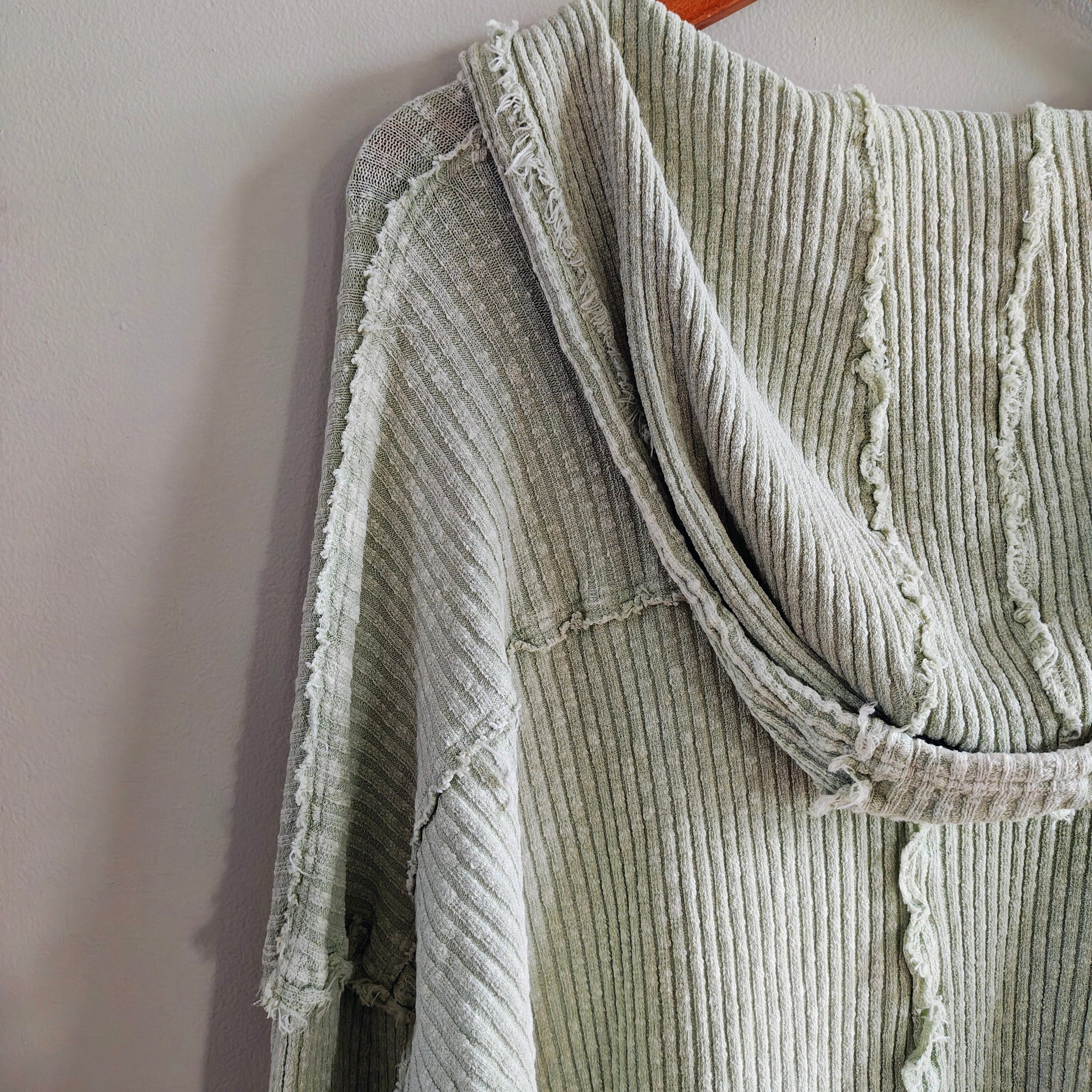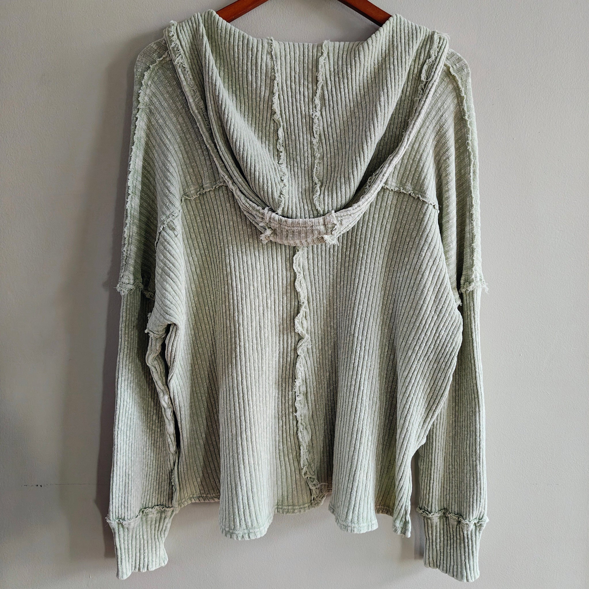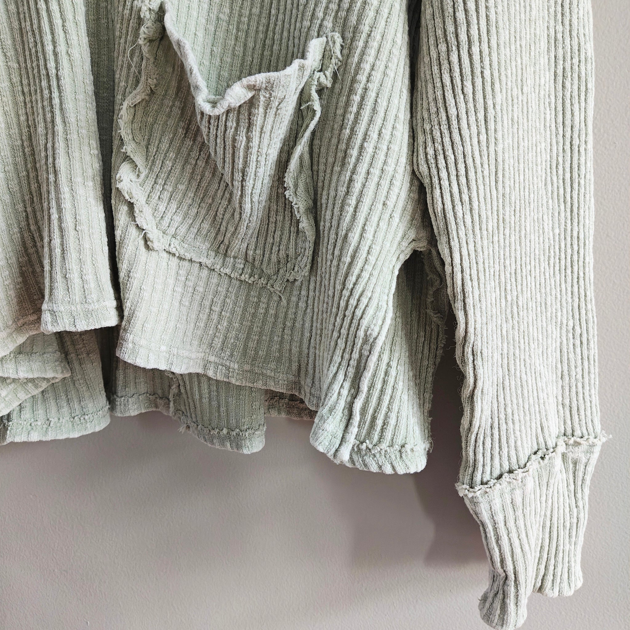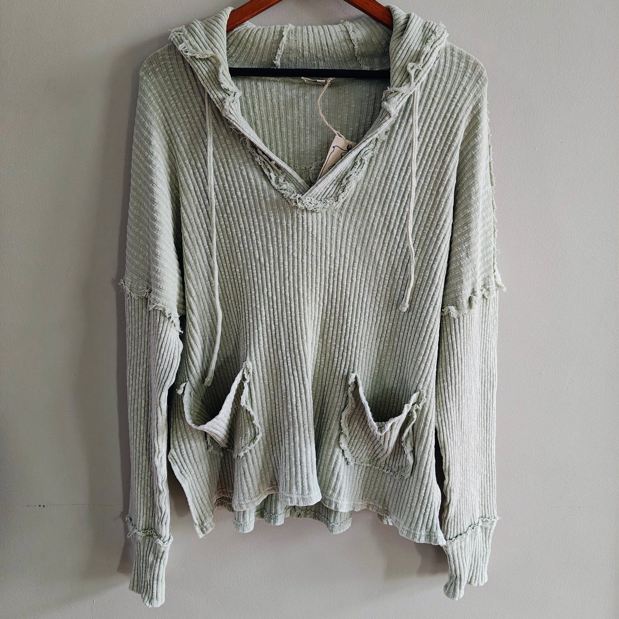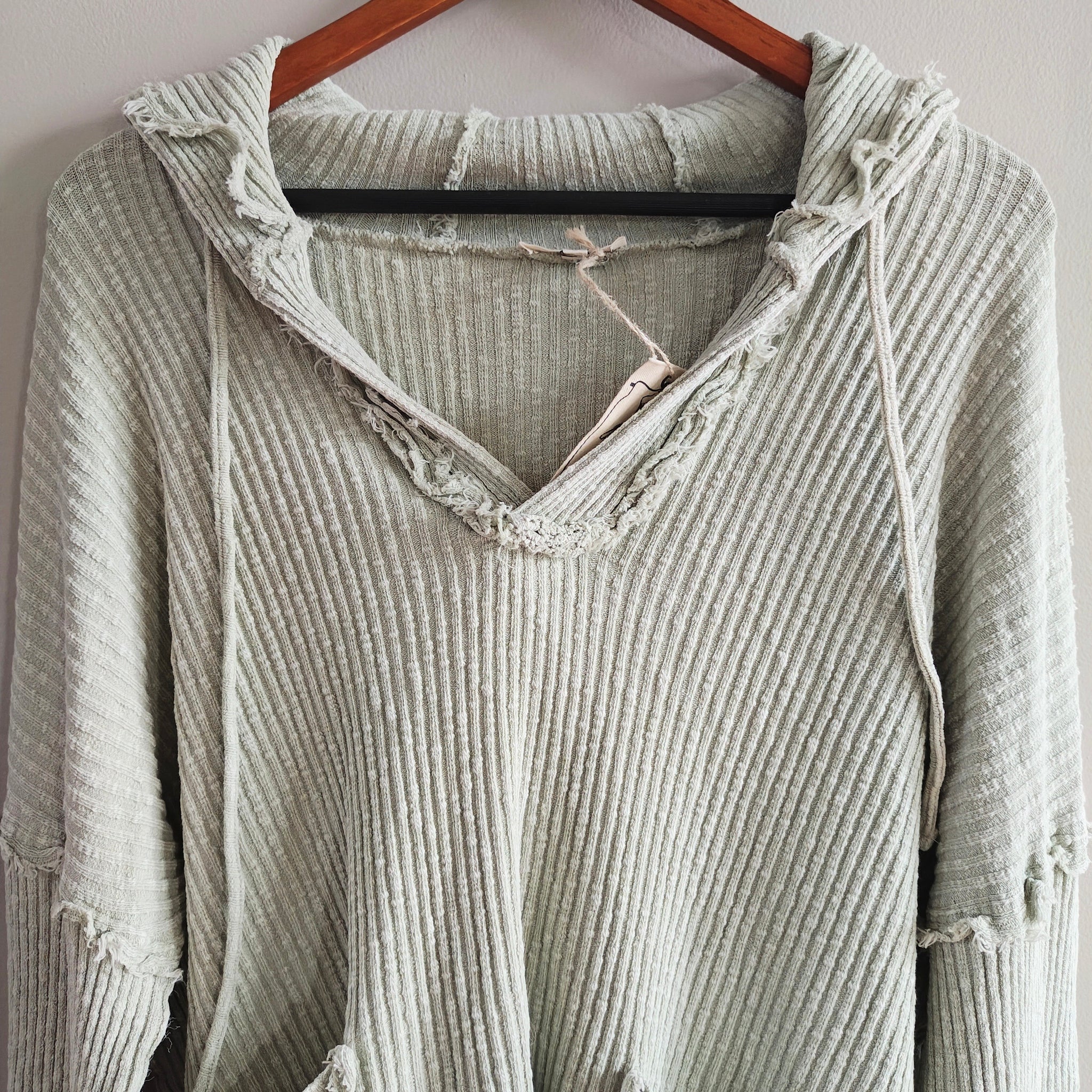 Oversized thermal knit hoodie/pullover with a V-neck and distressed raw-edge seams. It also features two front patch pockets and drawstrings for the hood.