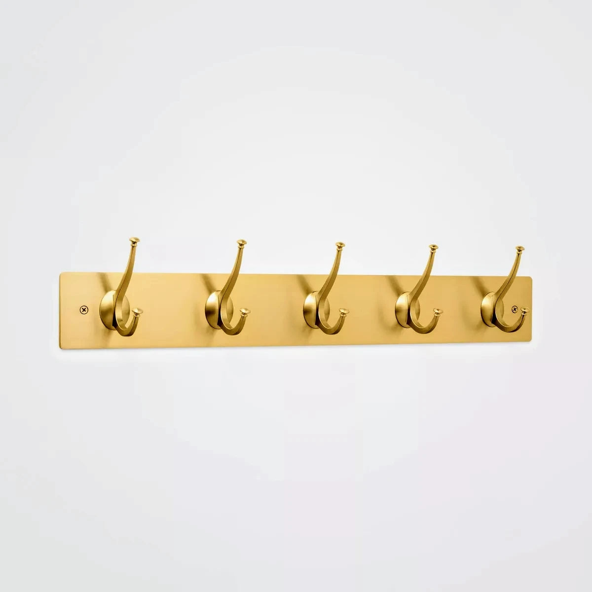 Organize your home with a mix of modern and traditional style with the New Traditional 5-Hook Rail in Gold from Threshold™. Made with metal, this wall-mount hooks rail works well in a variety of spaces to help keep your home look beautifully organized. This gold-tone rail comes with multiple hooks to hang your bags and other essentials in one spot, whether in a bedroom or entryway.