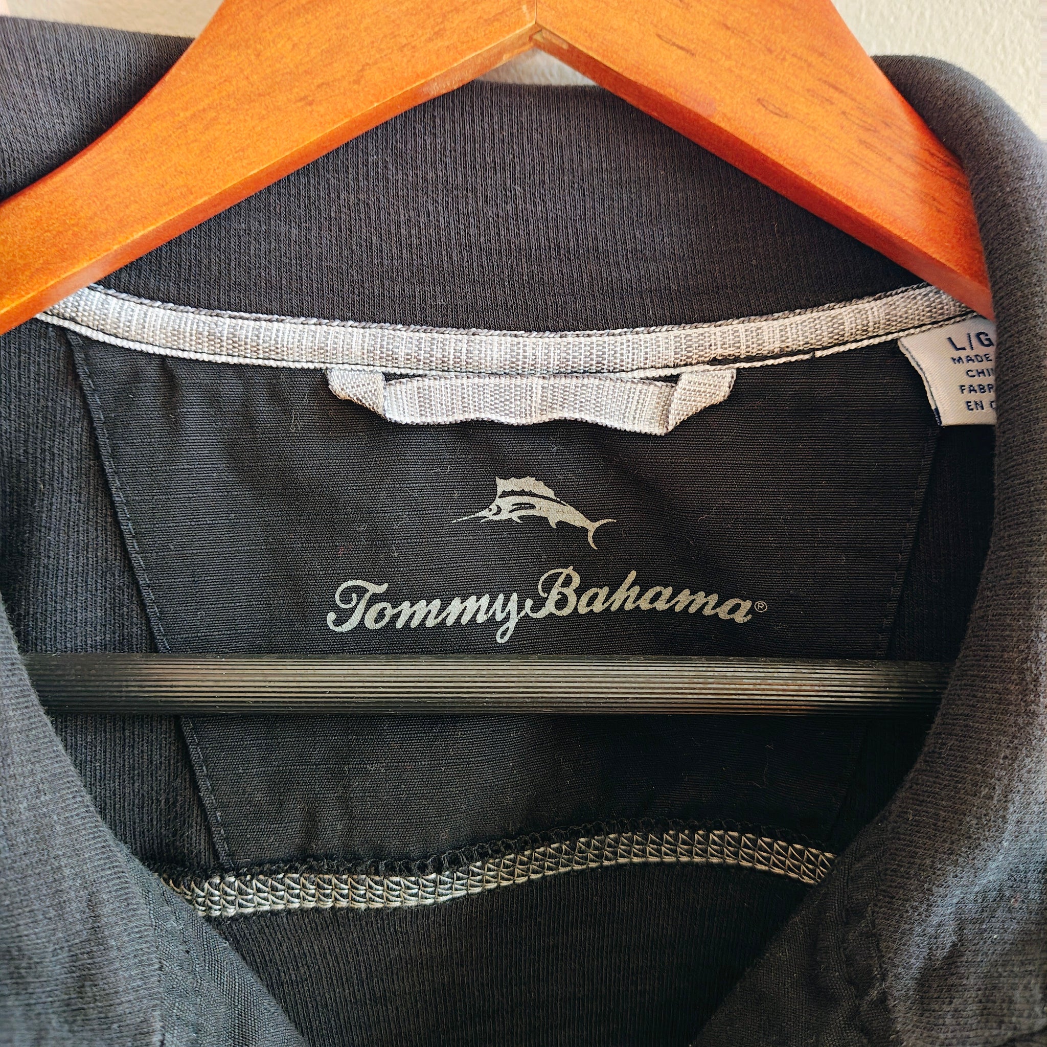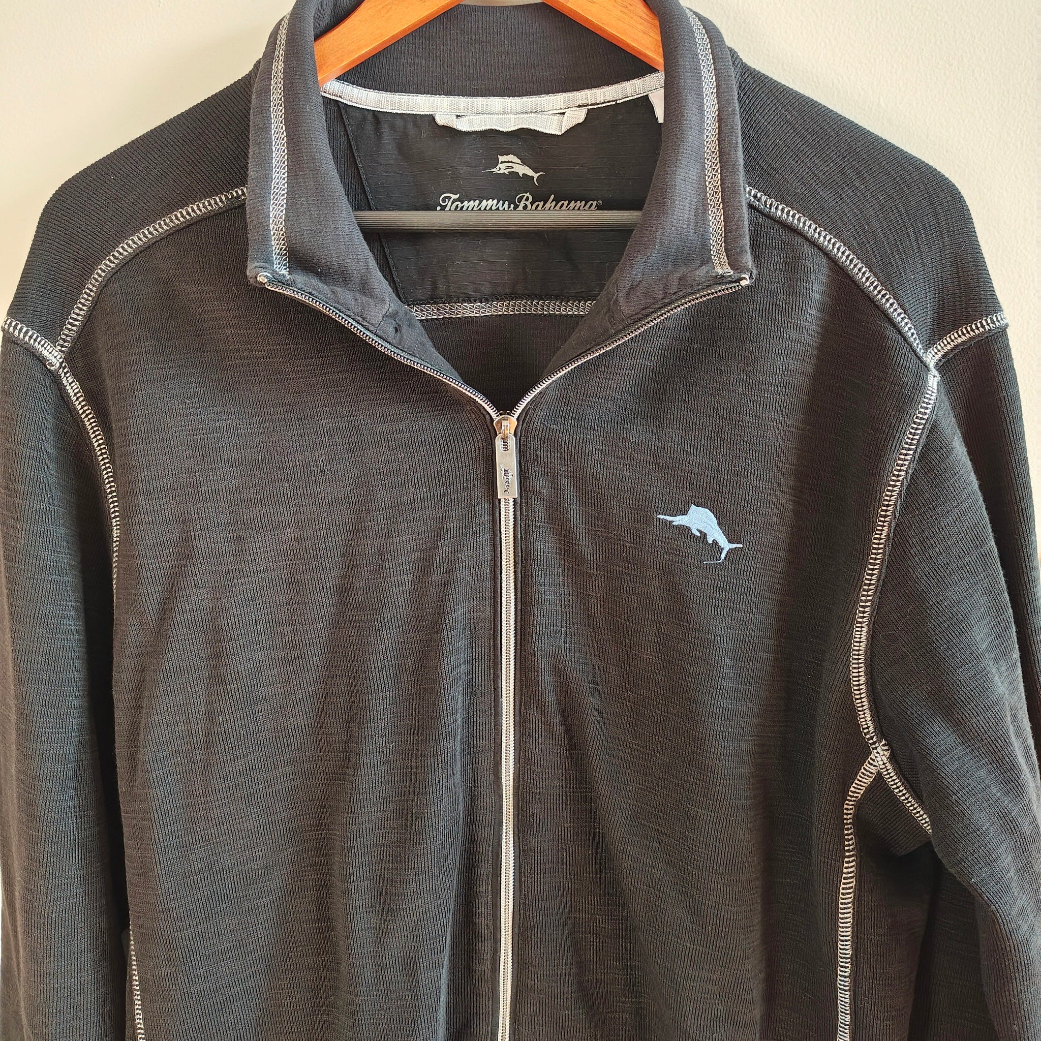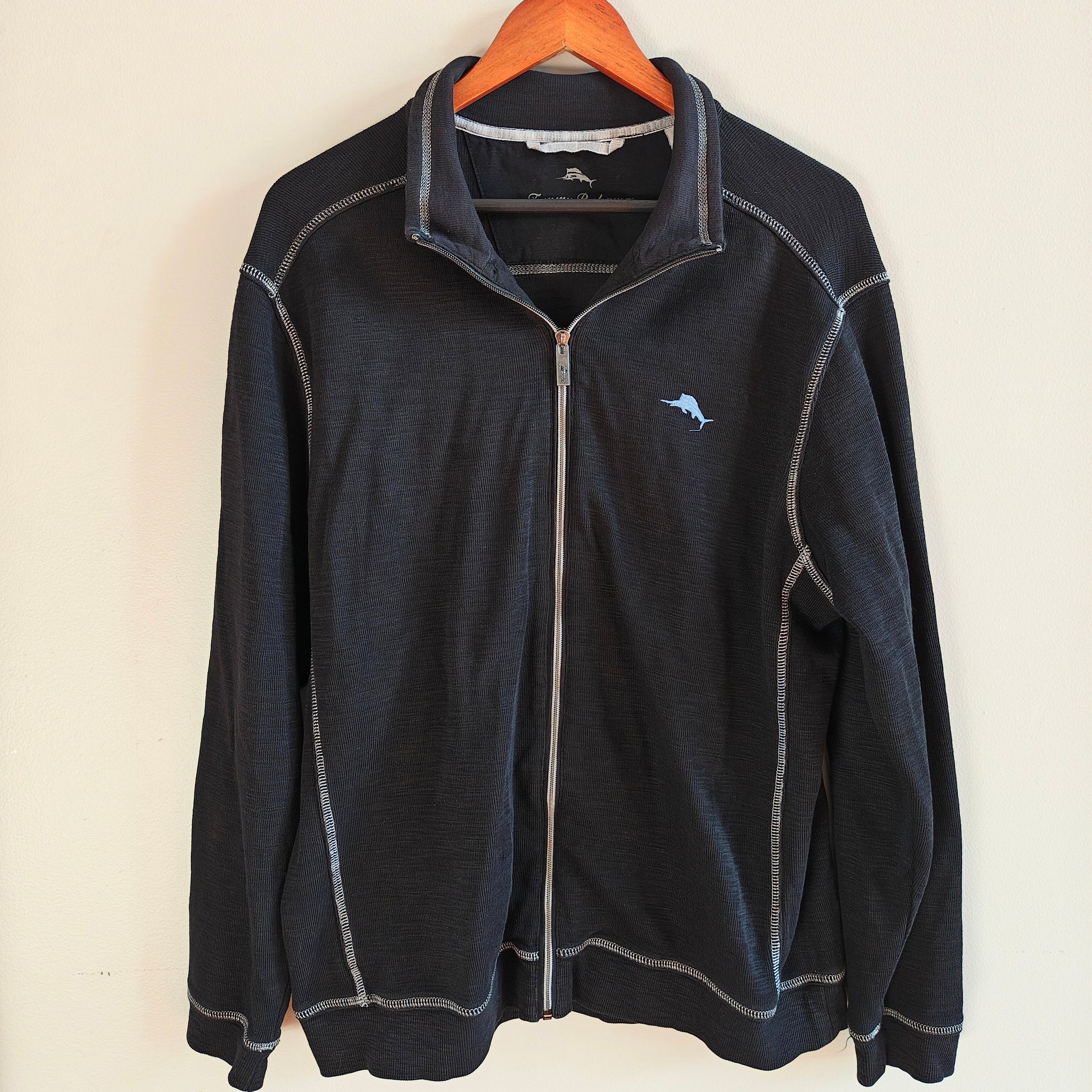Tommy Bahama Men's Tobago Bay Full-Zip Jacket in black with an accent blue Marlin logo embroidery.