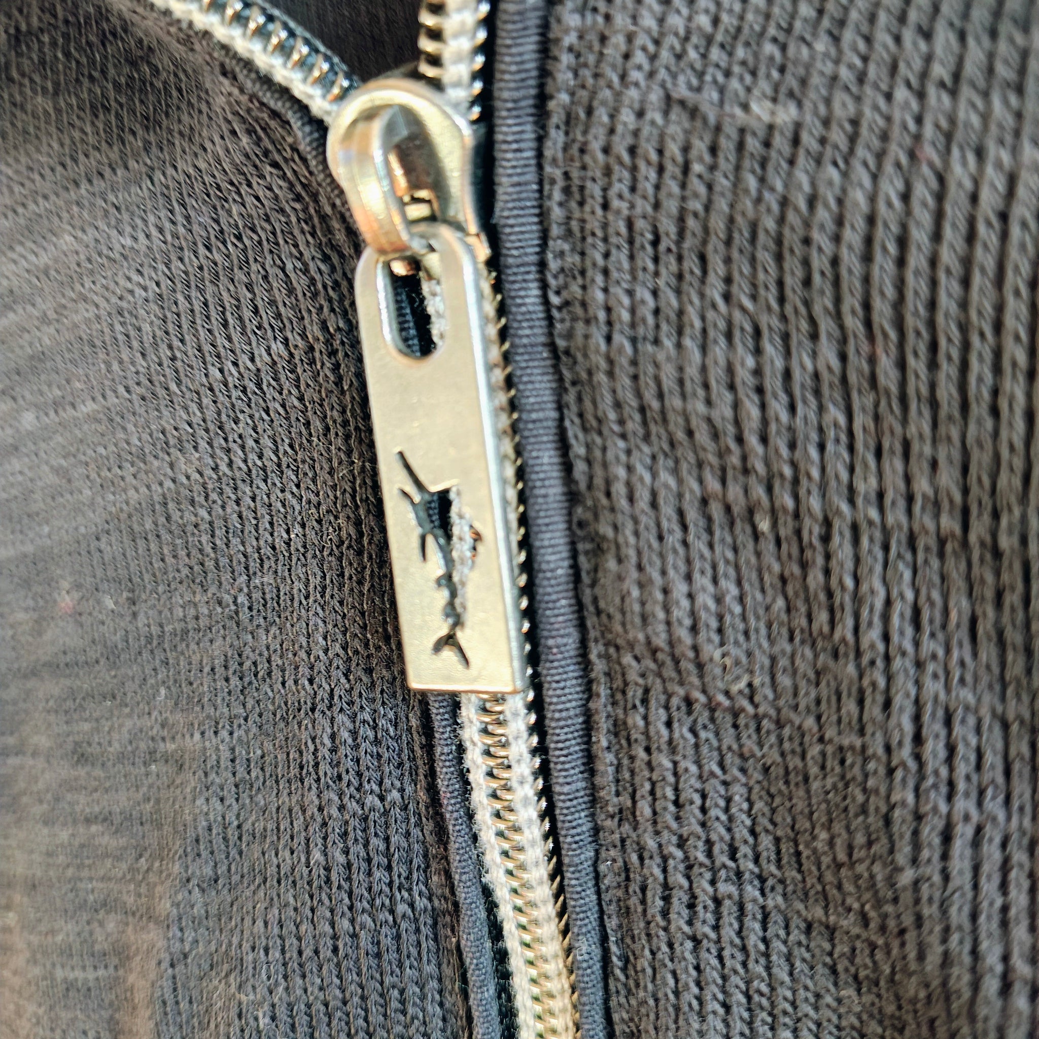 Style: Full-zip jacket with a stand collar, side-seam pockets, and ribbed cuffs and hem. It features contrast stitching details, which are visible in the image.