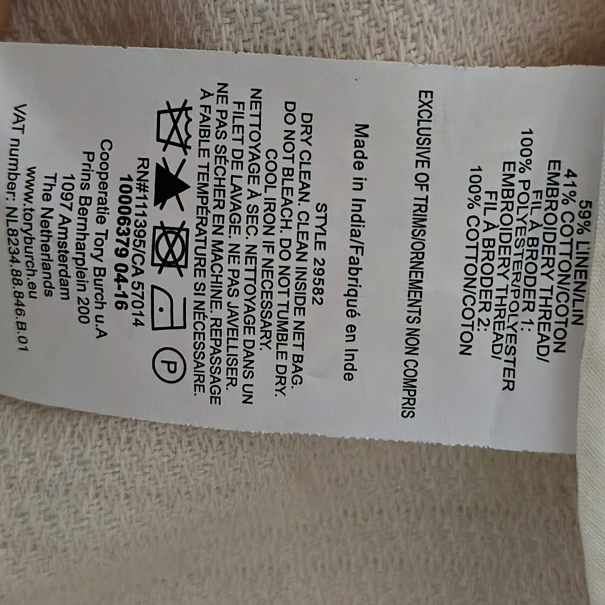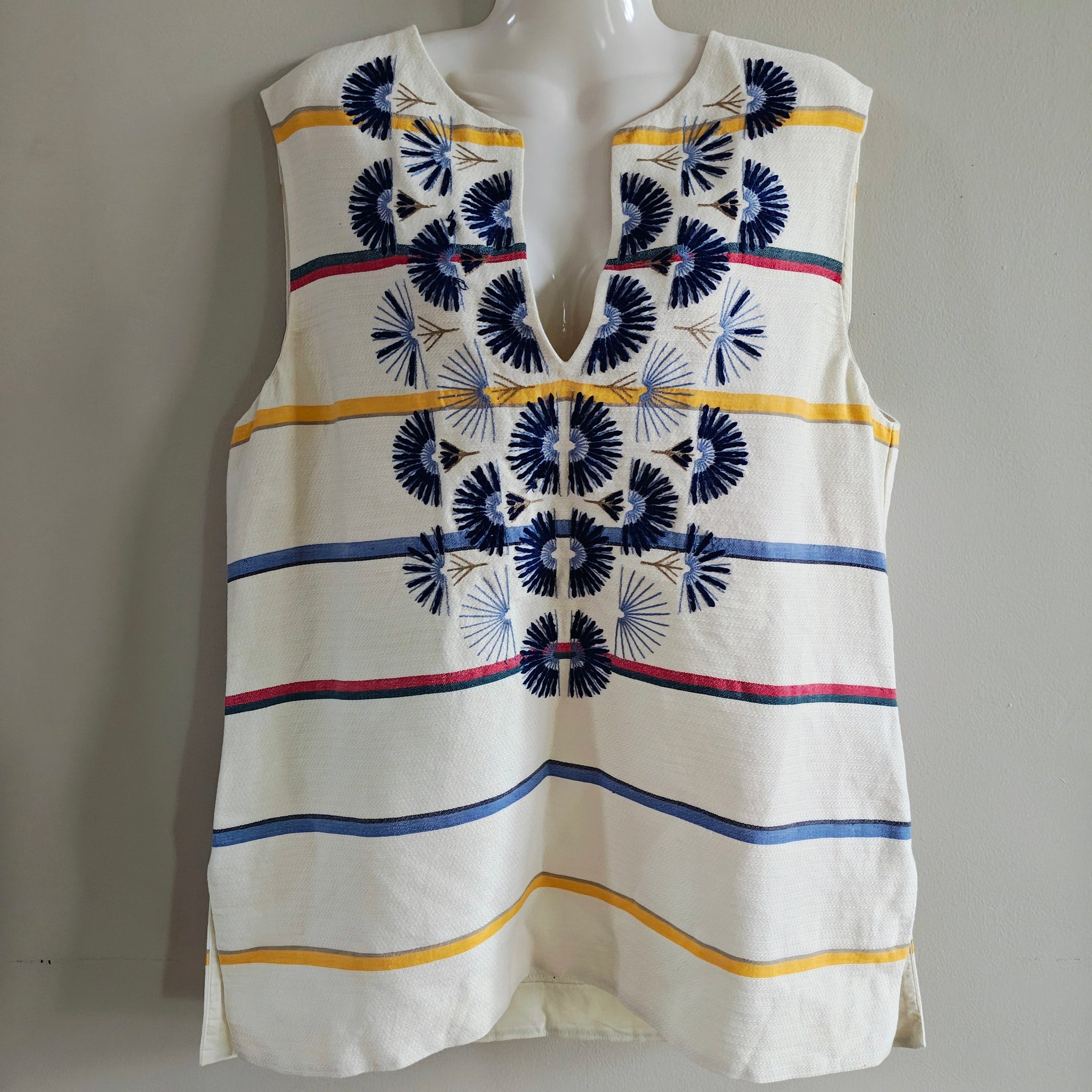 Design: Sleeveless with a split V-neckline, side slits, and multicolored stripe and floral embroidery accents.
