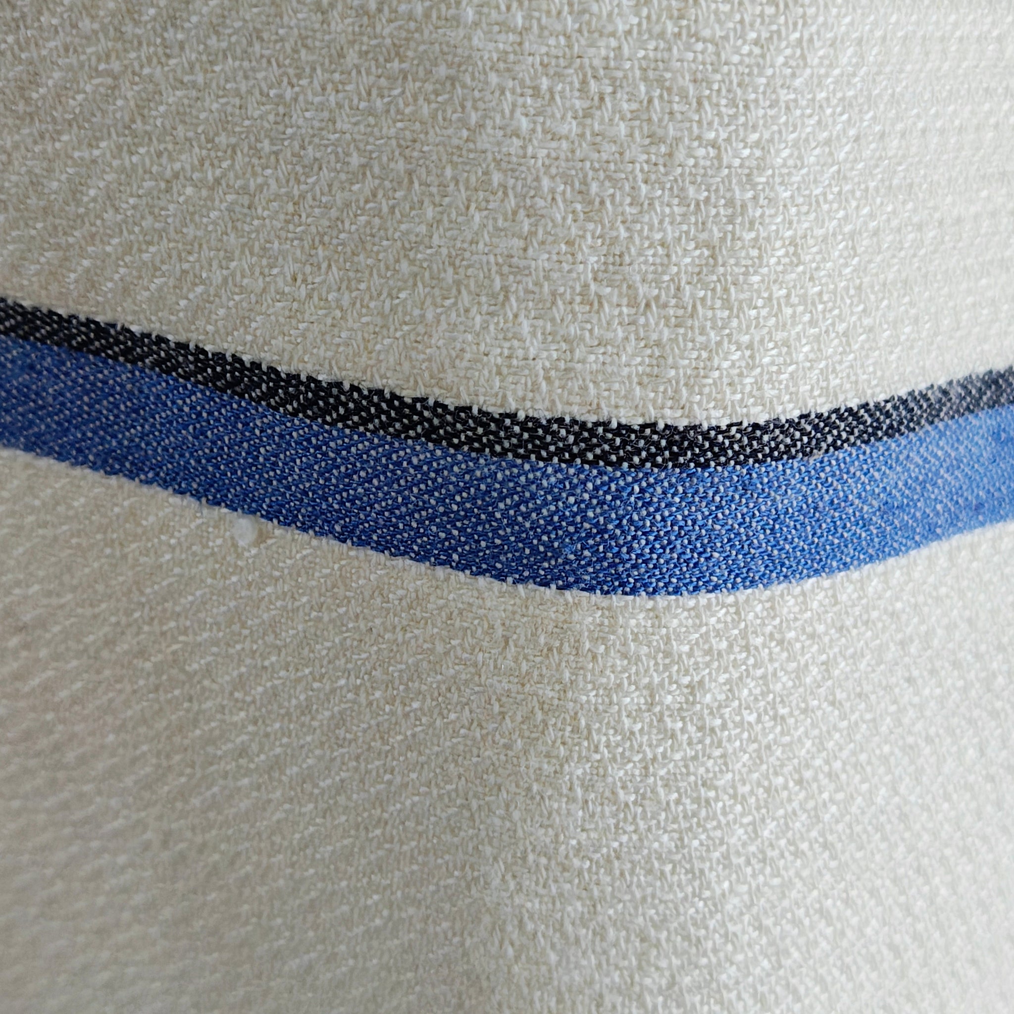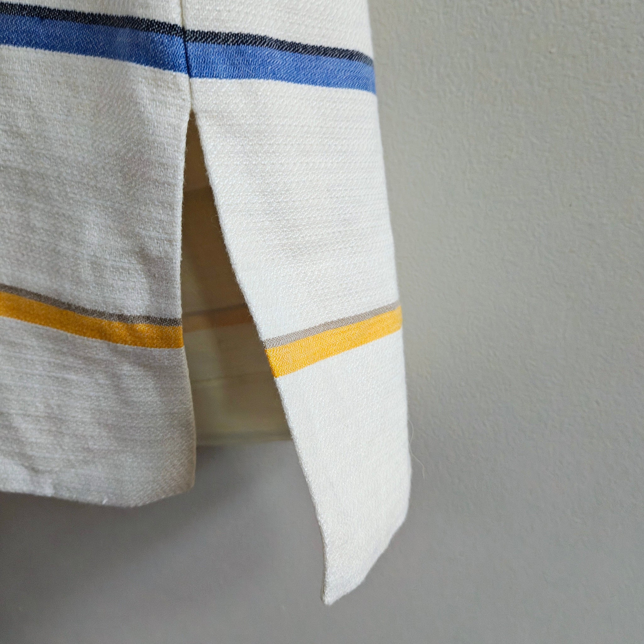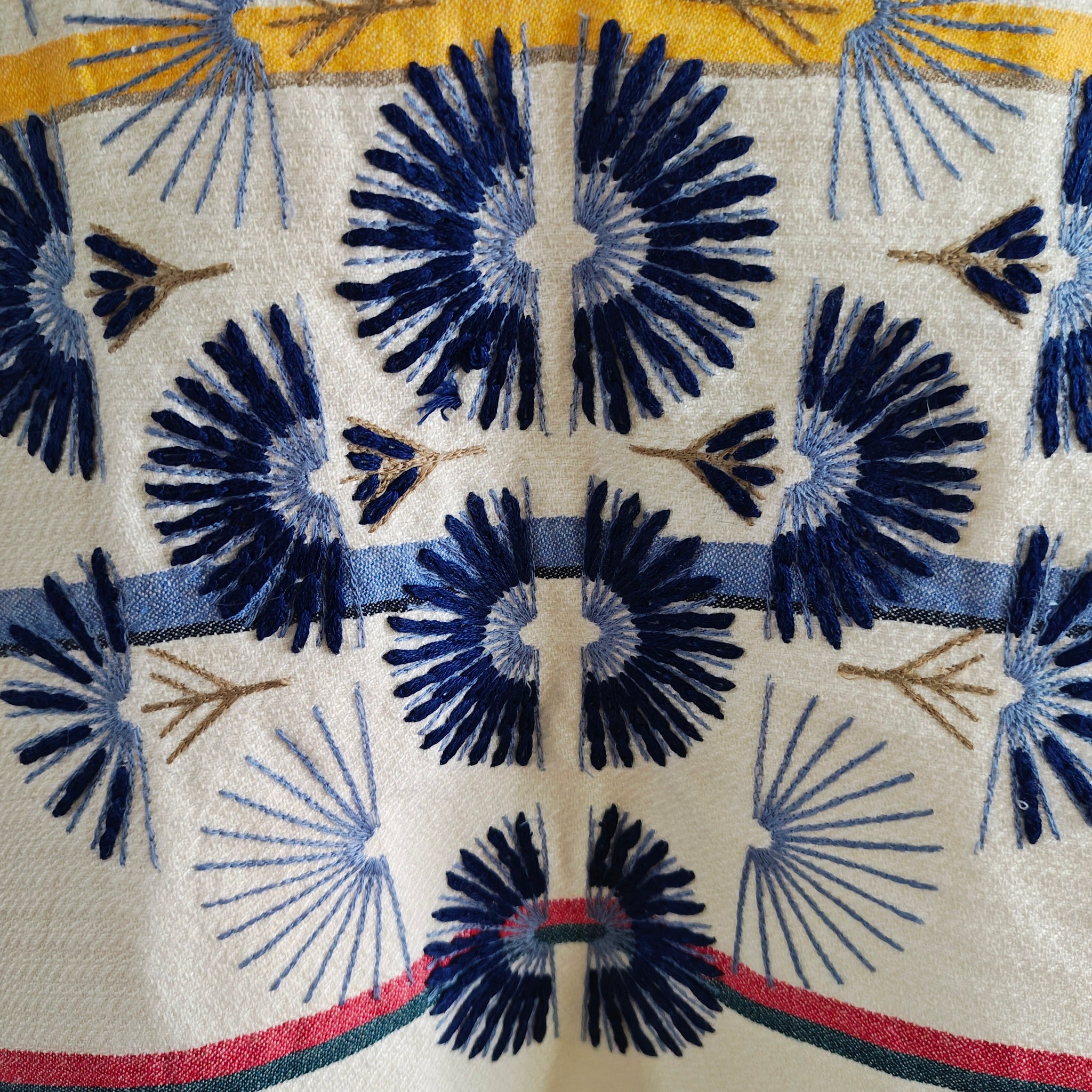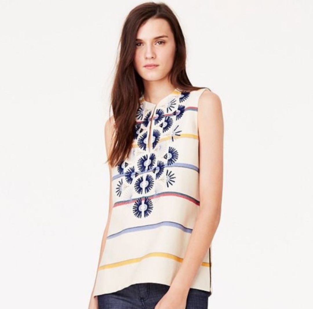 The white top features multi-color blue, yellow, and red stripes and a v-neck with intricate floral embroidery details.