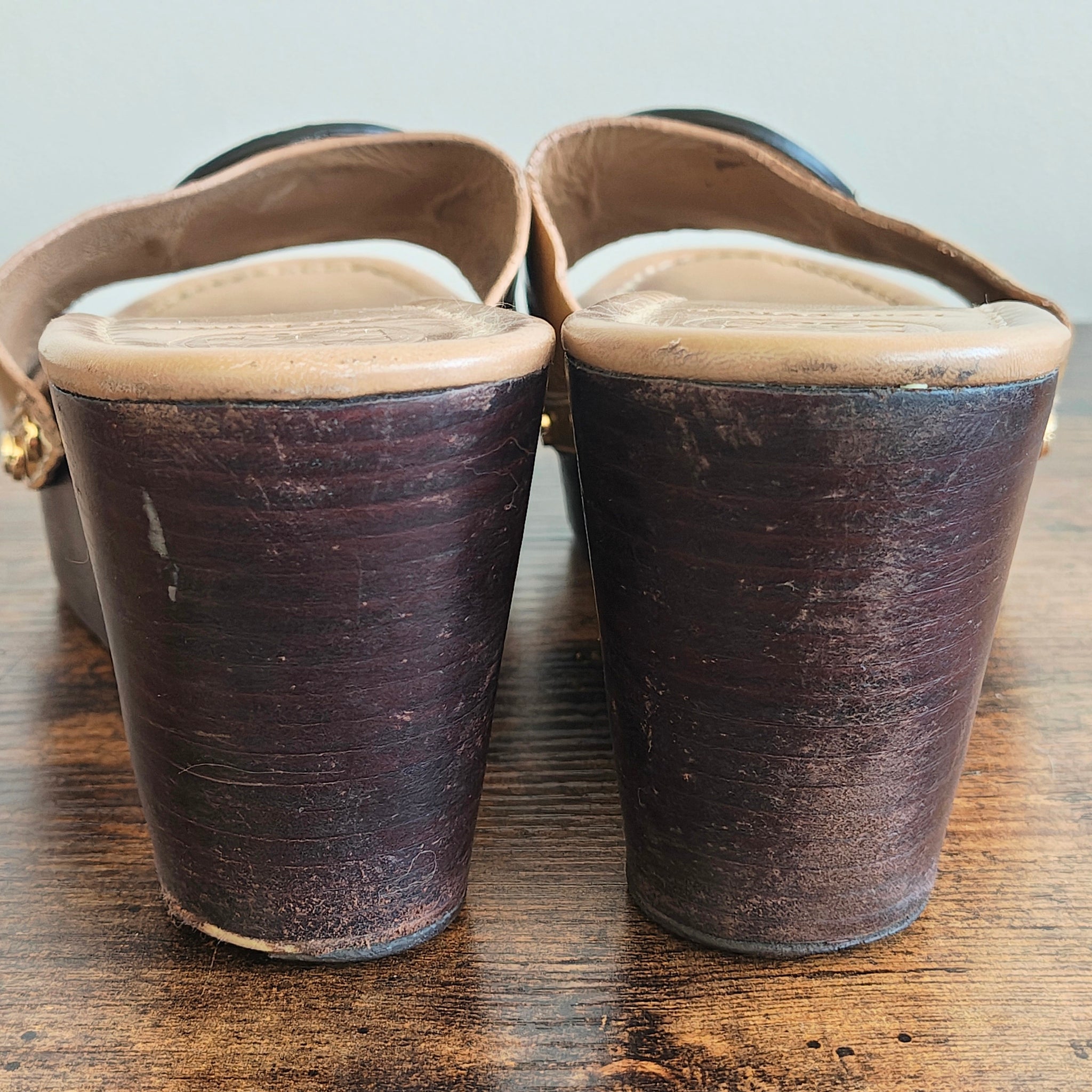 Features: Iconic Tory Burch double-T logo embellishment and gold-tone studded detailing around the platform