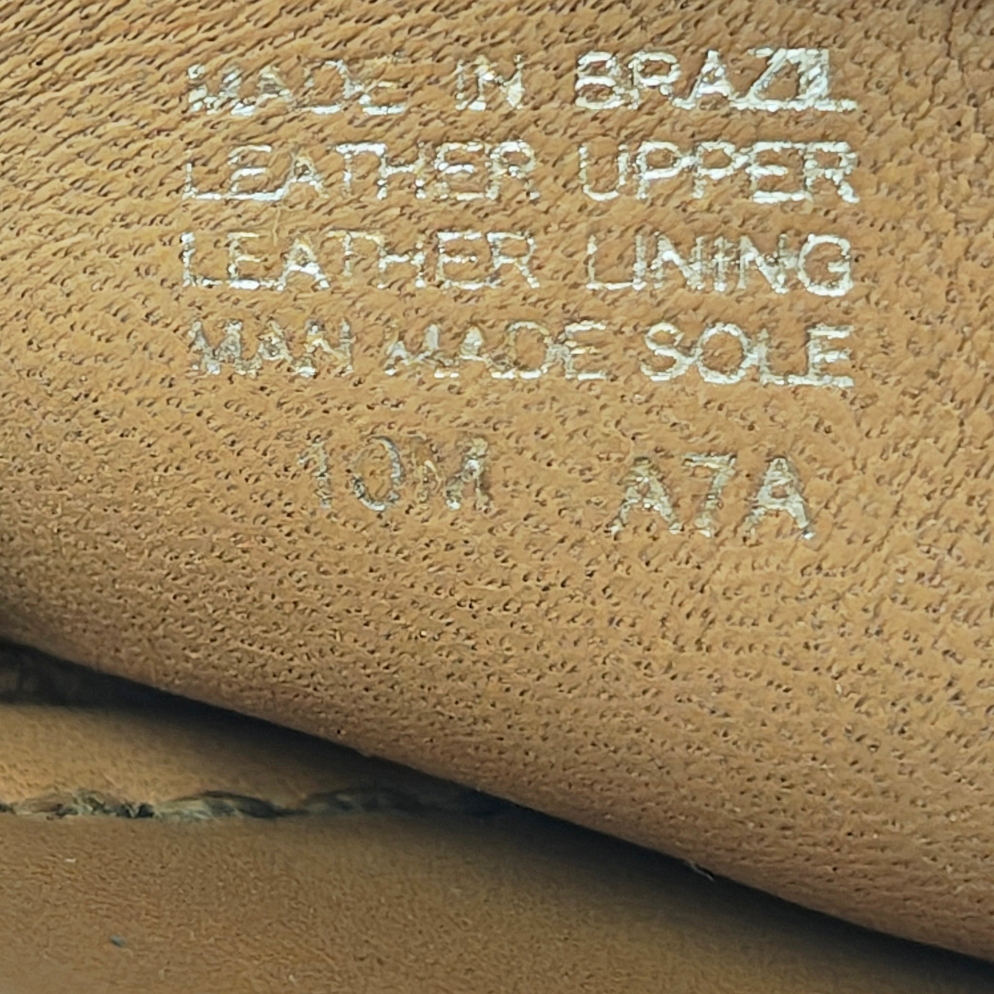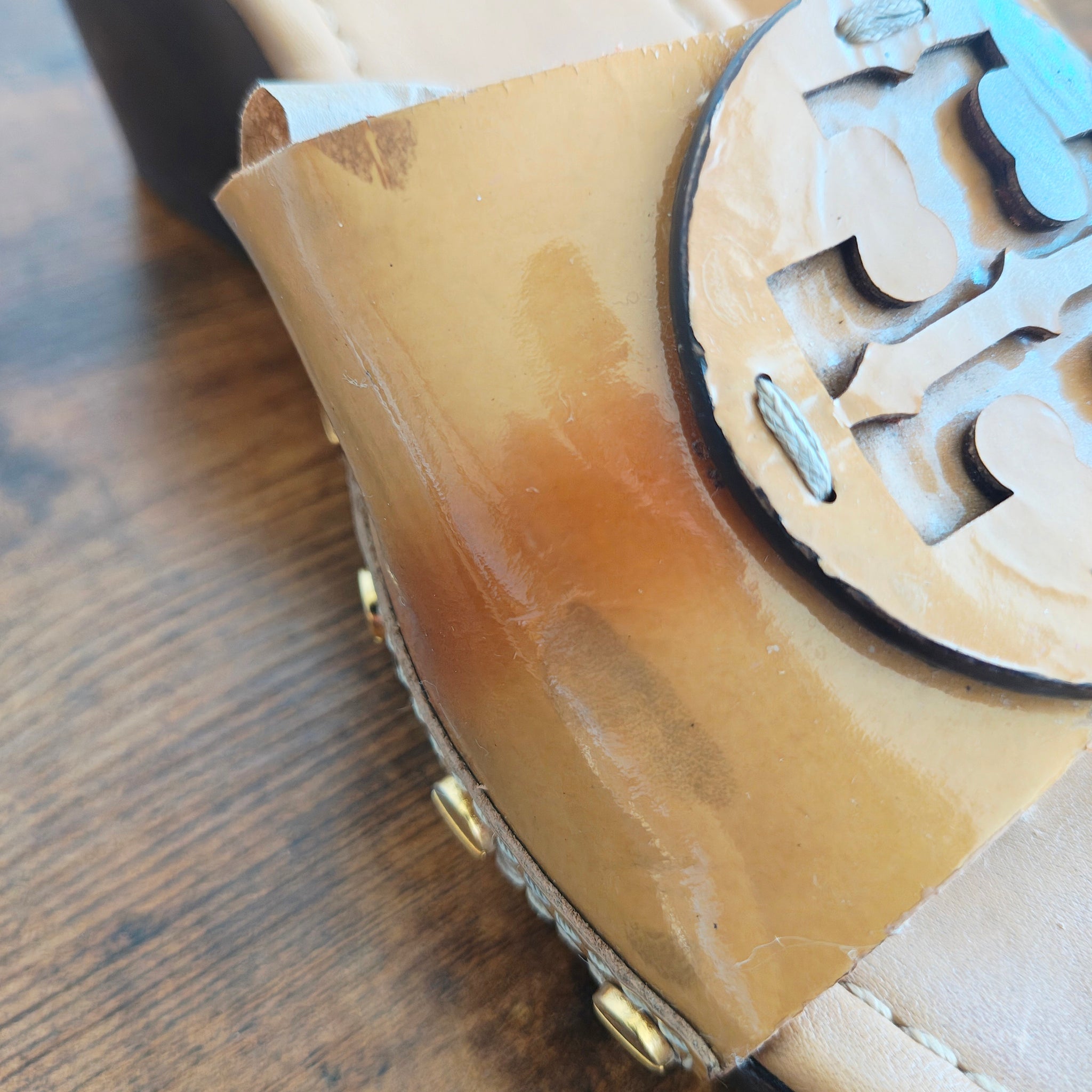 Material: Beige patent leather upper with a wooden-style wedge heel