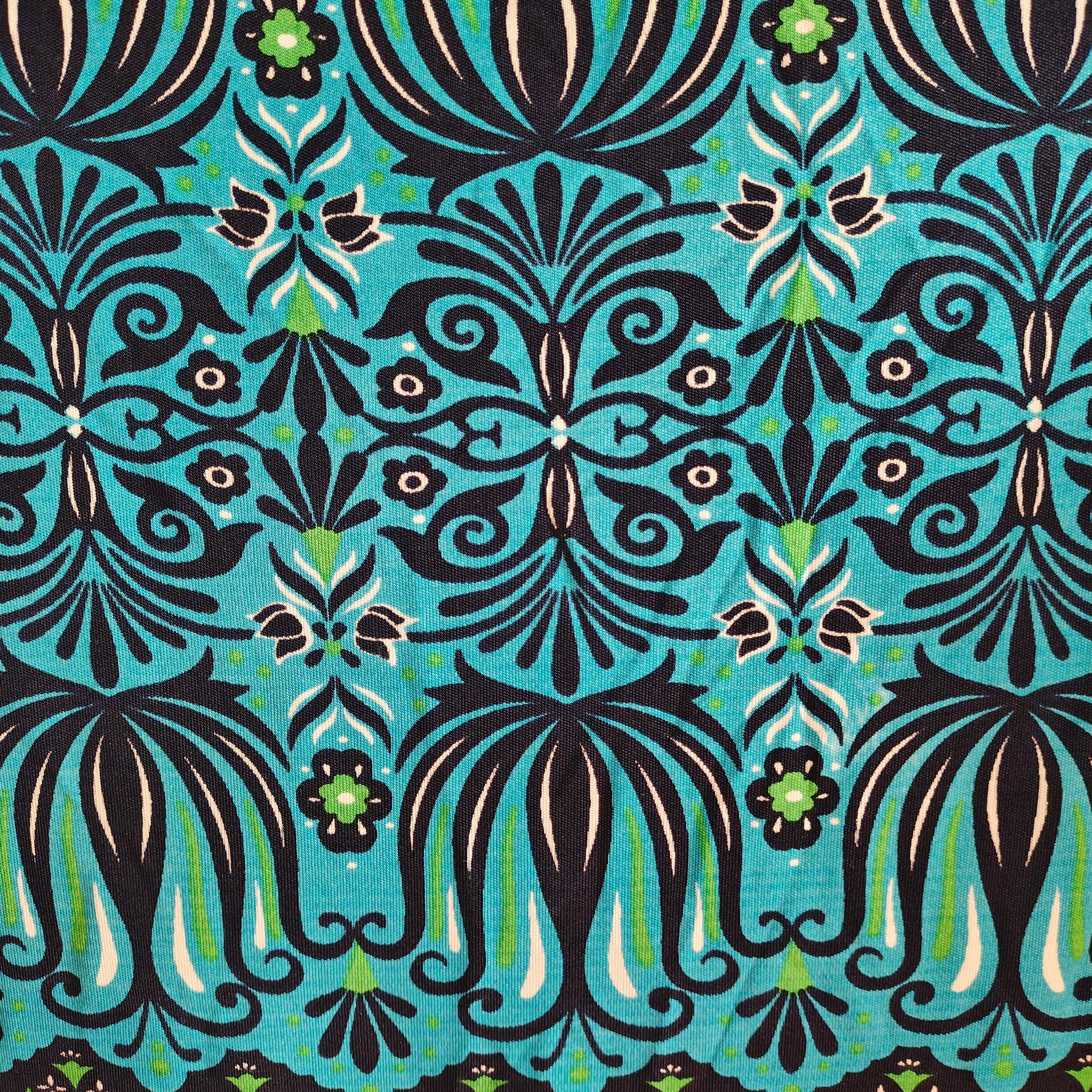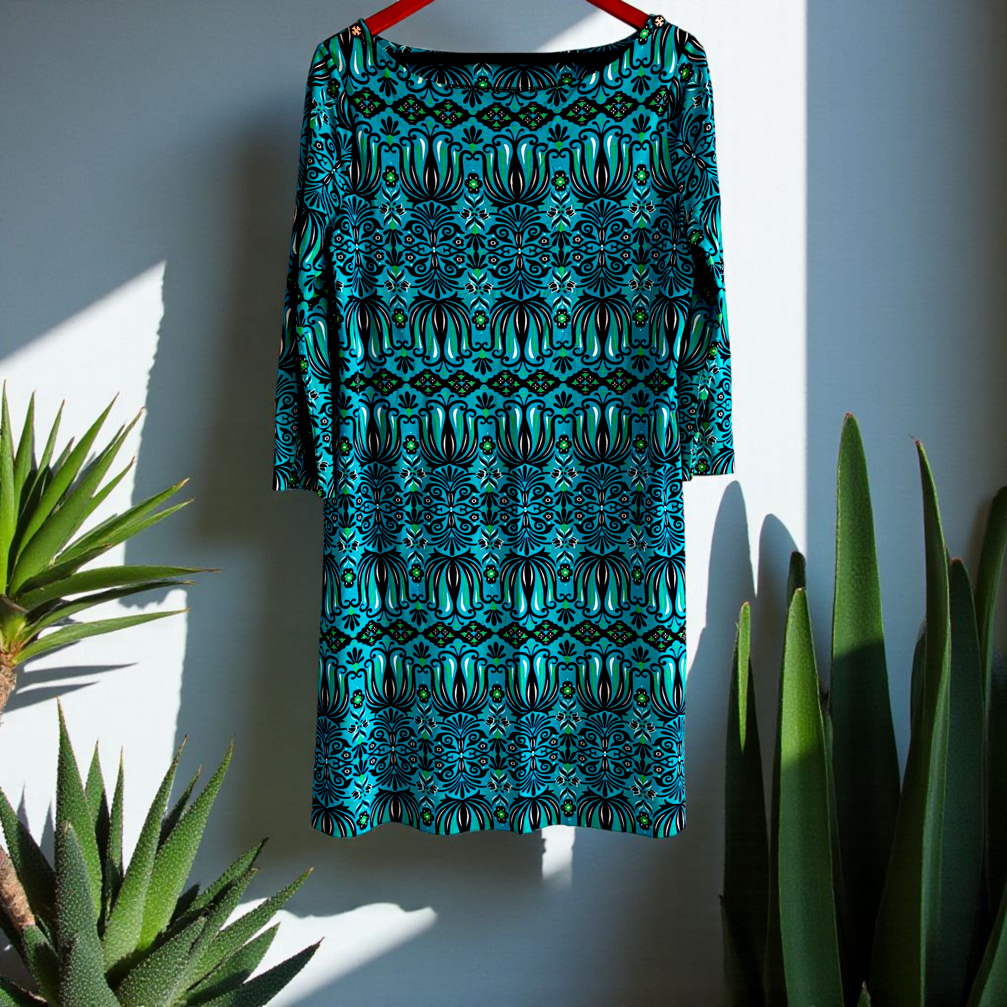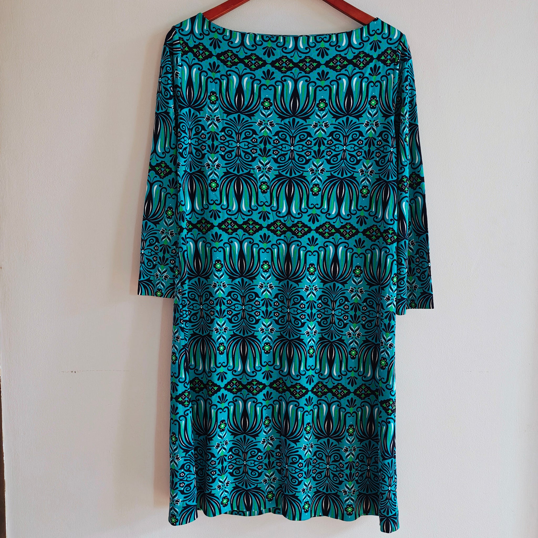 Tory Burch Shift Dress in a blue and green geometric print. Luxurious feel and fit.