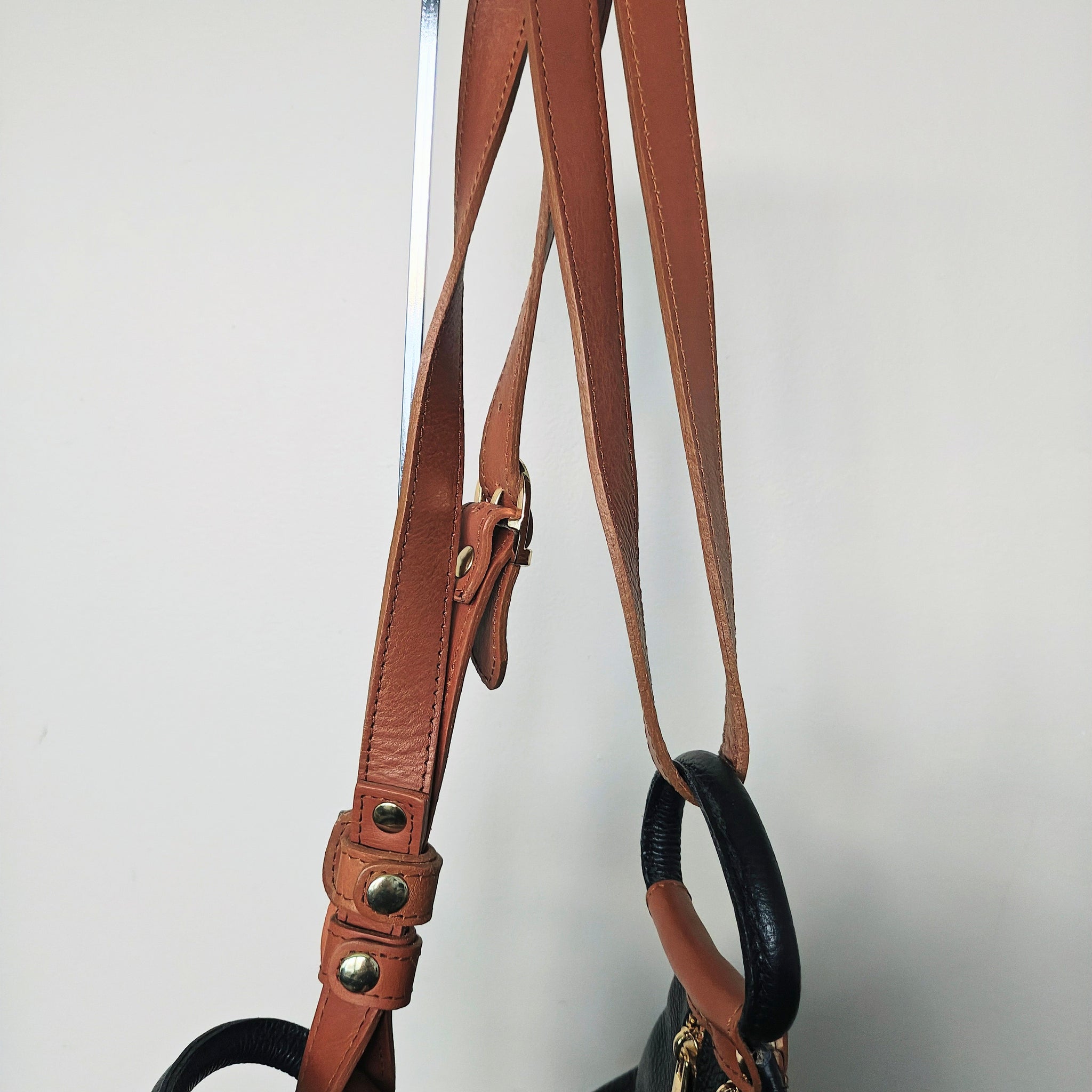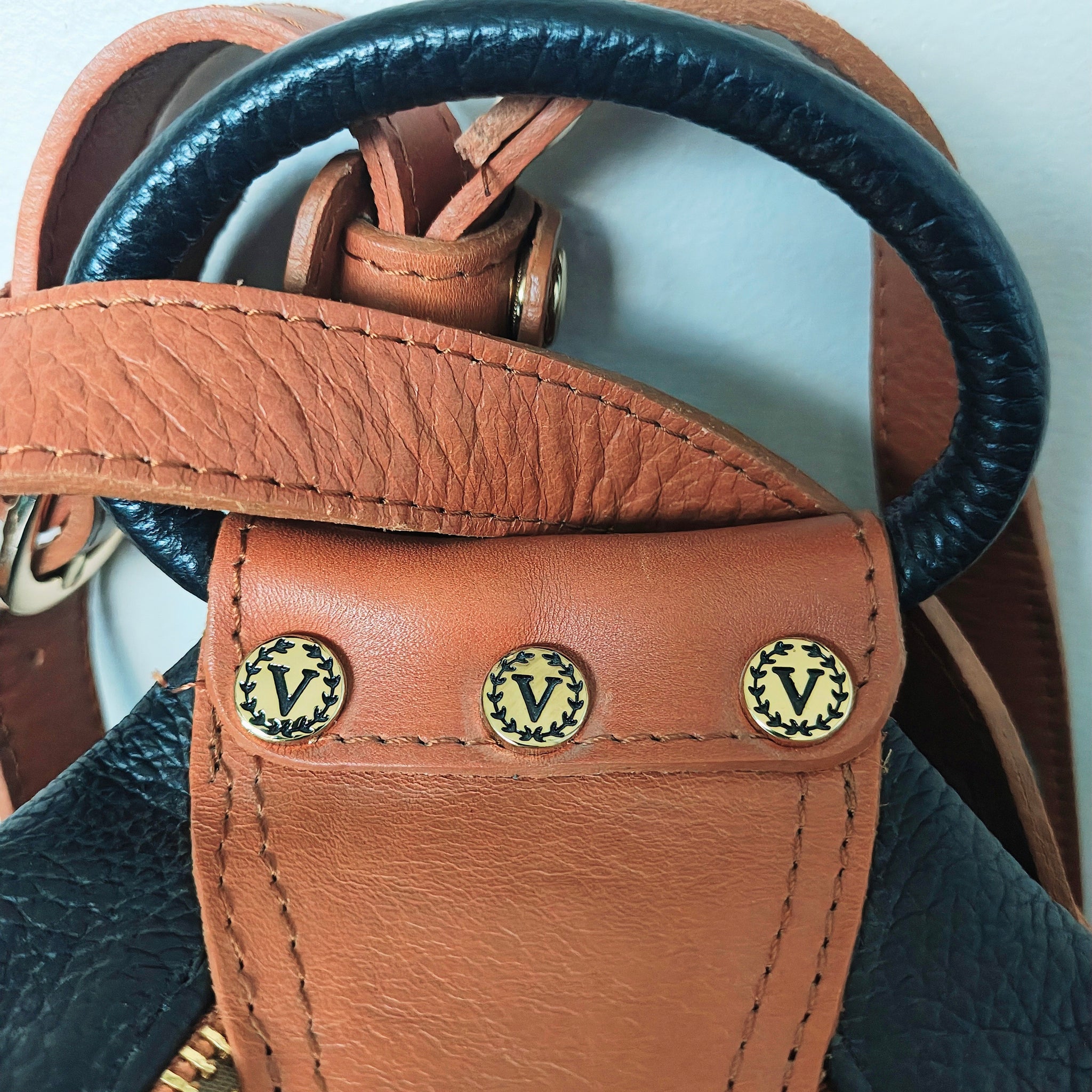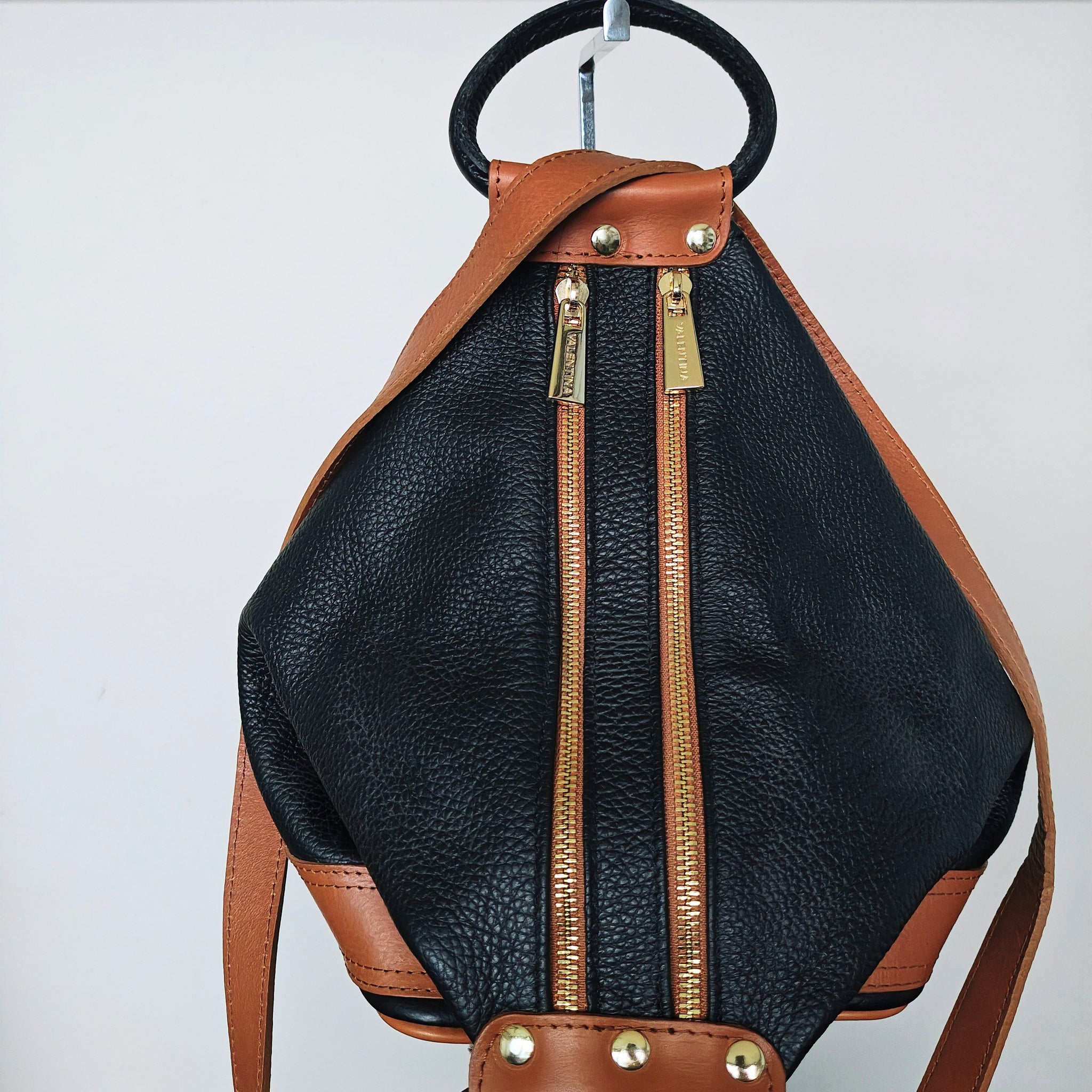 Valentina Italy black and tan leather convertible backpack/sling bag. The bag is made of genuine Italian pebbled leather and features gold-tone hardware, a metal O-ring top handle, and adjustable straps that allow it to be worn as a backpack or a sling bag.