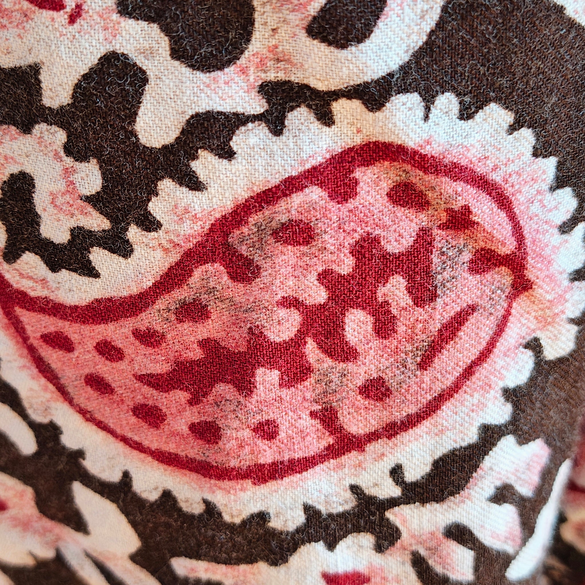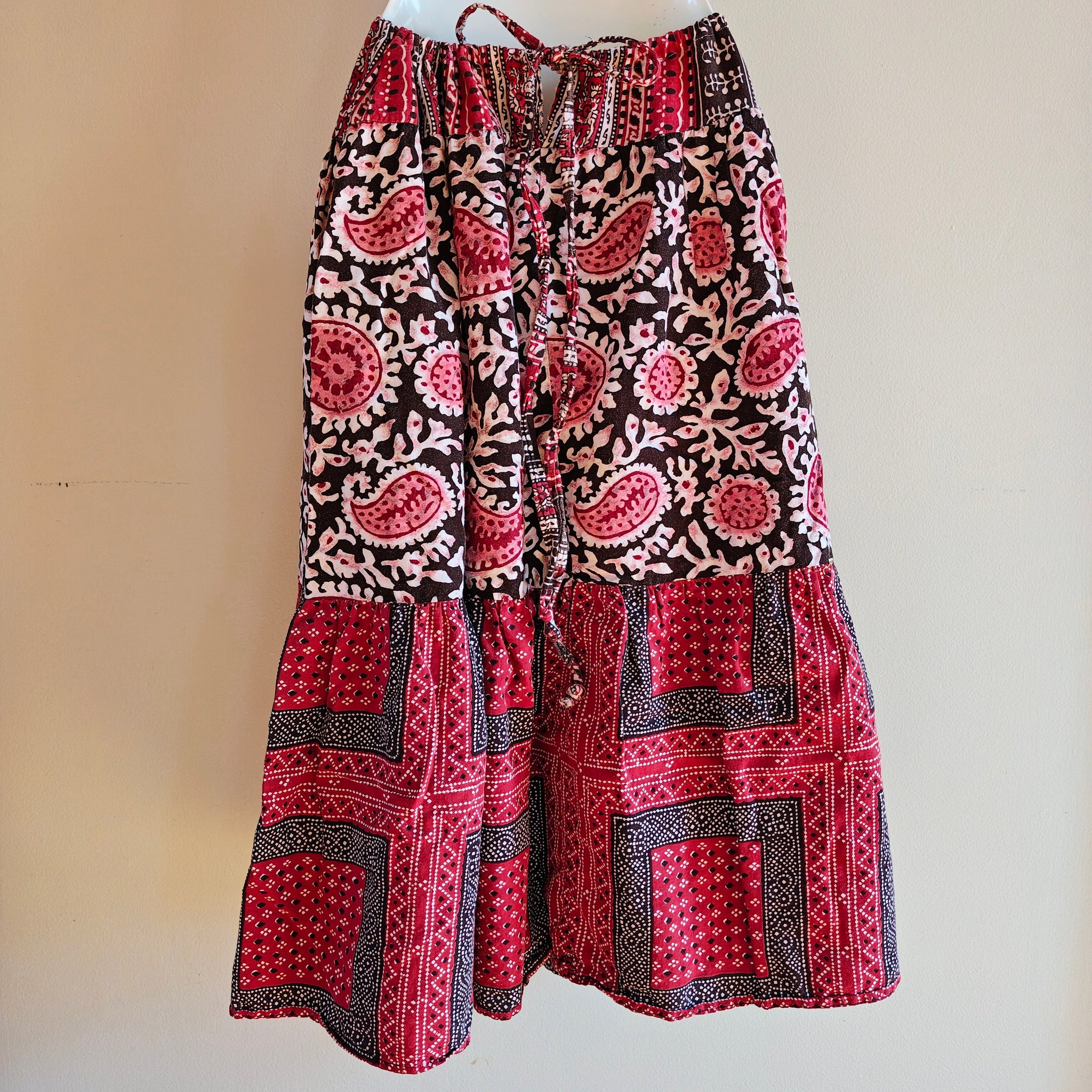 Print: A combination of red, black, brown and off-white ethnic and block prints, featuring paisley and tribal motifs.