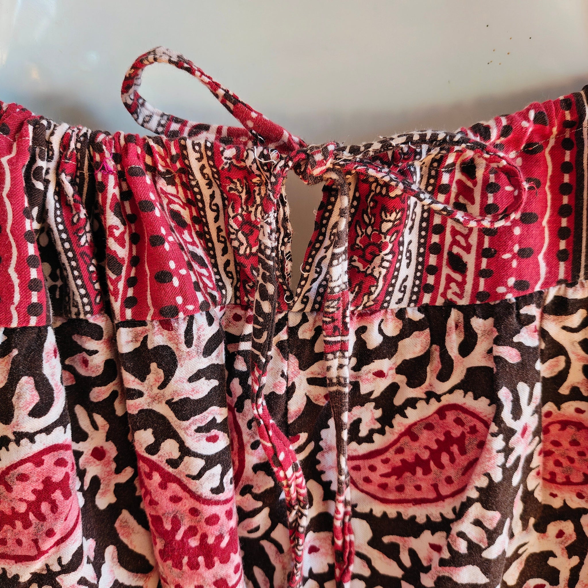 Design: Tiered construction with a different print at the bottom border. Drawstring tie closure.