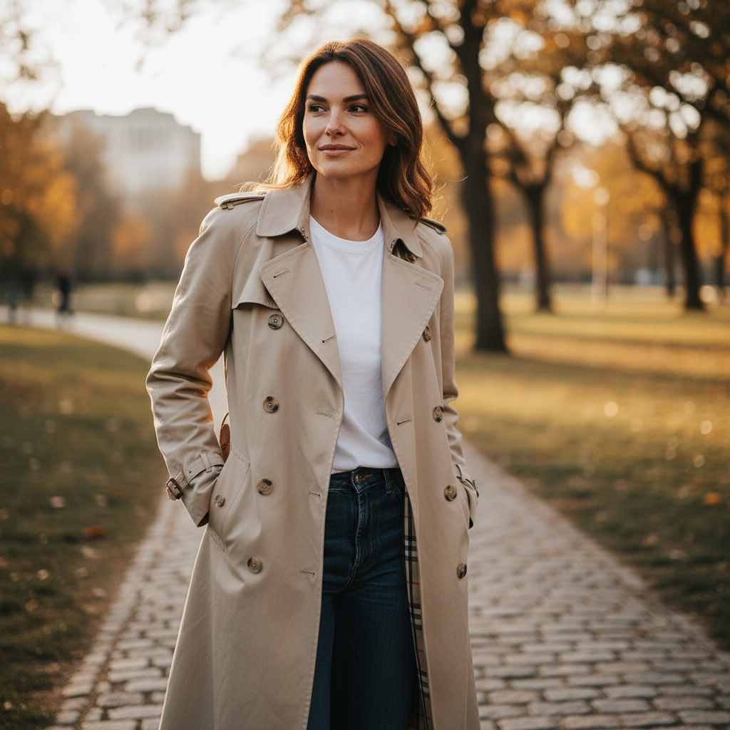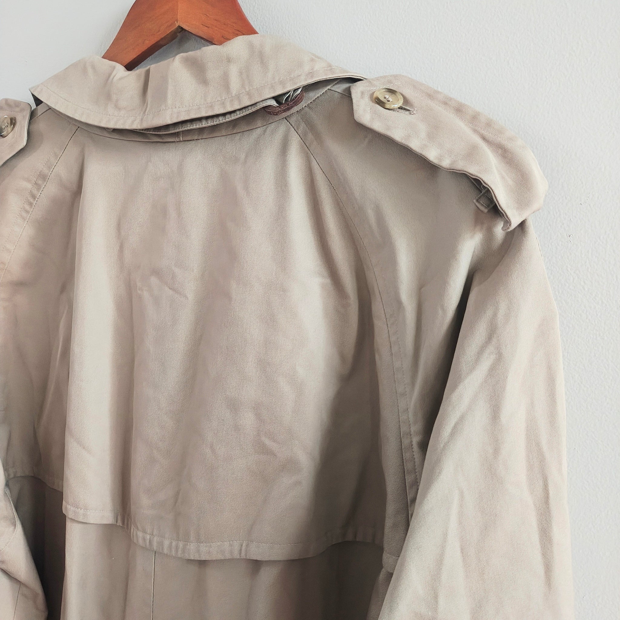 Design Elements: The coat displays classic trench coat features such as epaulettes, a double-breasted front, and a button-up collar closure, originally designed for military functionality during WWI.