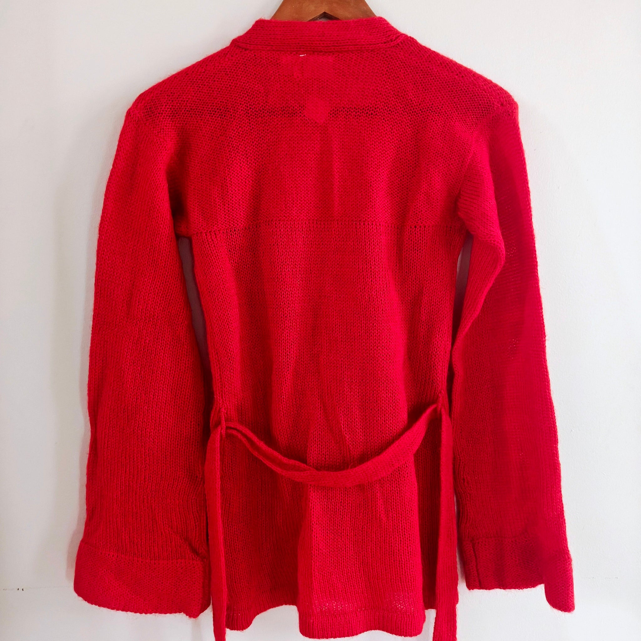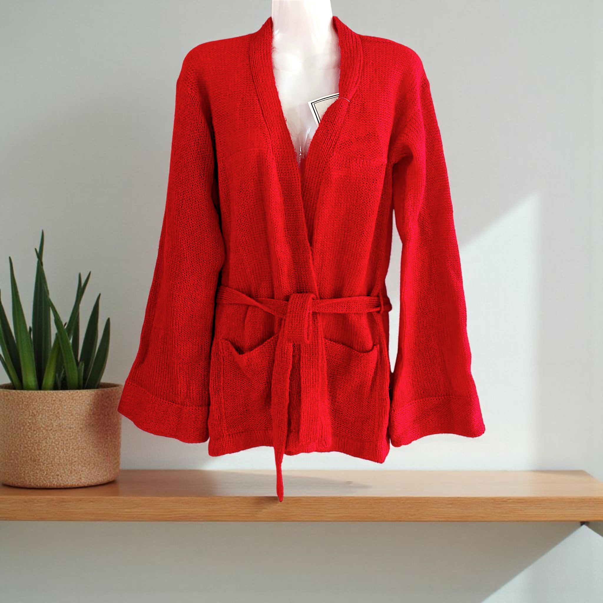 Design Details: open-front design with a matching tie belt, a V-neck/shawl collar, patch pockets, and distinct flared sleeves.