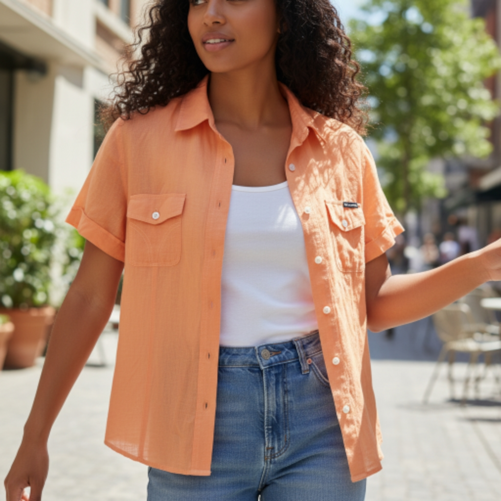 Style: It is a casual, short-sleeve button-down top with functional chest pockets.