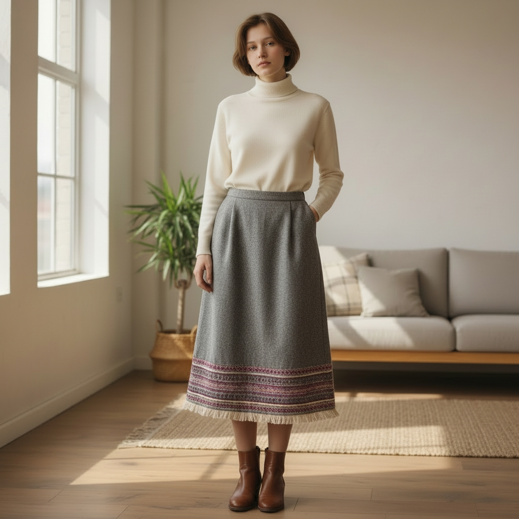 Vintage Sag Harbor Peruvian pencil skirt featuring a beige tweed body with a colorful, embroidered and fringed hem. It is typically made from a wool blend (acrylic, polyester, and wool) and is fully lined.