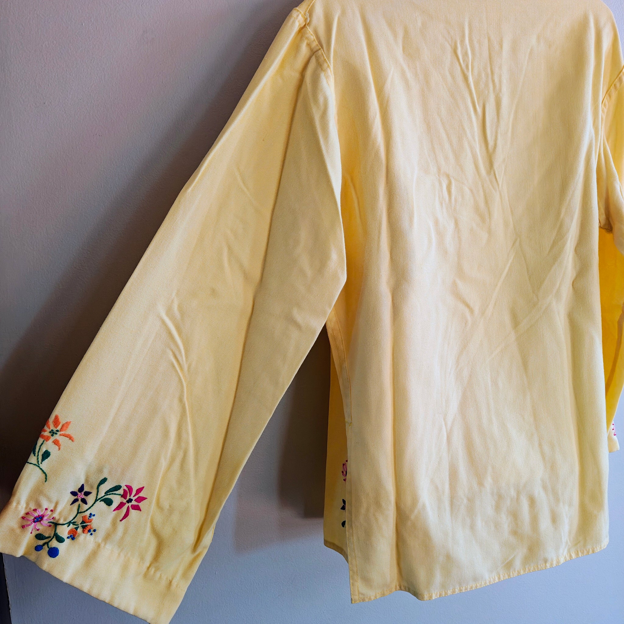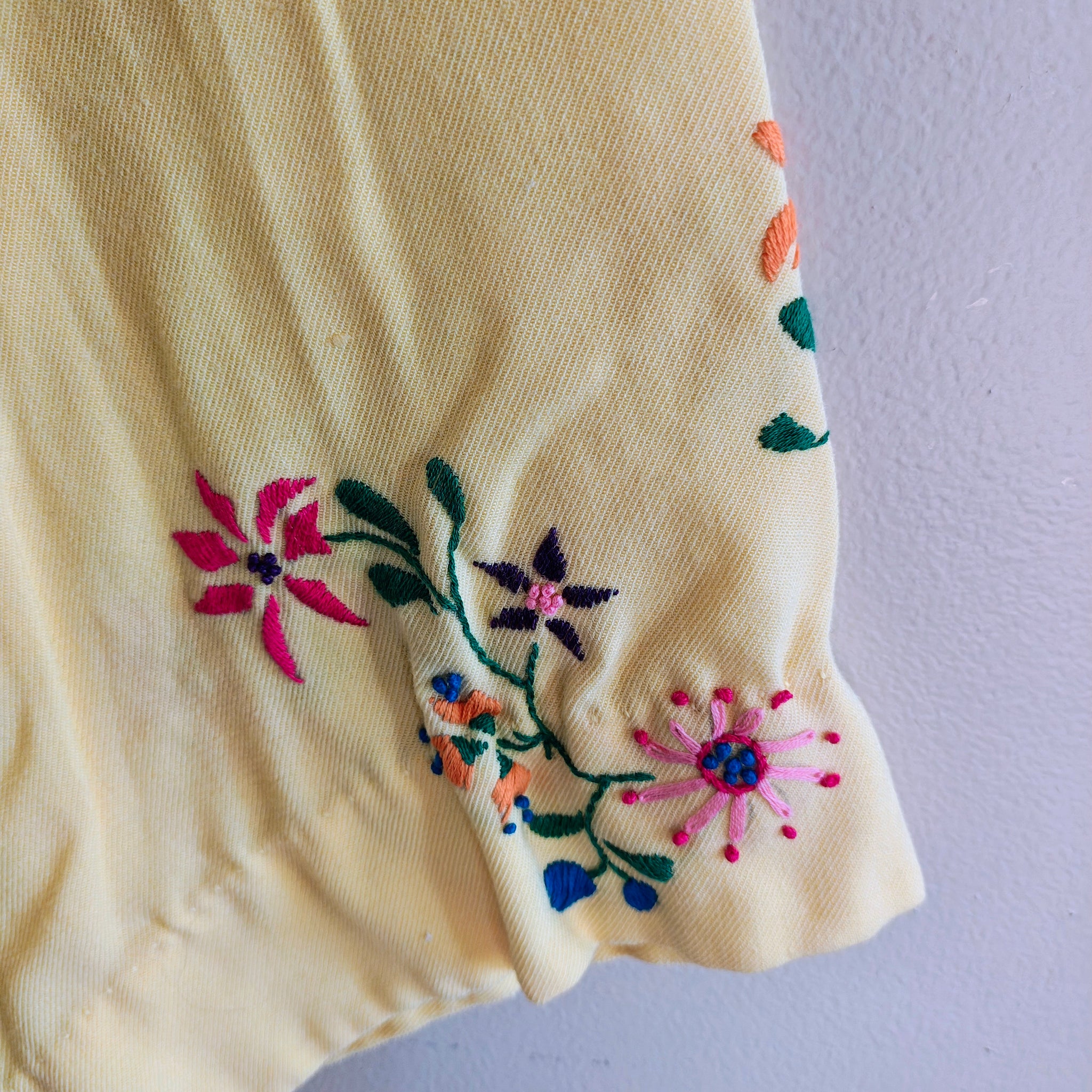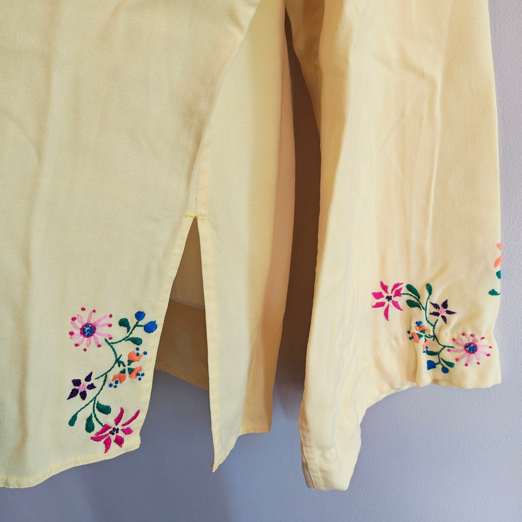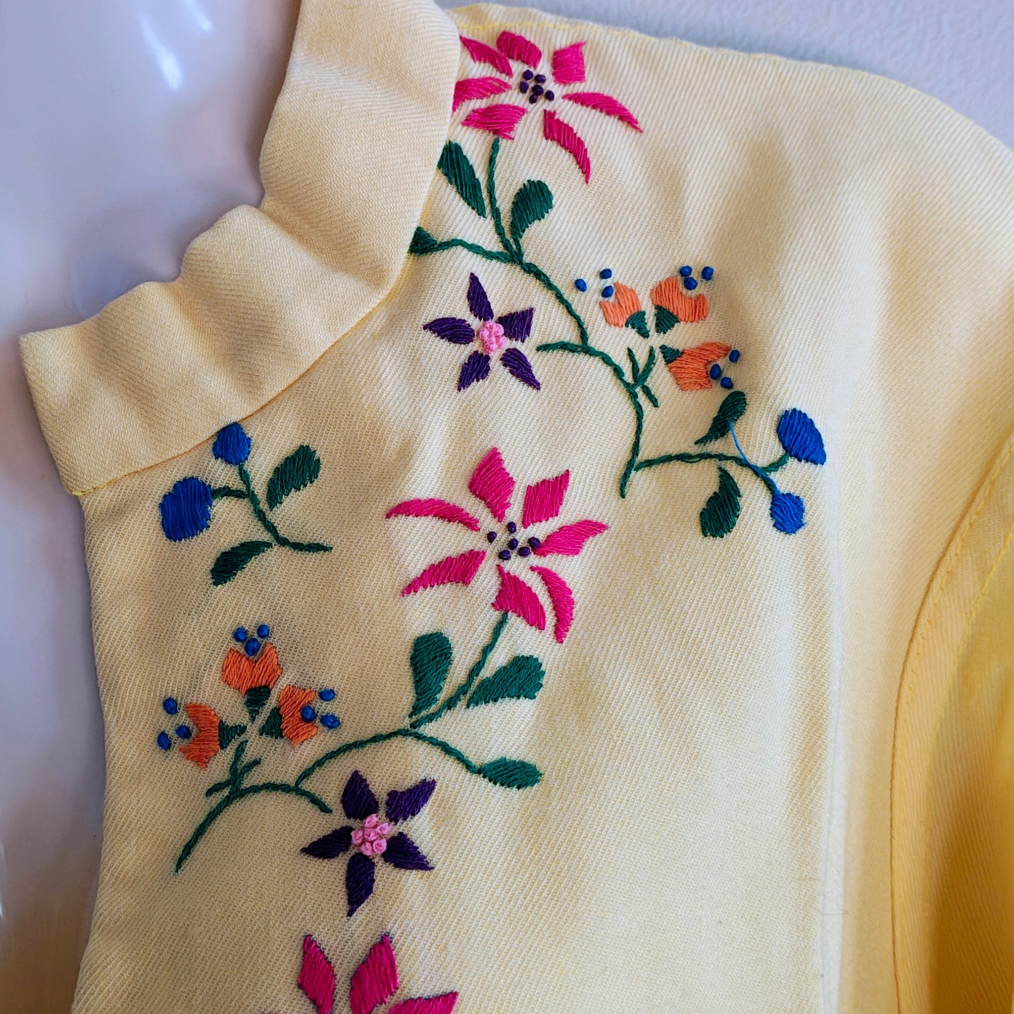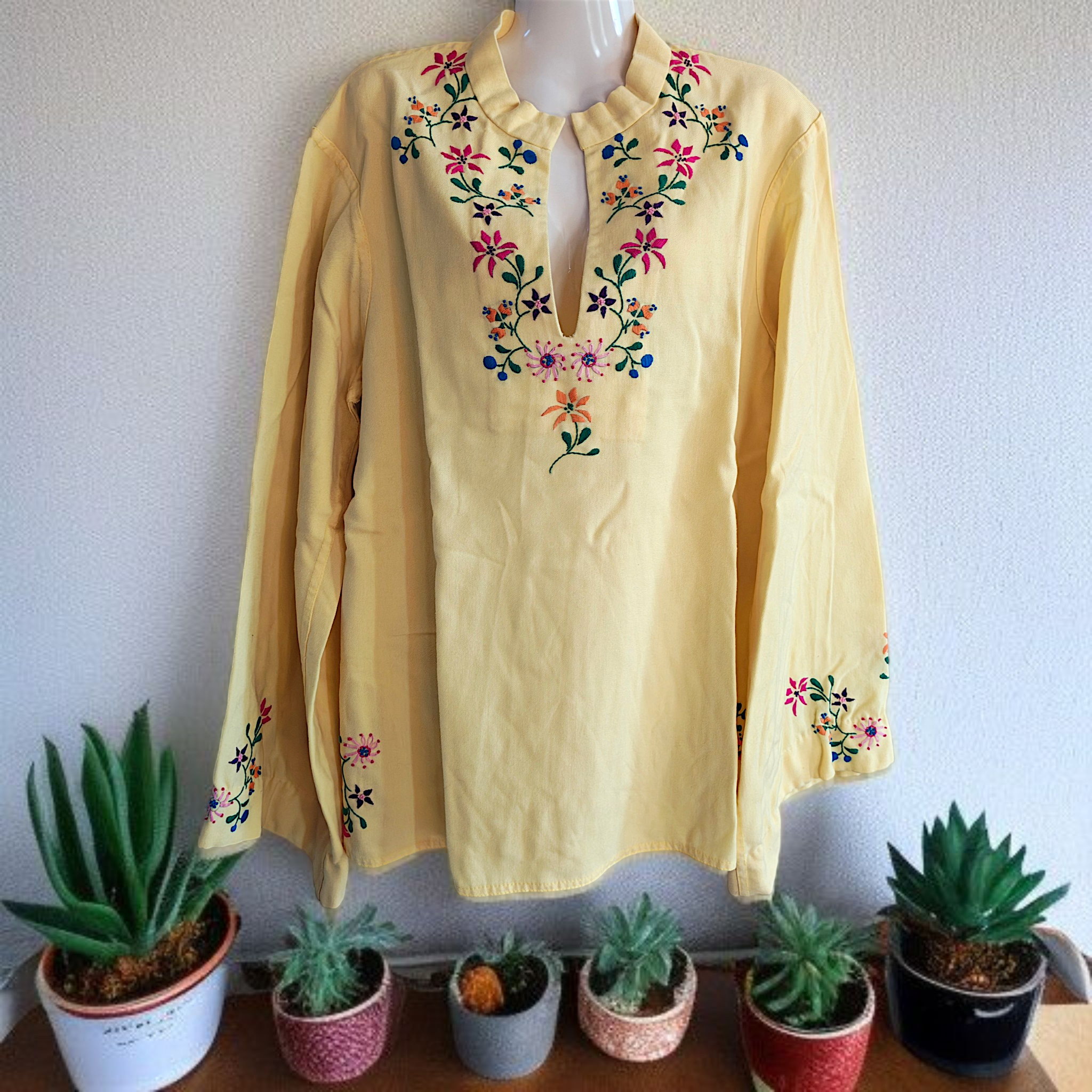 Color: Yellow with vibrant embroidery.