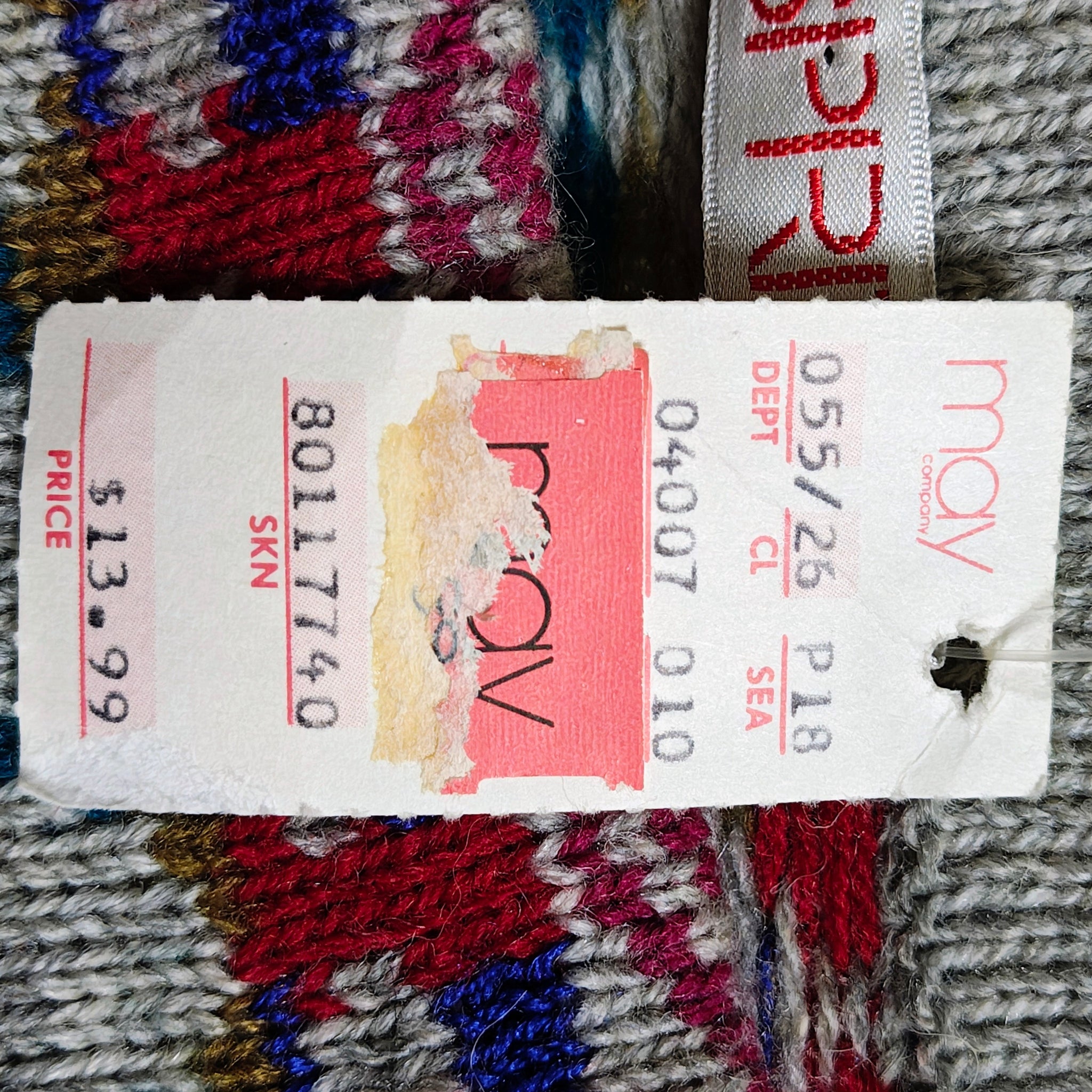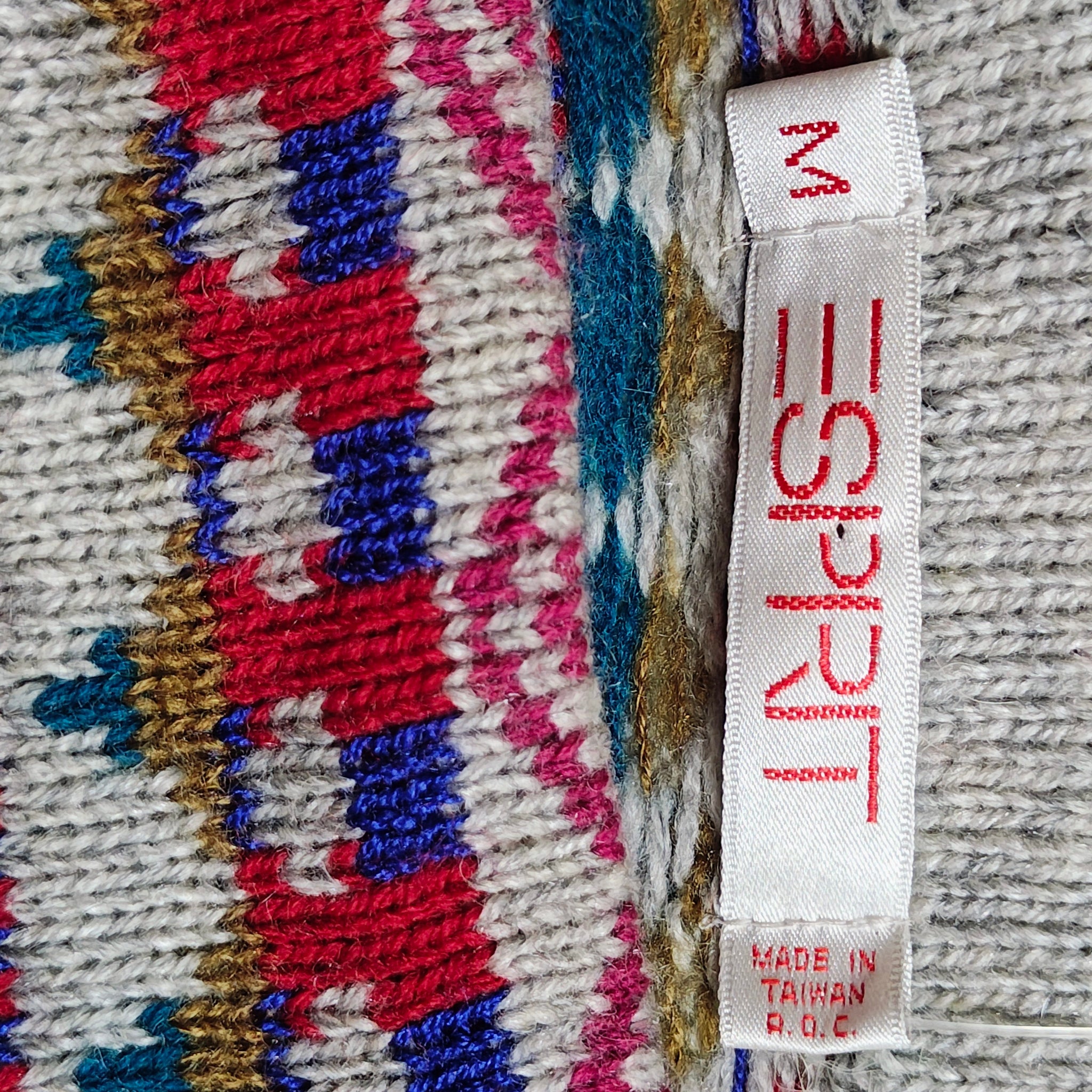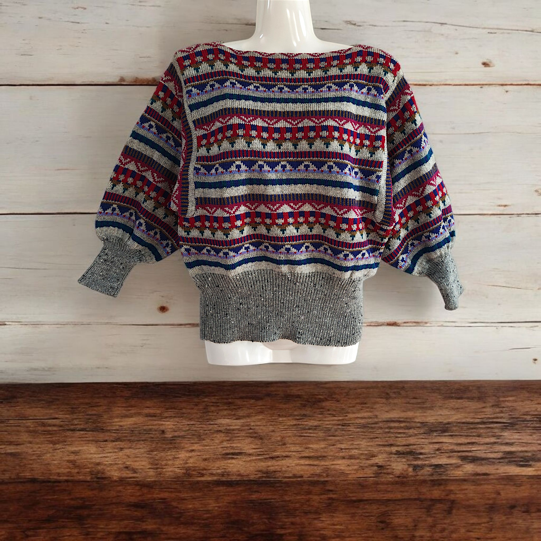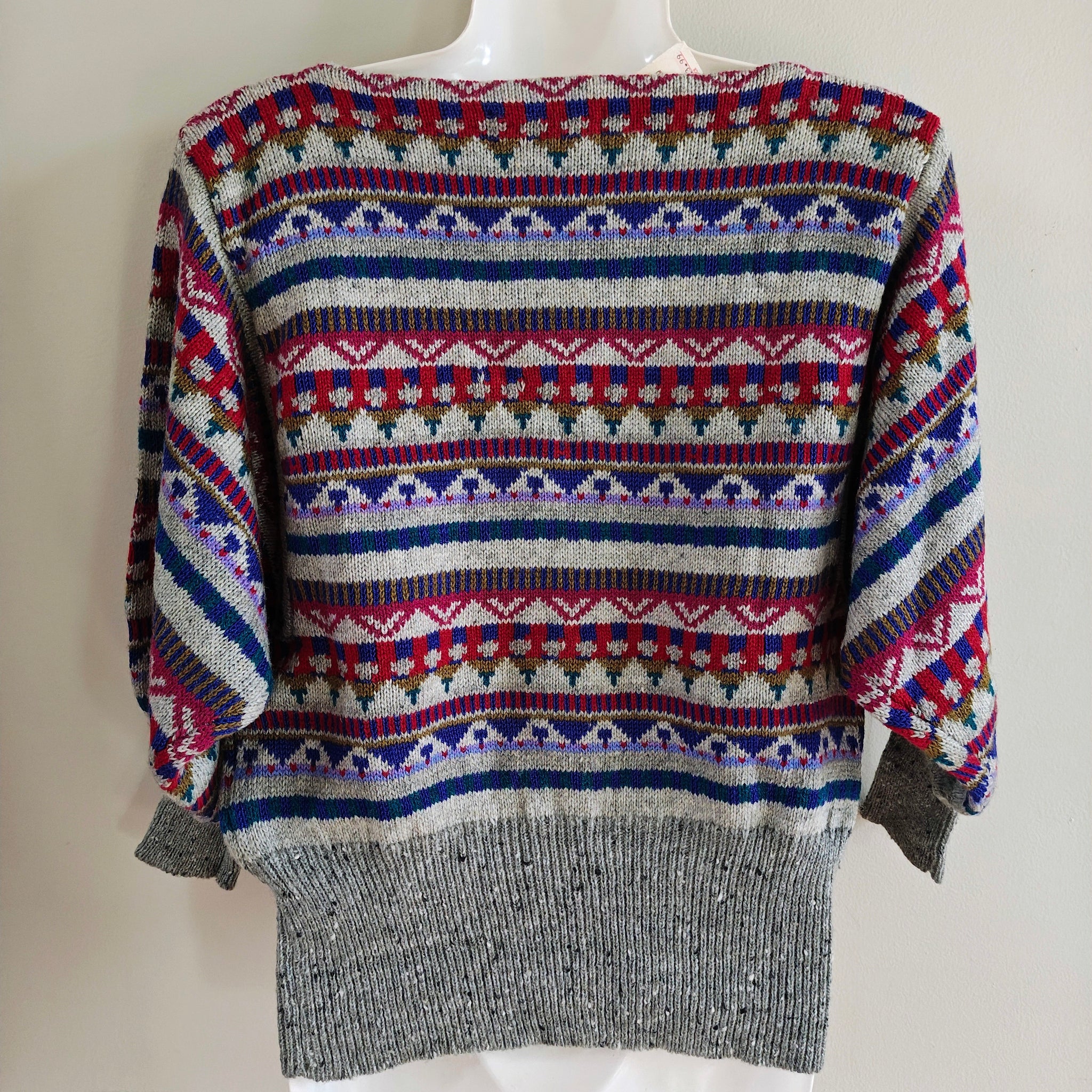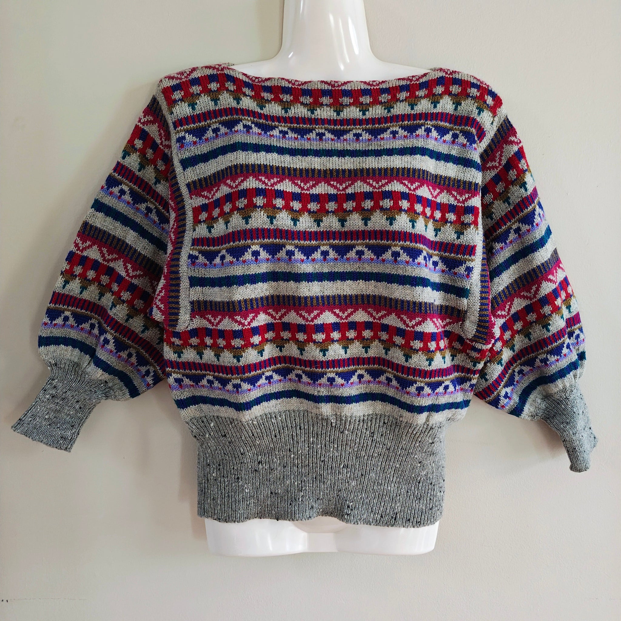 Vintage multi-color Fair Isle or Nordic-patterned sweater. It features a distinctive boat neck, a grey ribbed hem, and batwing sleeves with ribbed cuffs. .