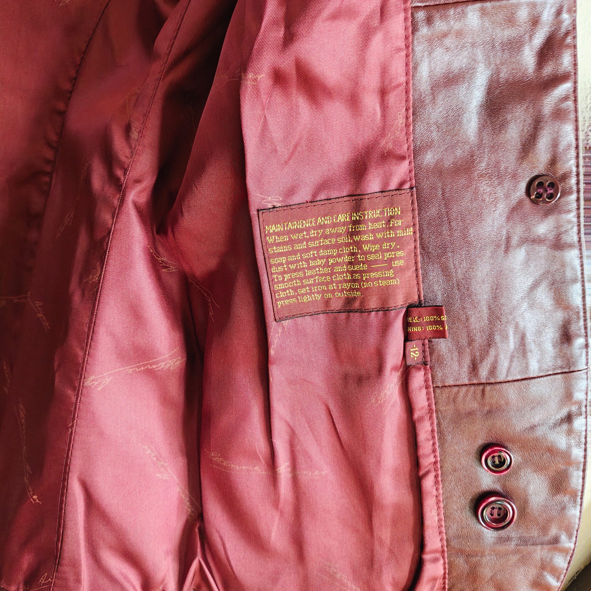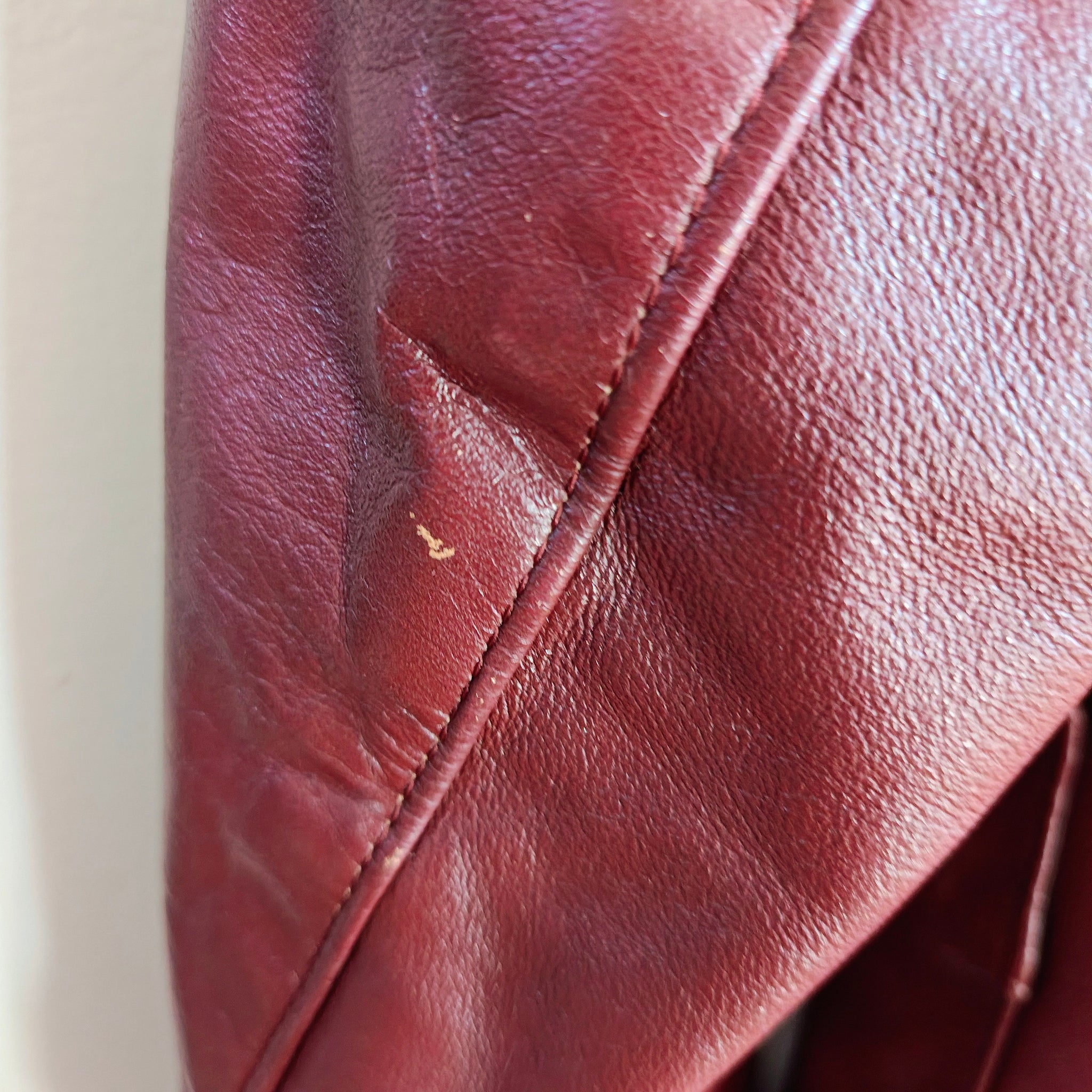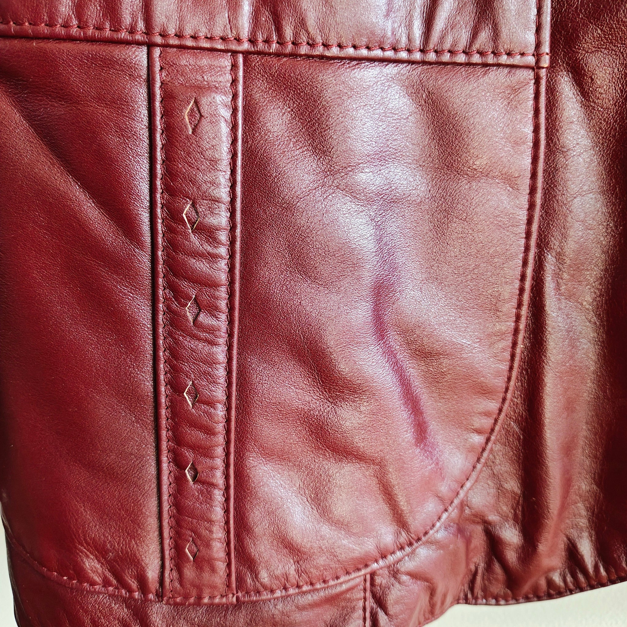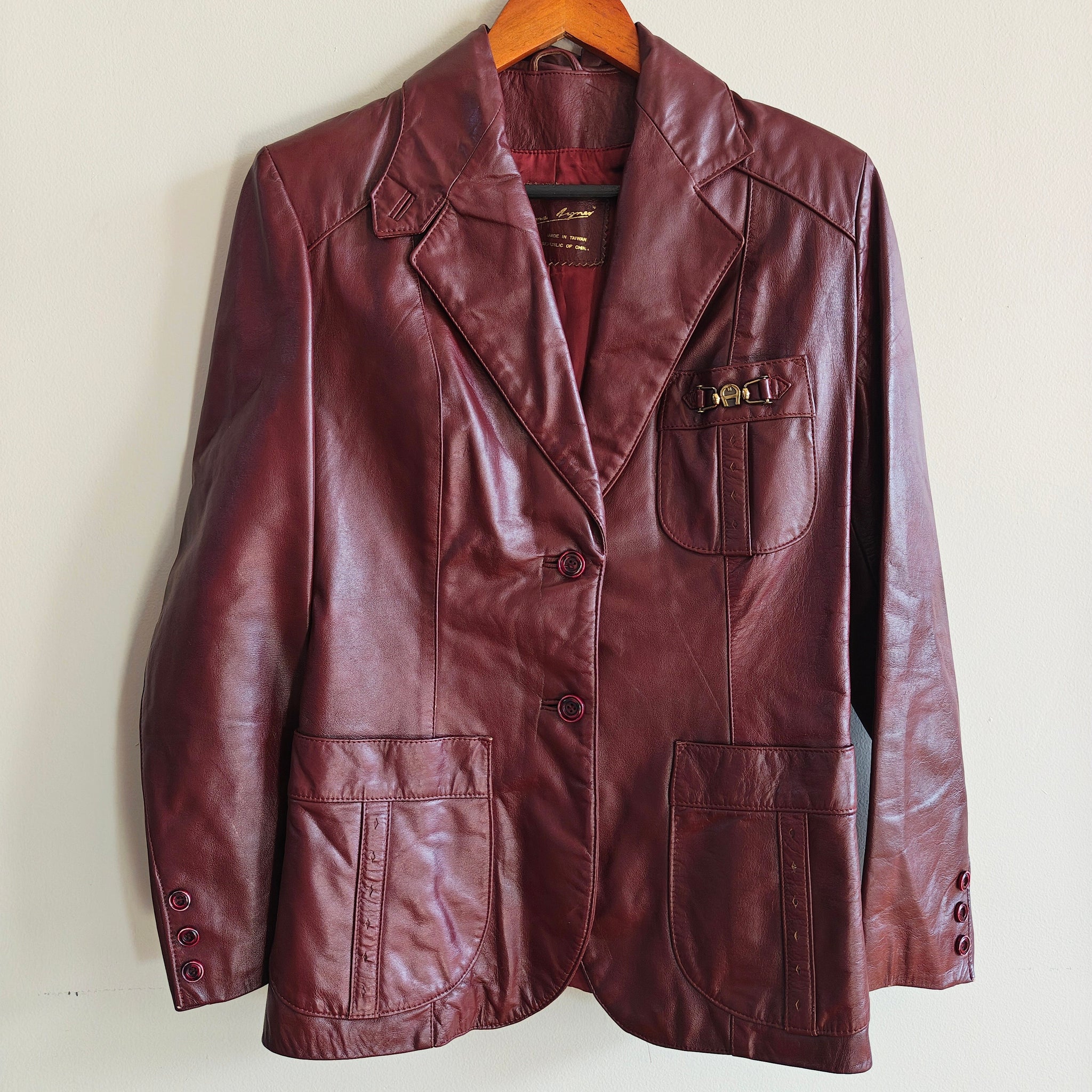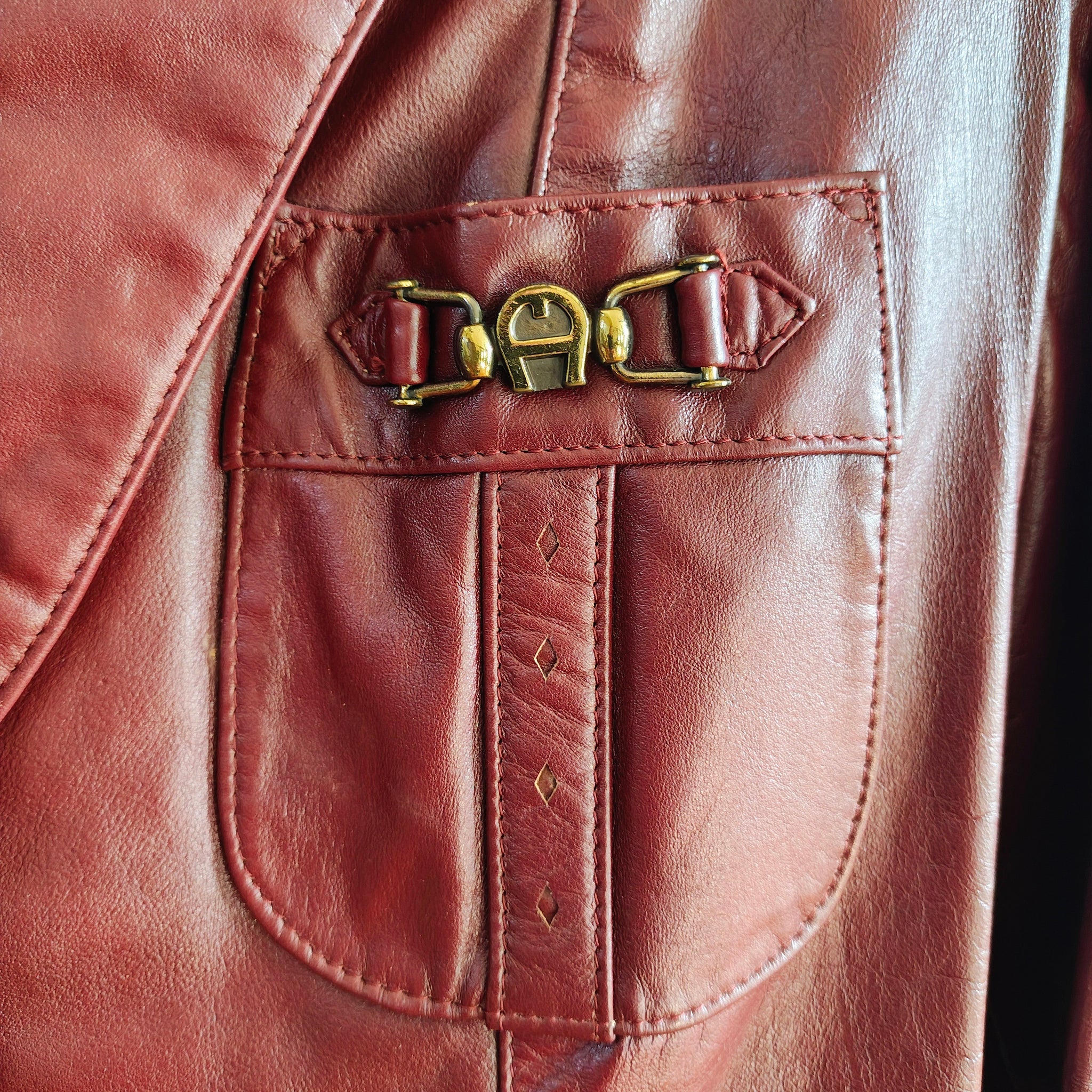 Vintage Etienne Aigner leather blazer in a rich oxblood or burgundy color. This style is characteristic of the 1970s and 1980s and features the brand's signature details.