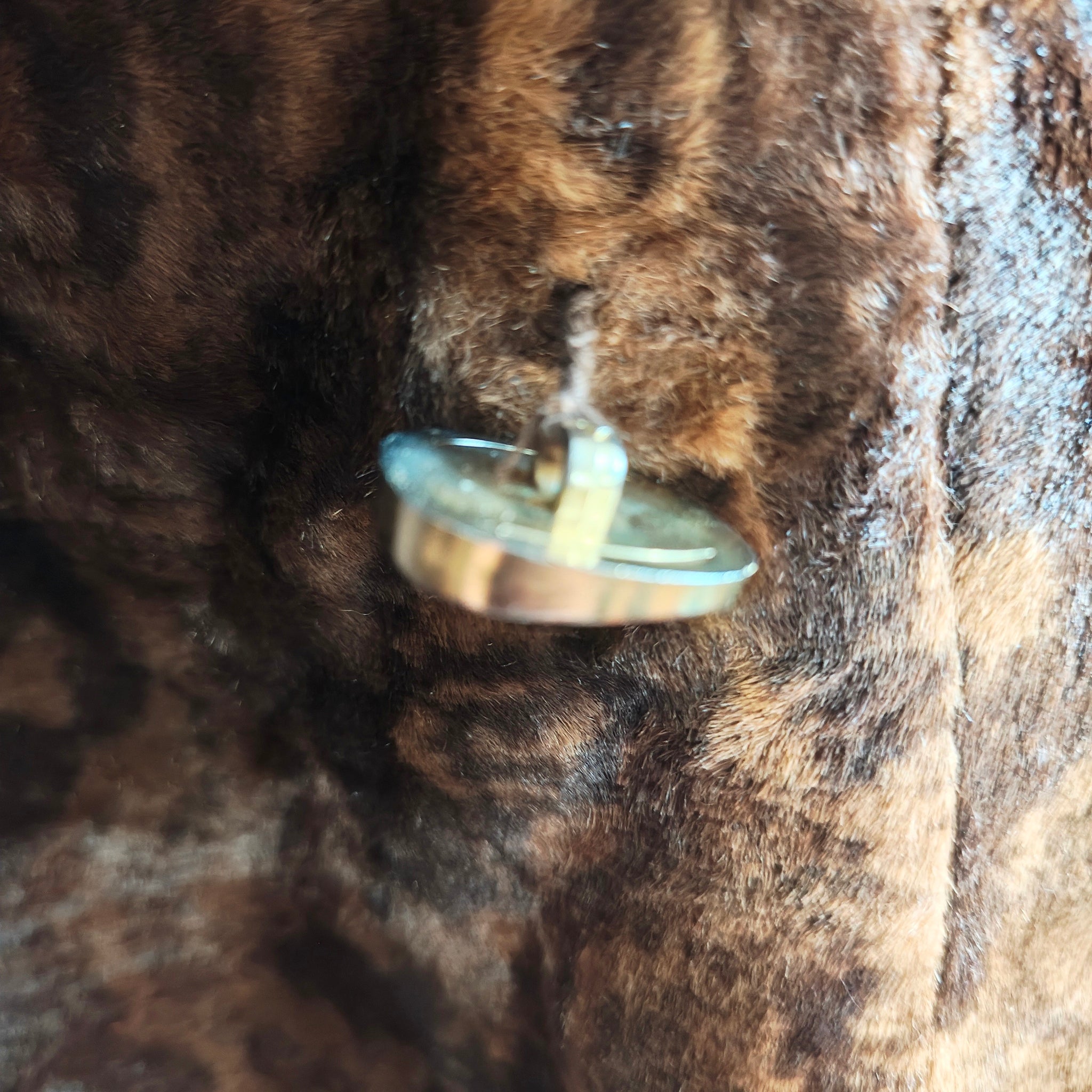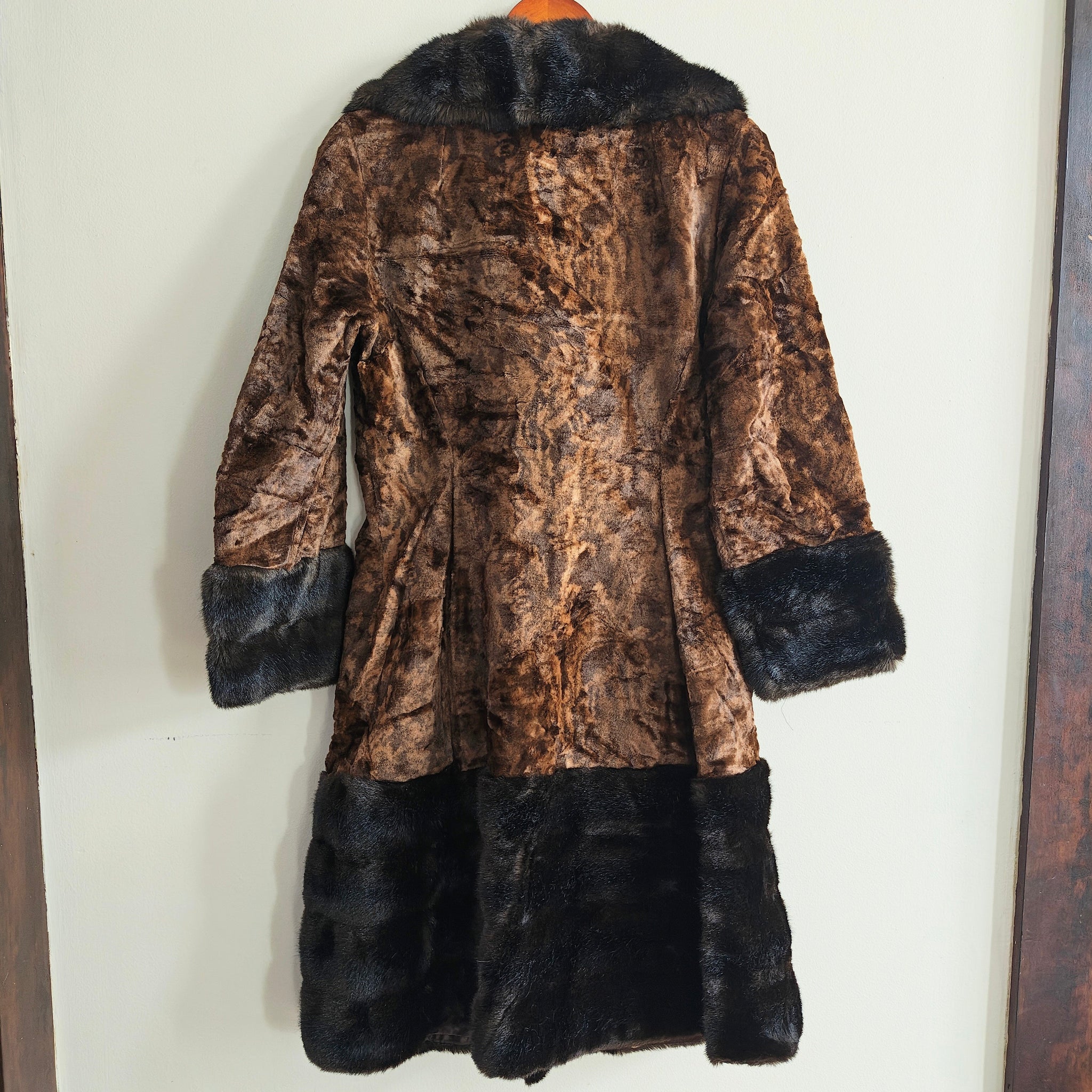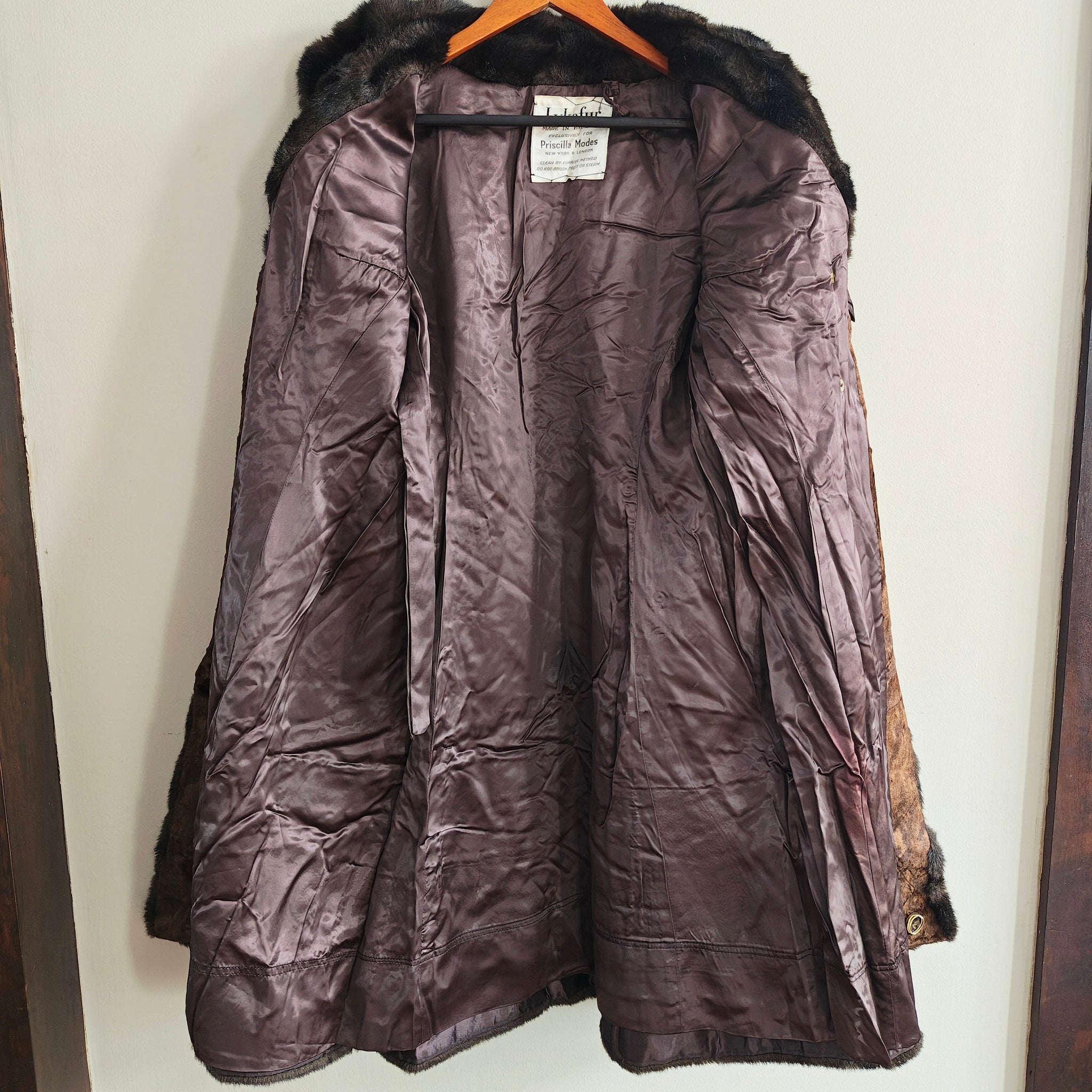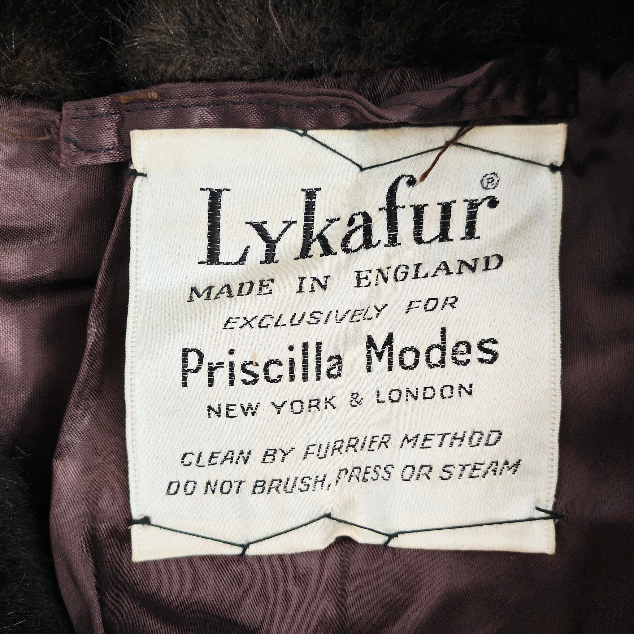 Vintage Lykafur faux fur coat, likely from the late 1960s or 1970s, made for the "Priscilla Modes" brand, which had locations in New York and London. It features a distinctive two-tone design with a variegated brown body and contrasting black faux fur on the collar, cuffs, and hem.