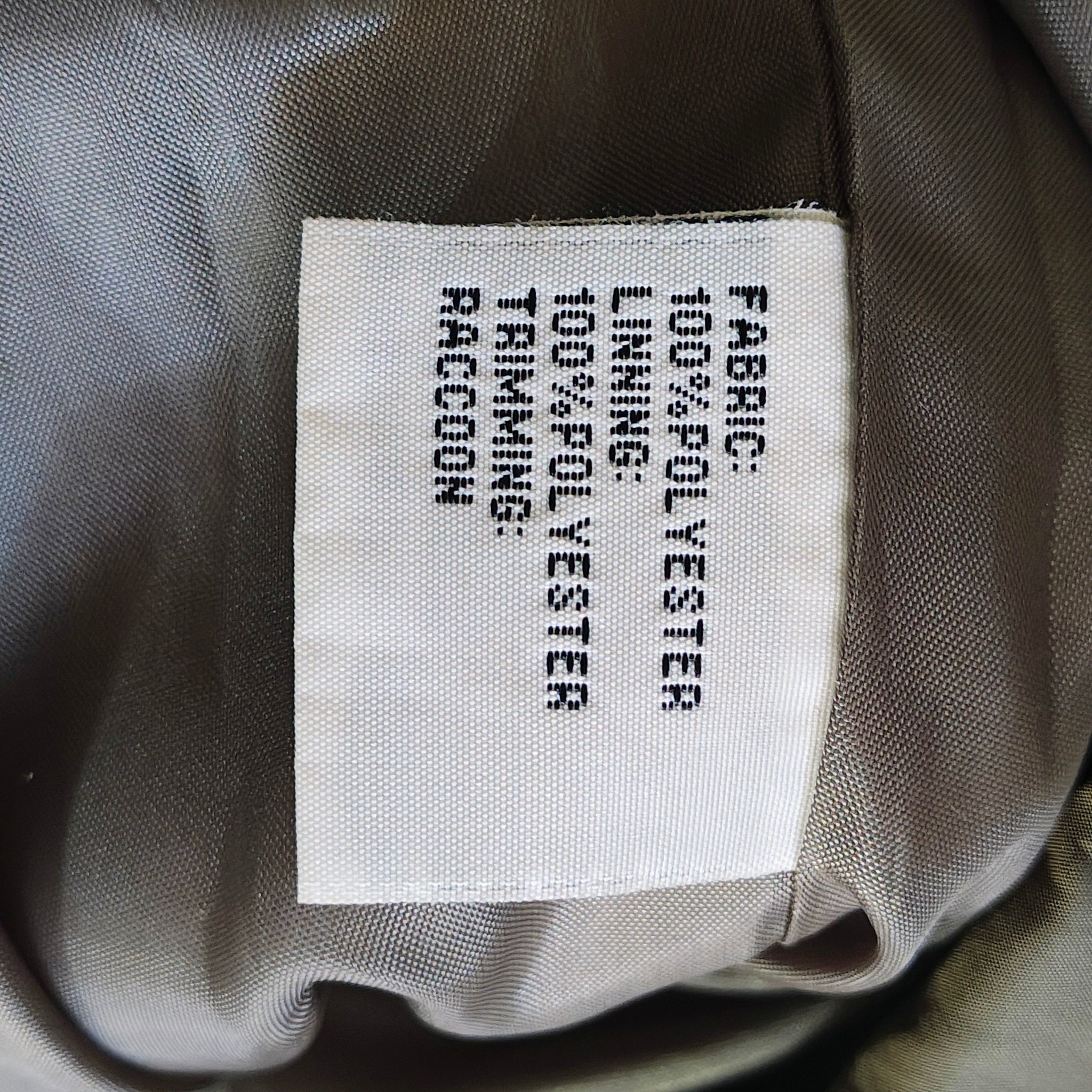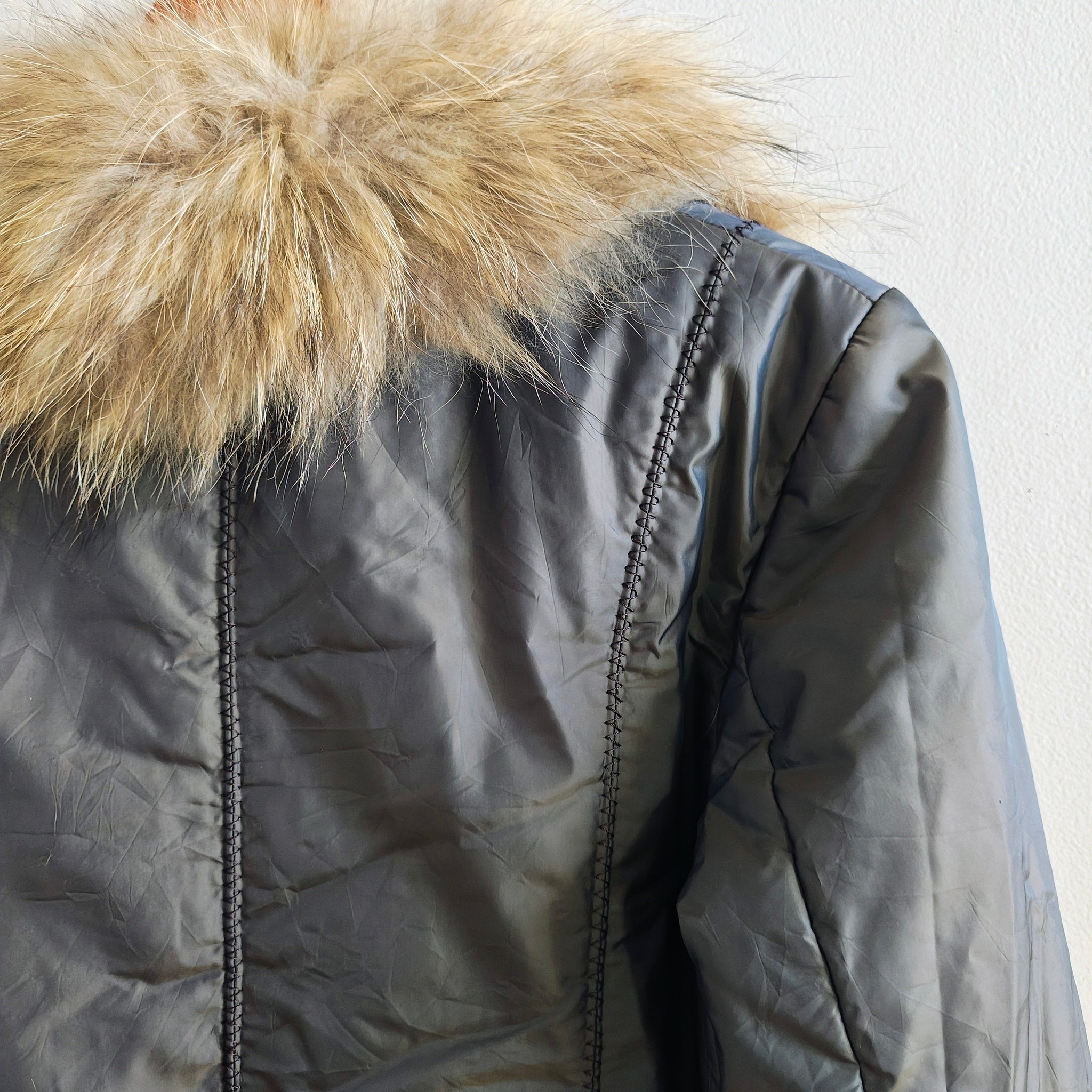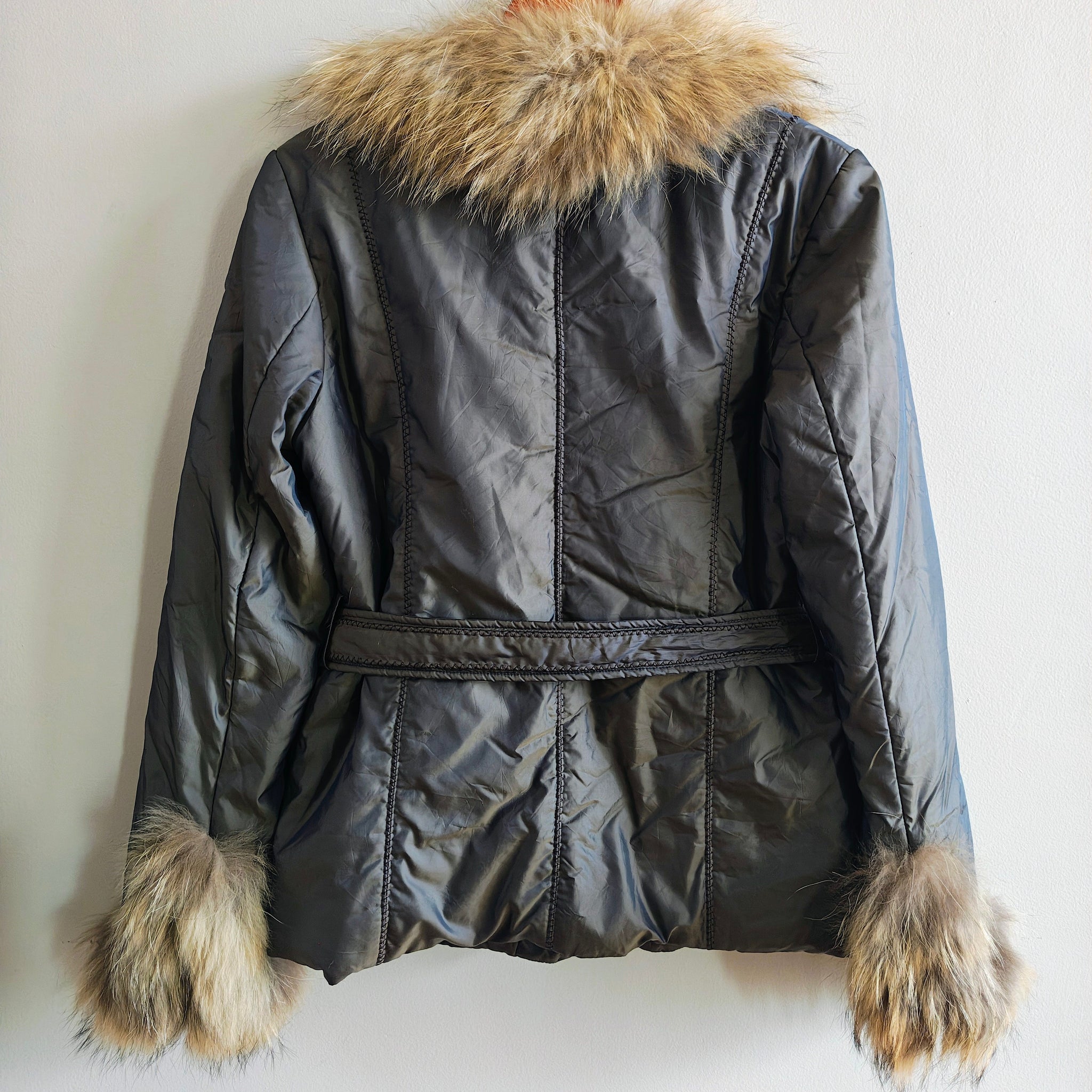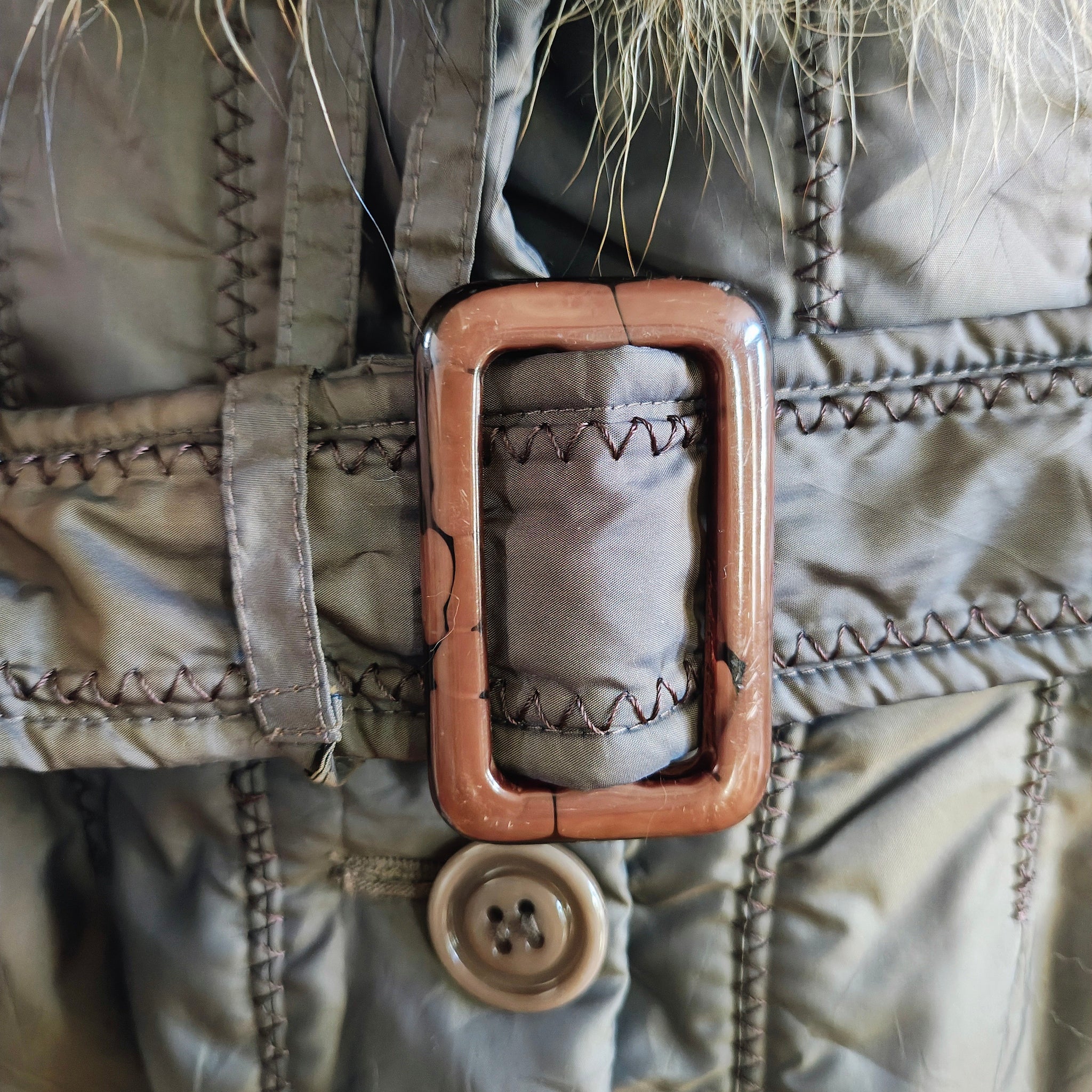 Short belted quilted jacket with a large fur collar and fur cuffs, in an olive-grey color. It features a quilted polyester shell, a belted waist, and substantial raccoon fur trim.