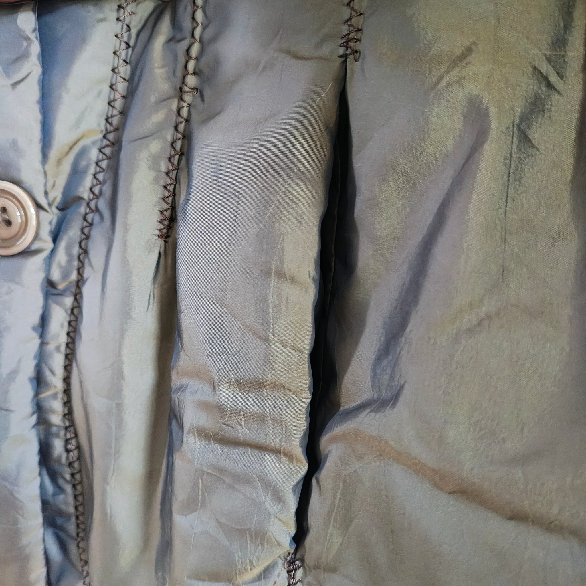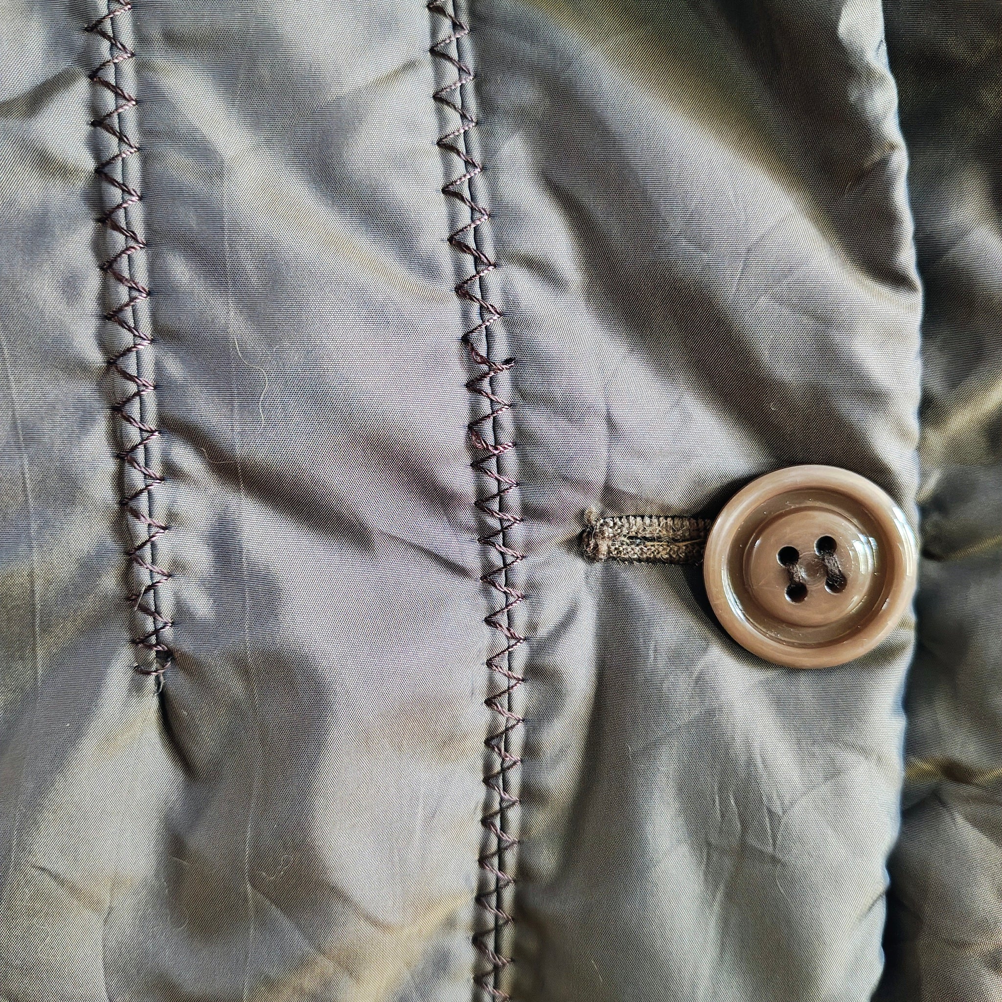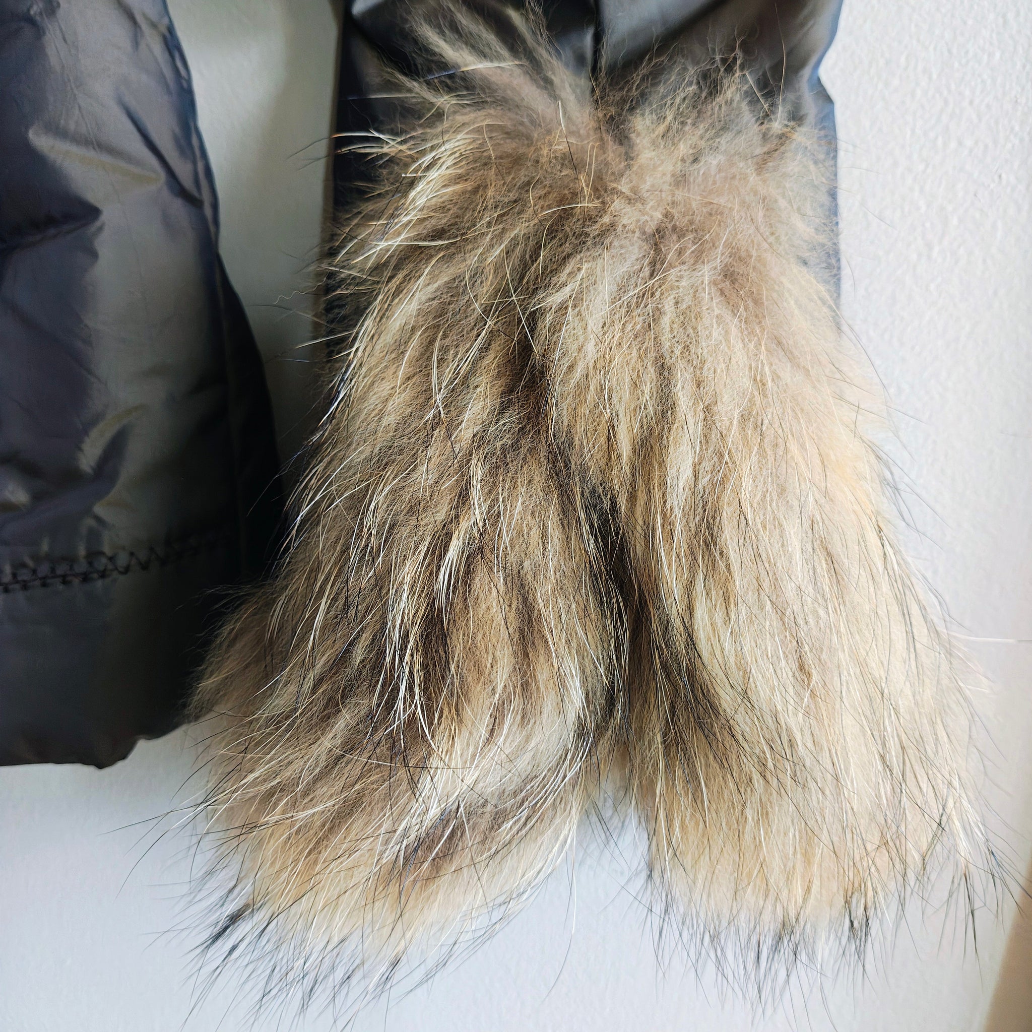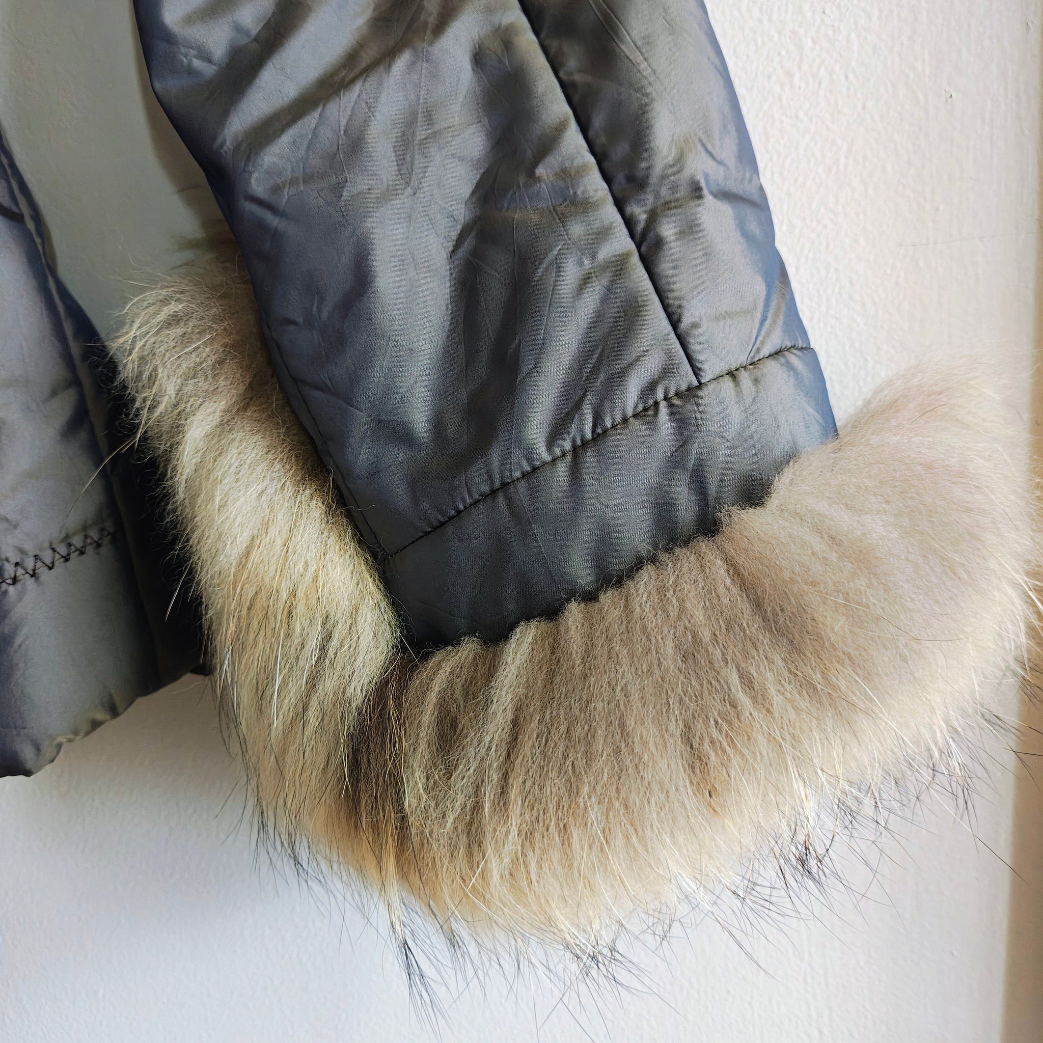 Short belted quilted jacket with a large fur collar and fur cuffs, in an olive-grey color. It features a quilted polyester shell, a belted waist, and substantial raccoon fur trim.