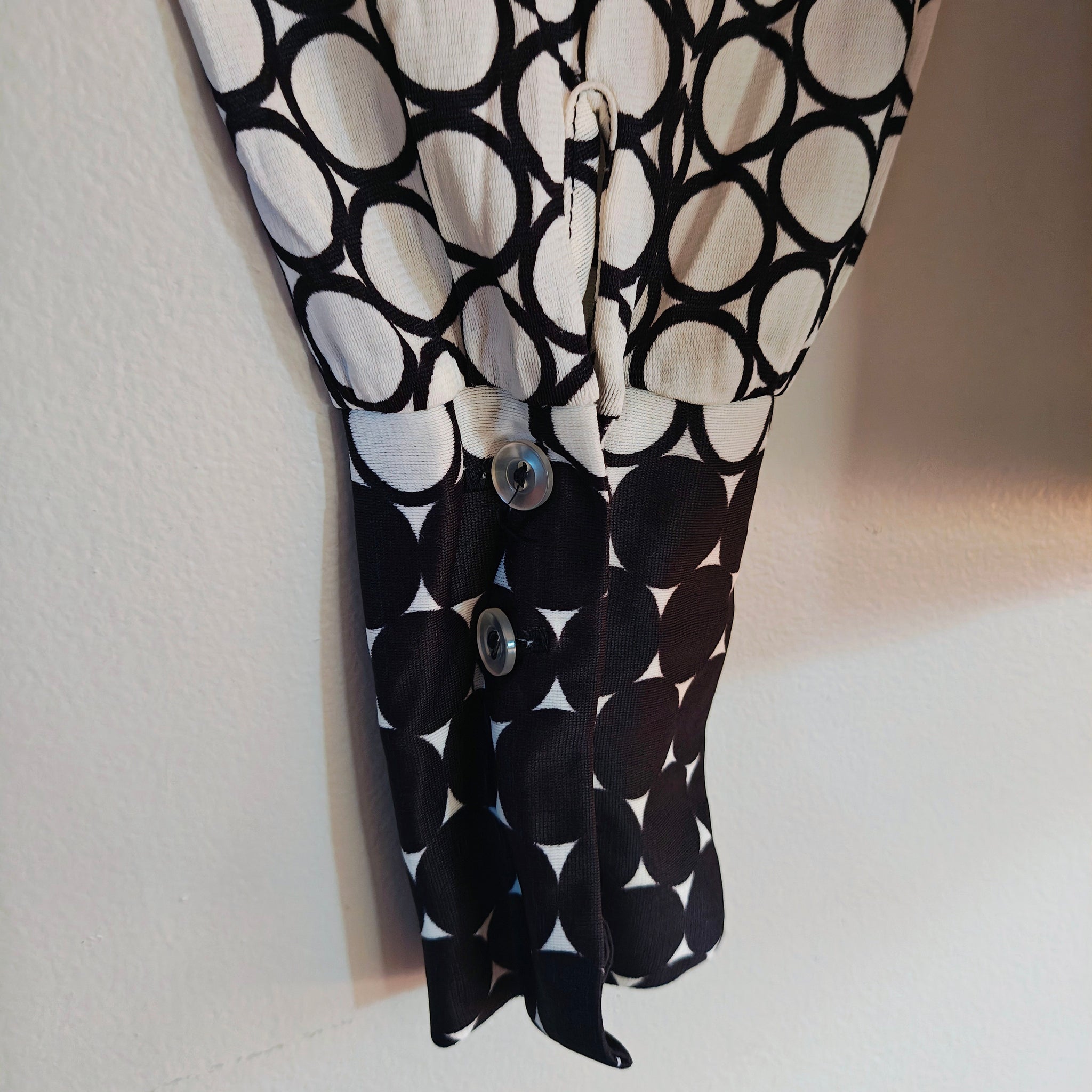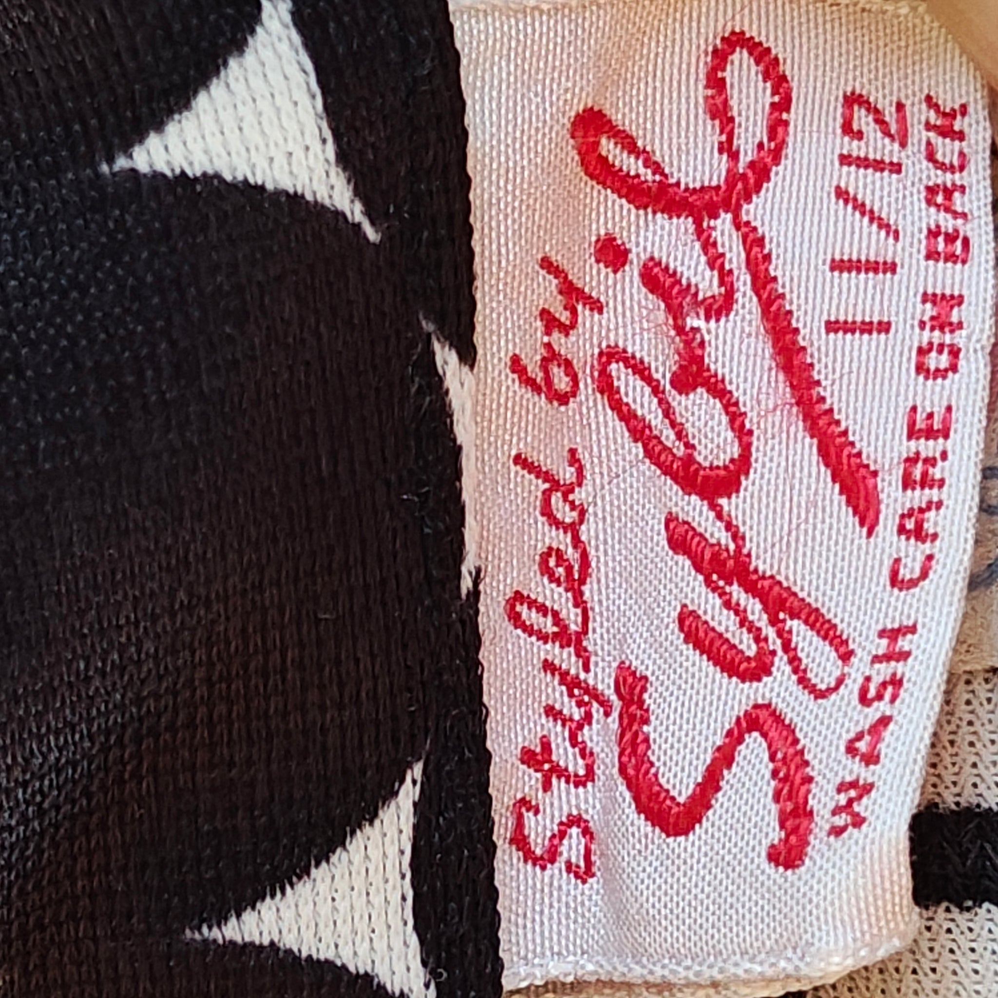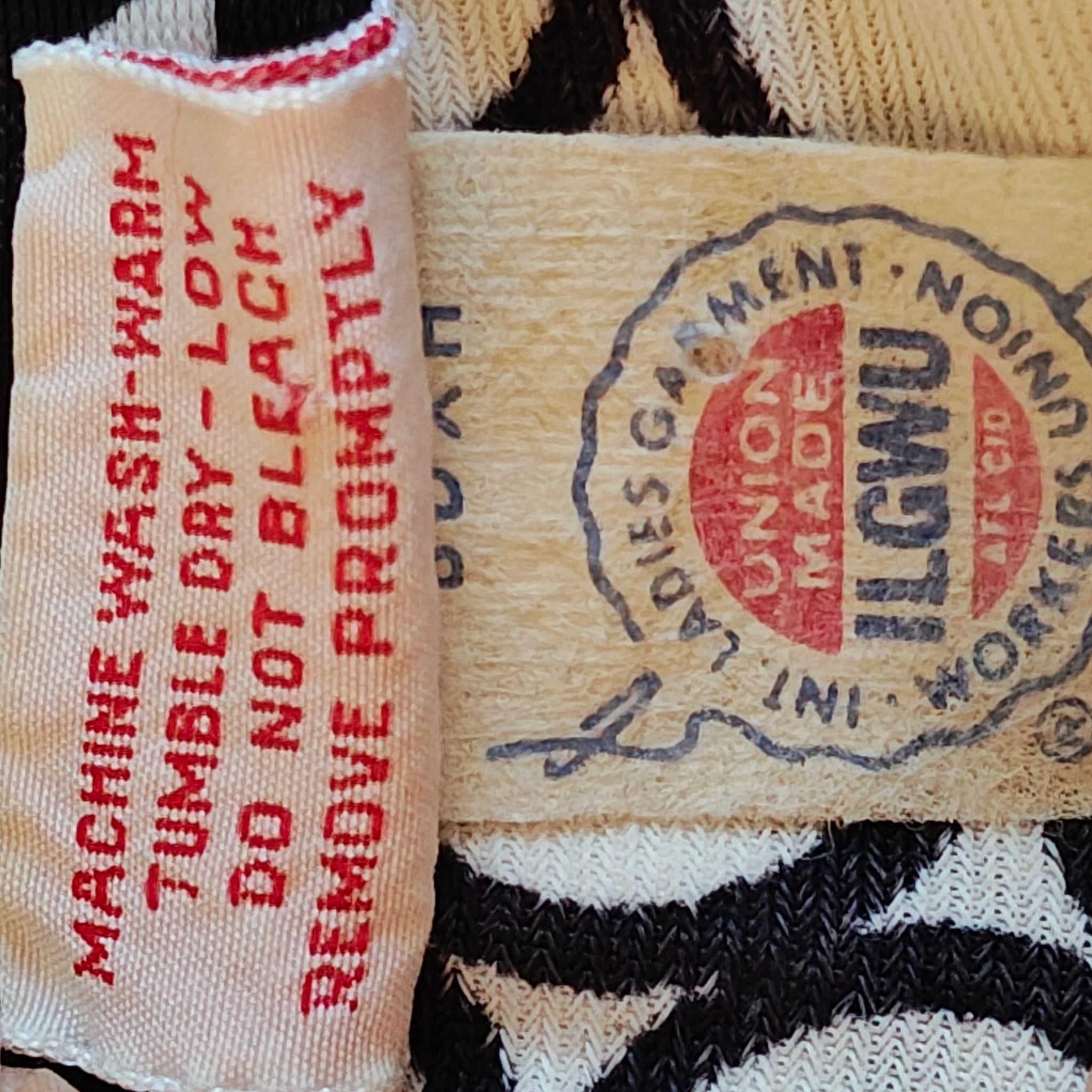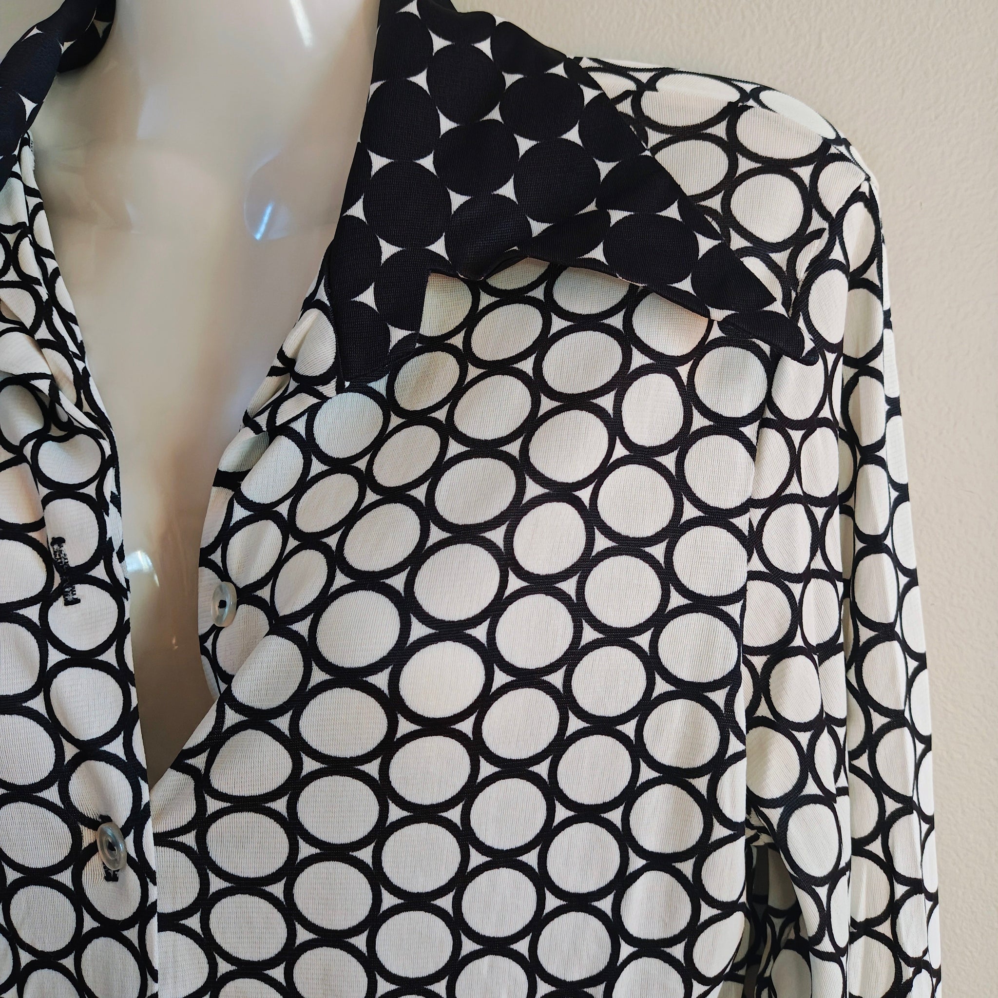 Era: The material (polyester knit) and the large, pointed (dagger) collar suggest a 1970s vintage style.