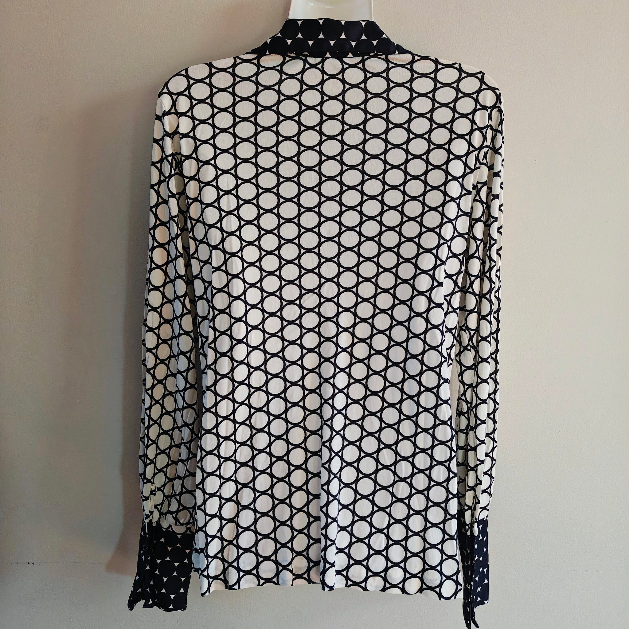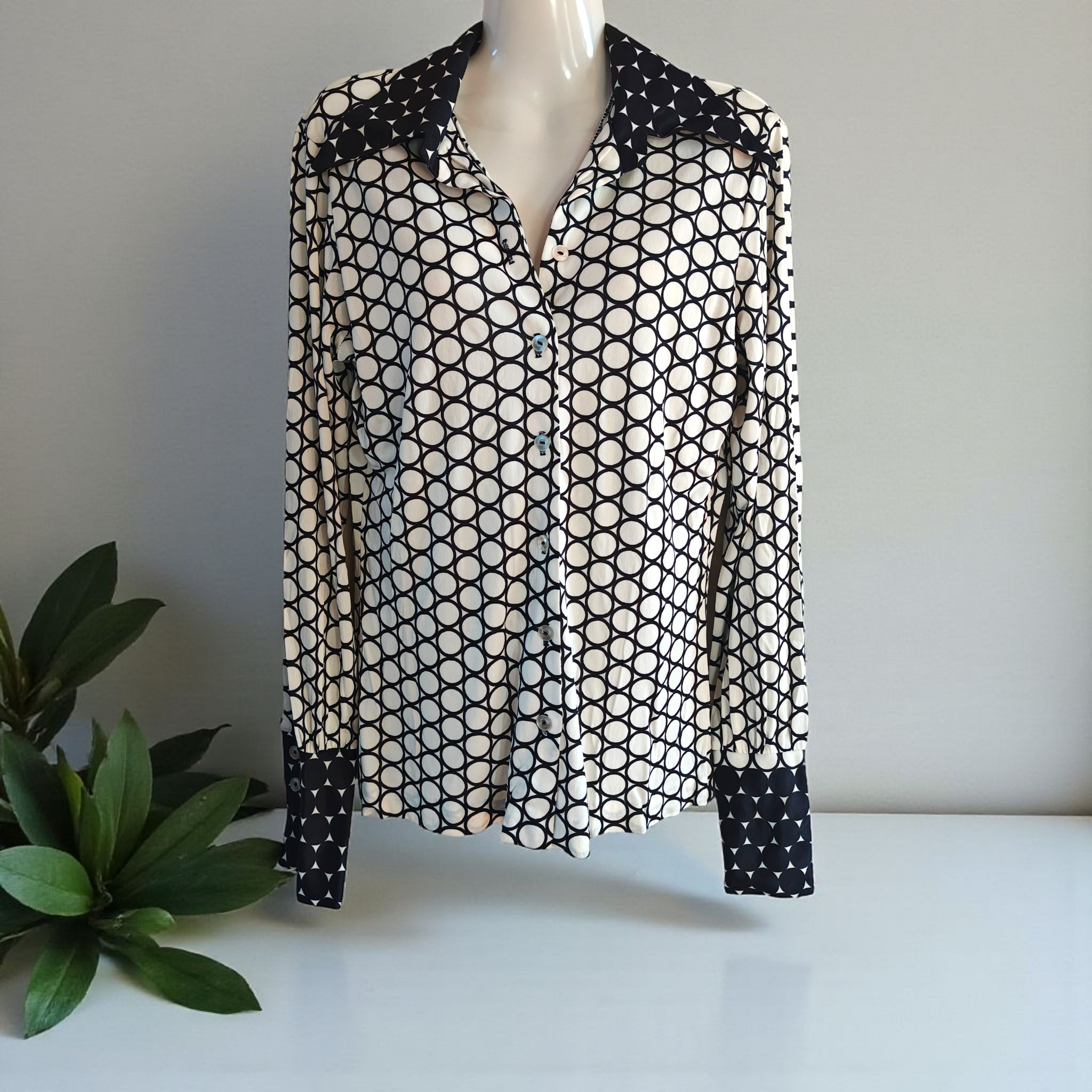 Vintage shirt with collared neckline, a full button-front closure, long sleeves with button cuffs, and a contrasting dark collar and cuffs.