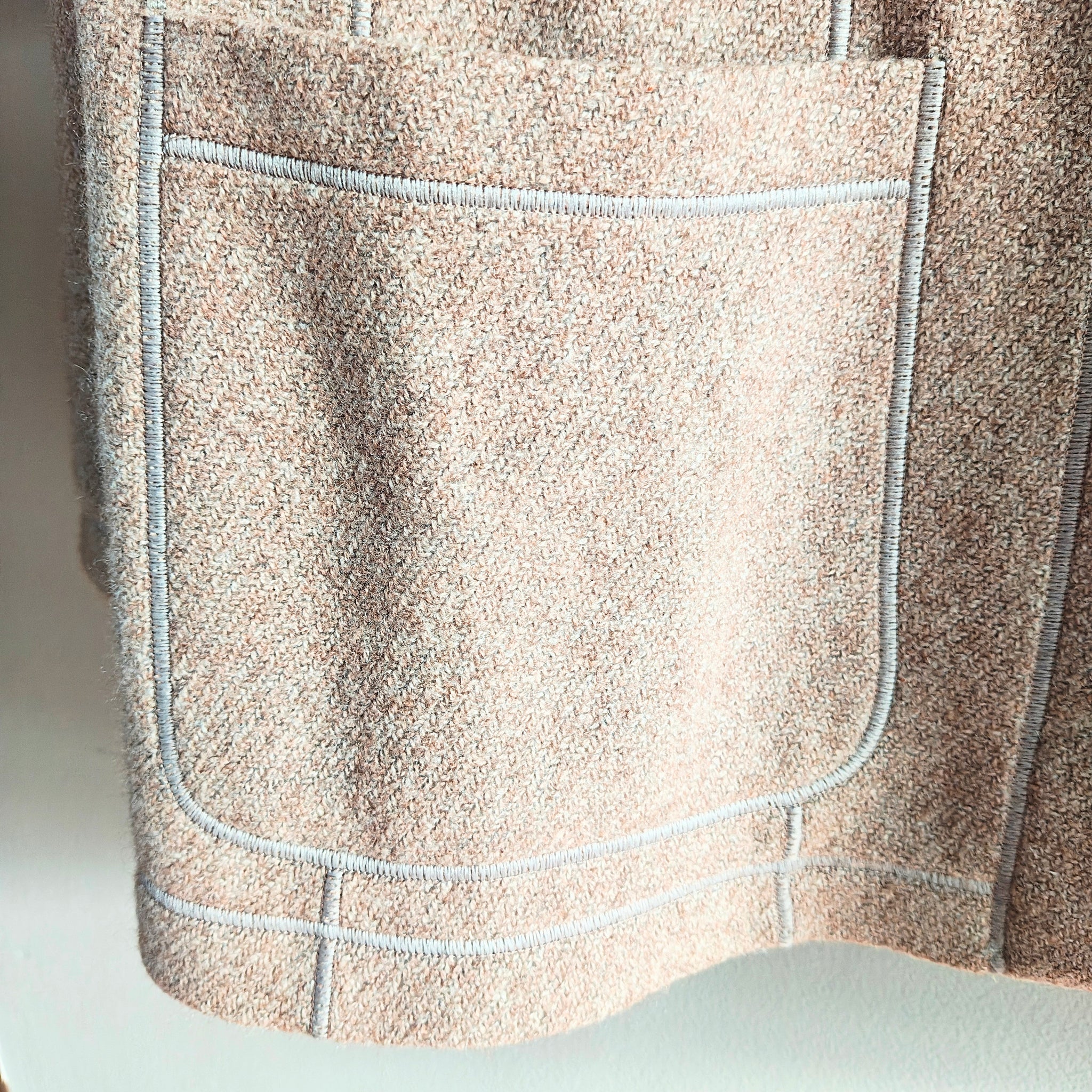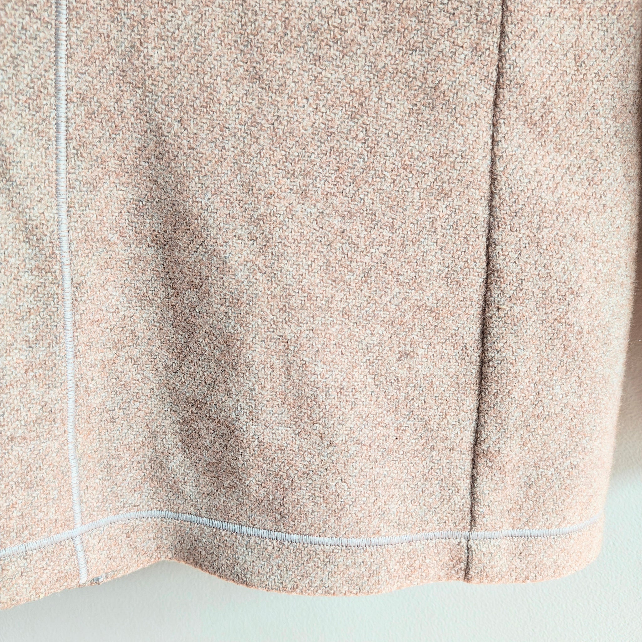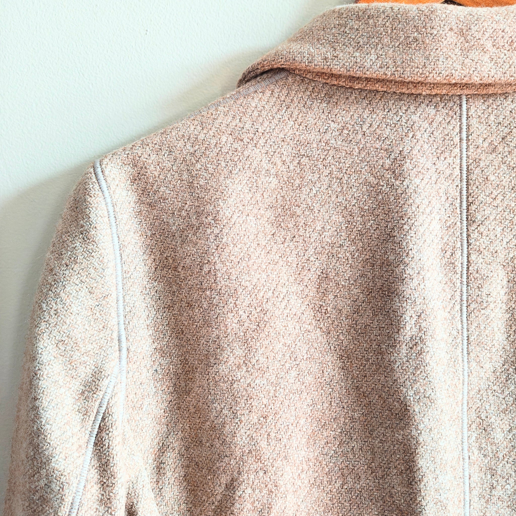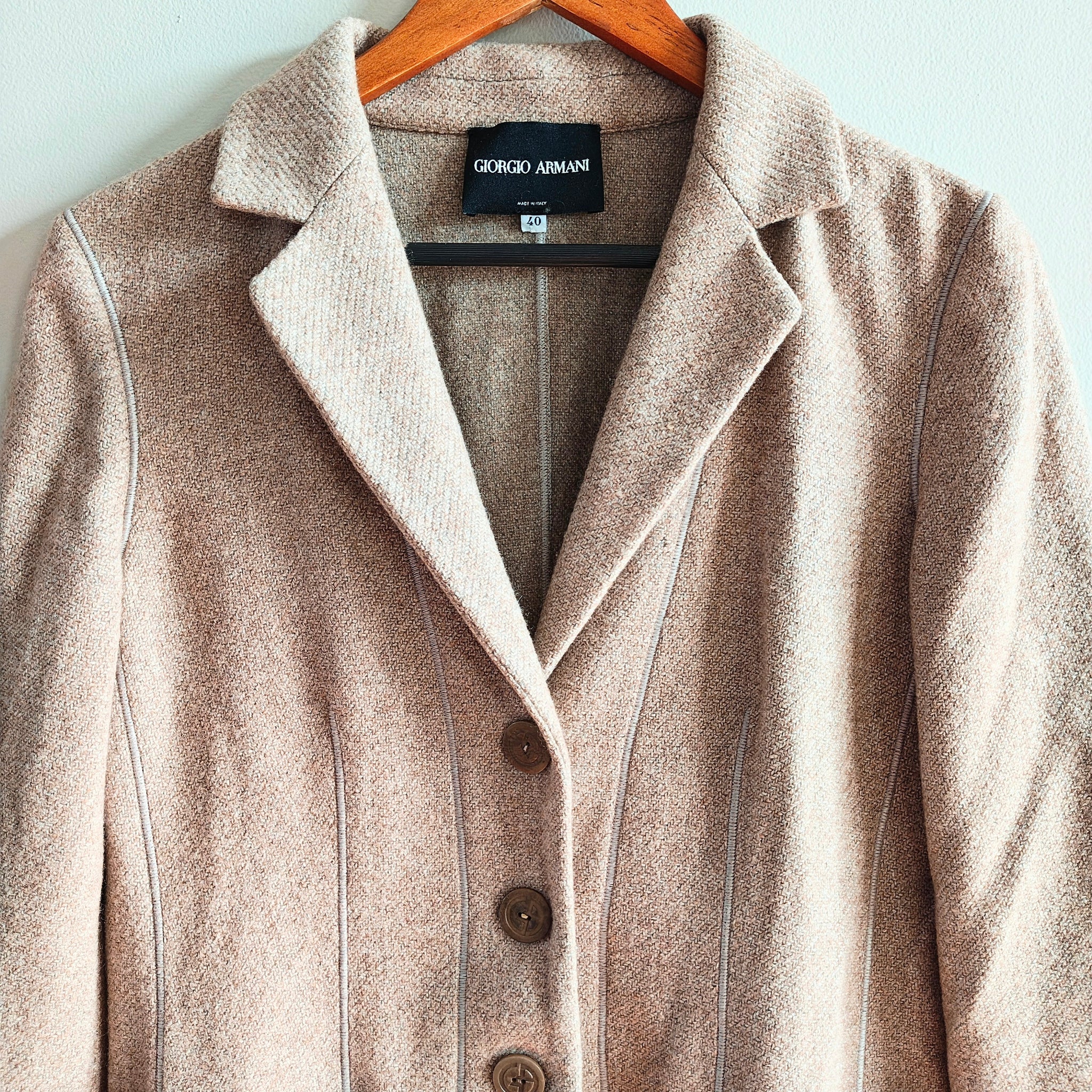 Vintage Giorgio Armani single-breasted blazer for women, likely from the "Le Collezioni" or a similar mainline, made of a beige tweed wool and cashmere blend. The tag indicates a size 40 (Italian sizing), which generally corresponds to a US size 4 or 6.