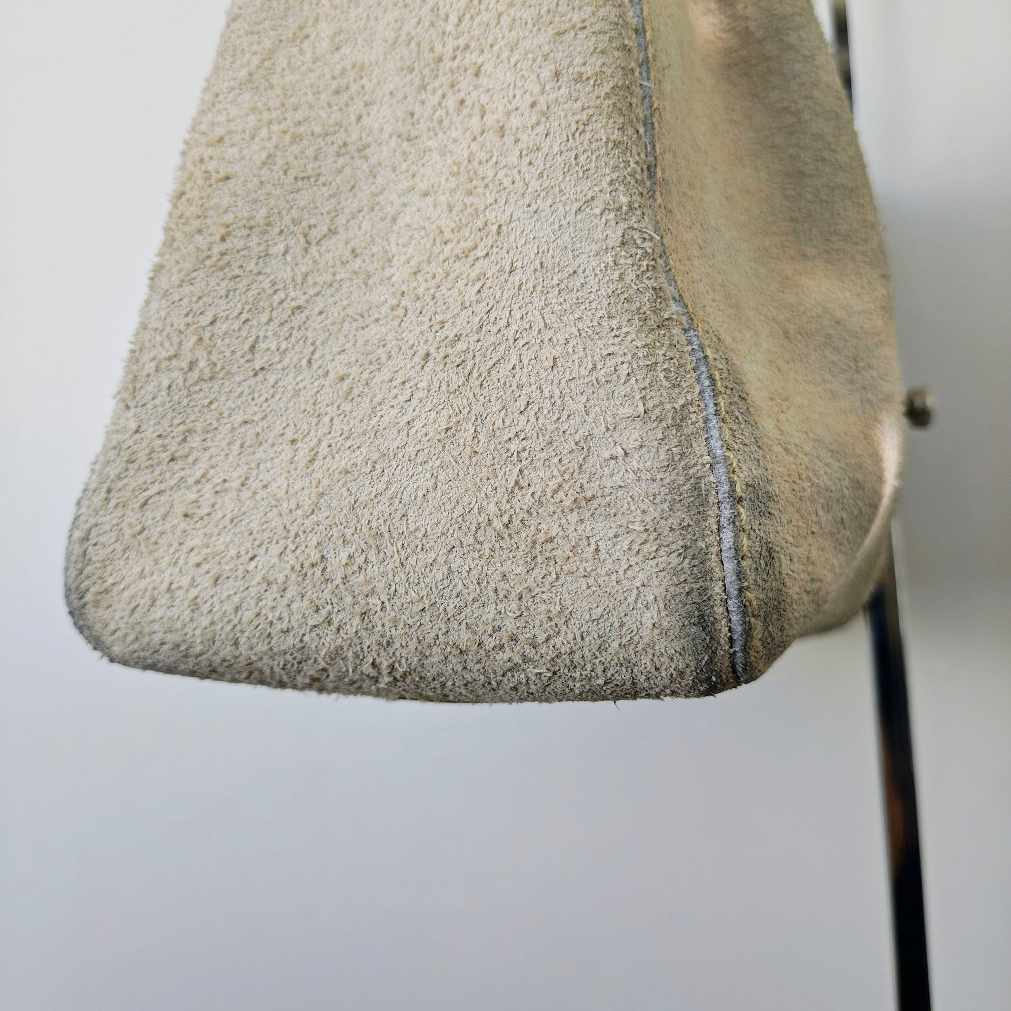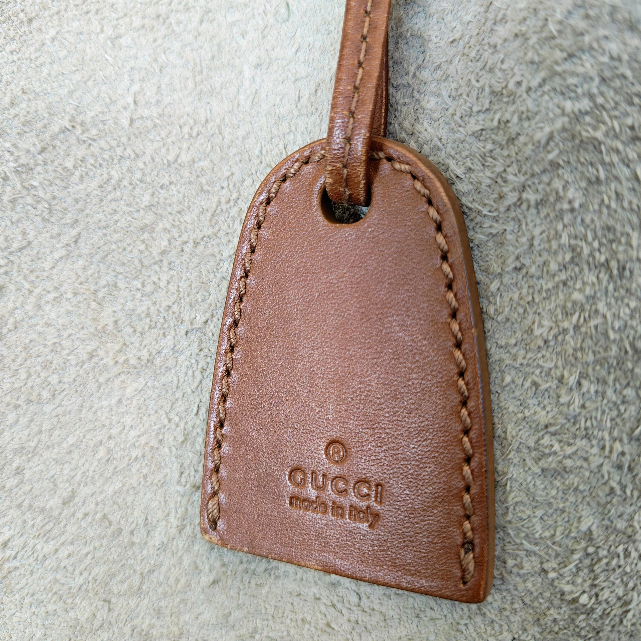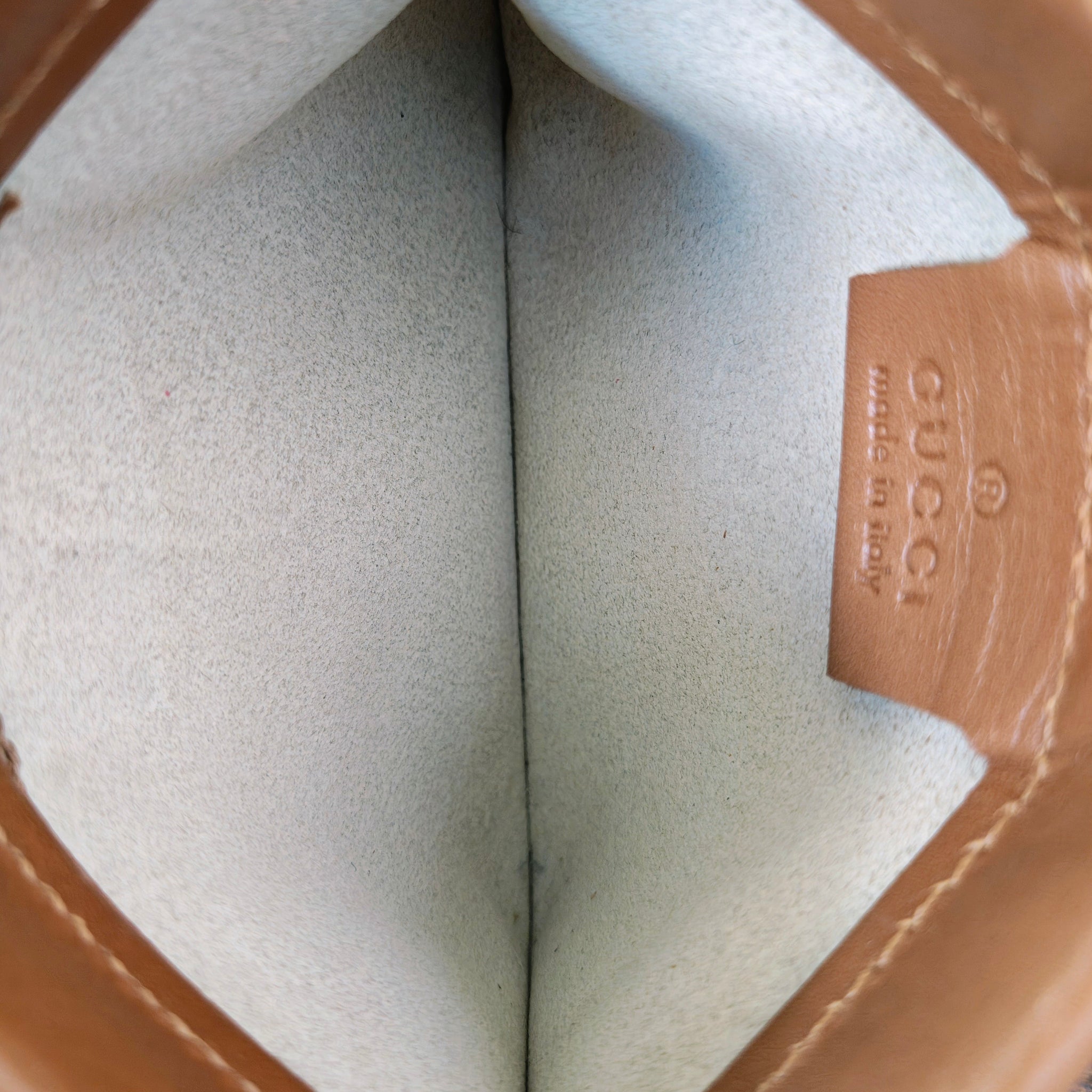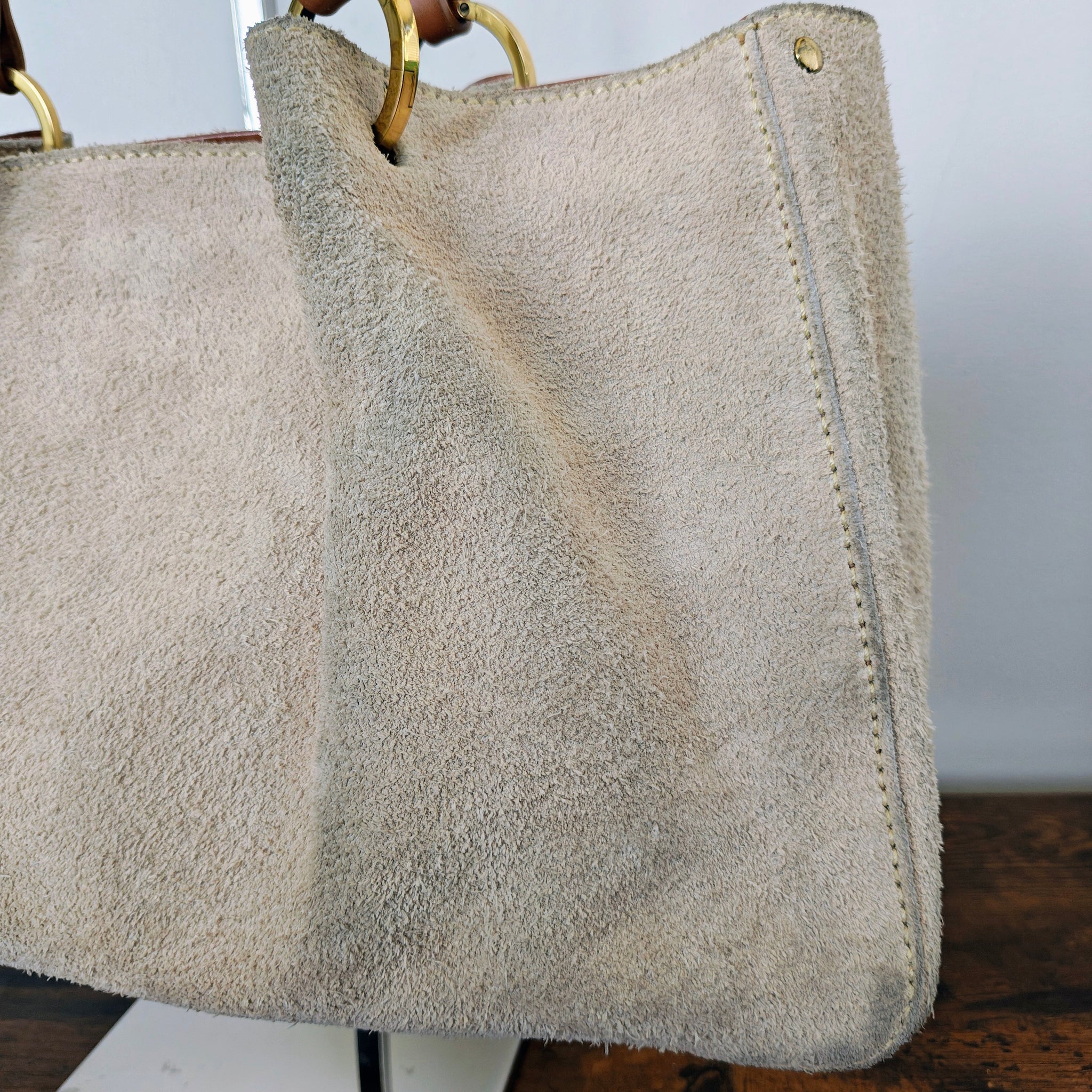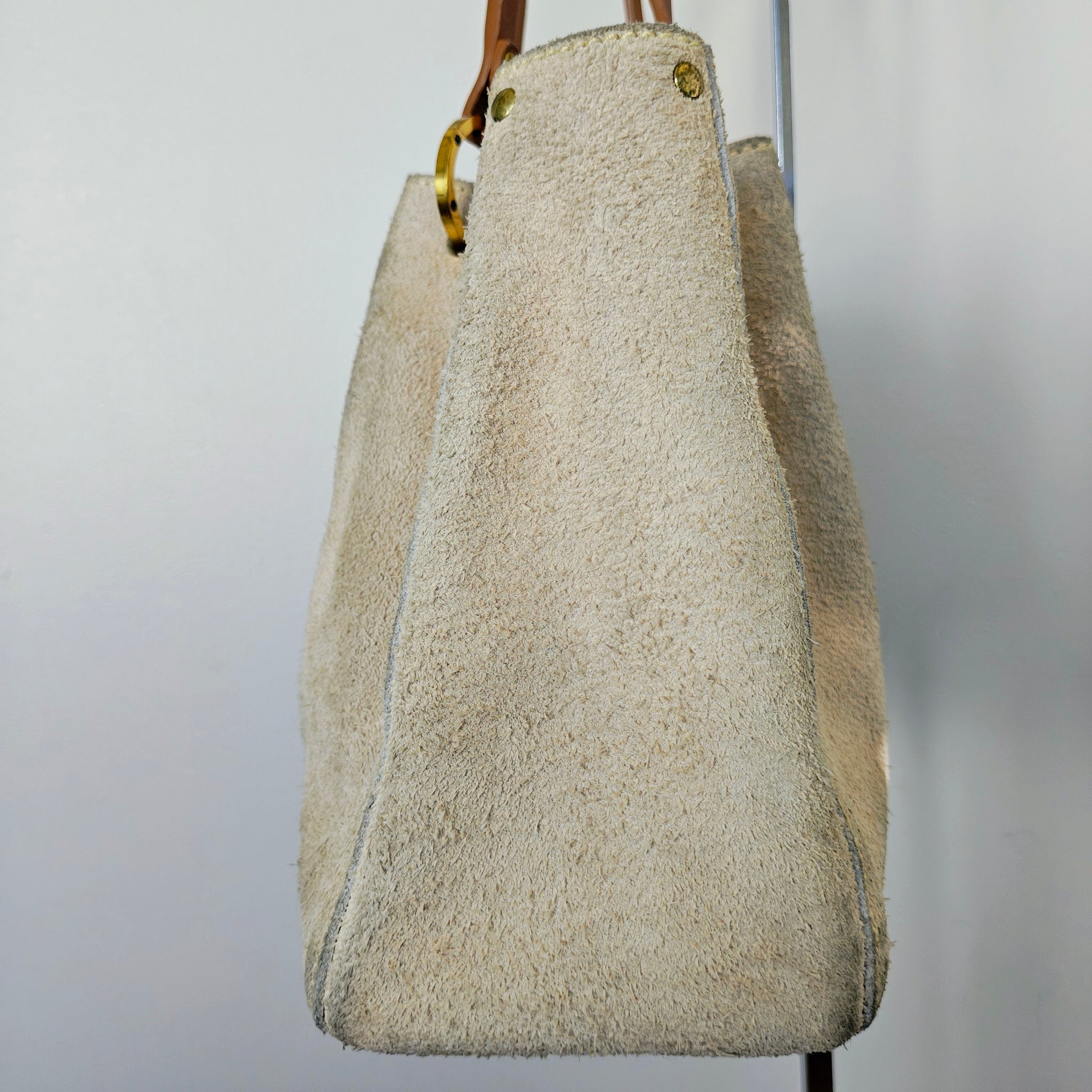 An understated yet elegant design from Gucci, this beige suede tote features smooth tan leather handles and base, detailed with gold hardware. The spacious open interior and matching detachable pouch make it perfect for everyday use while maintaining a refined, classic look.