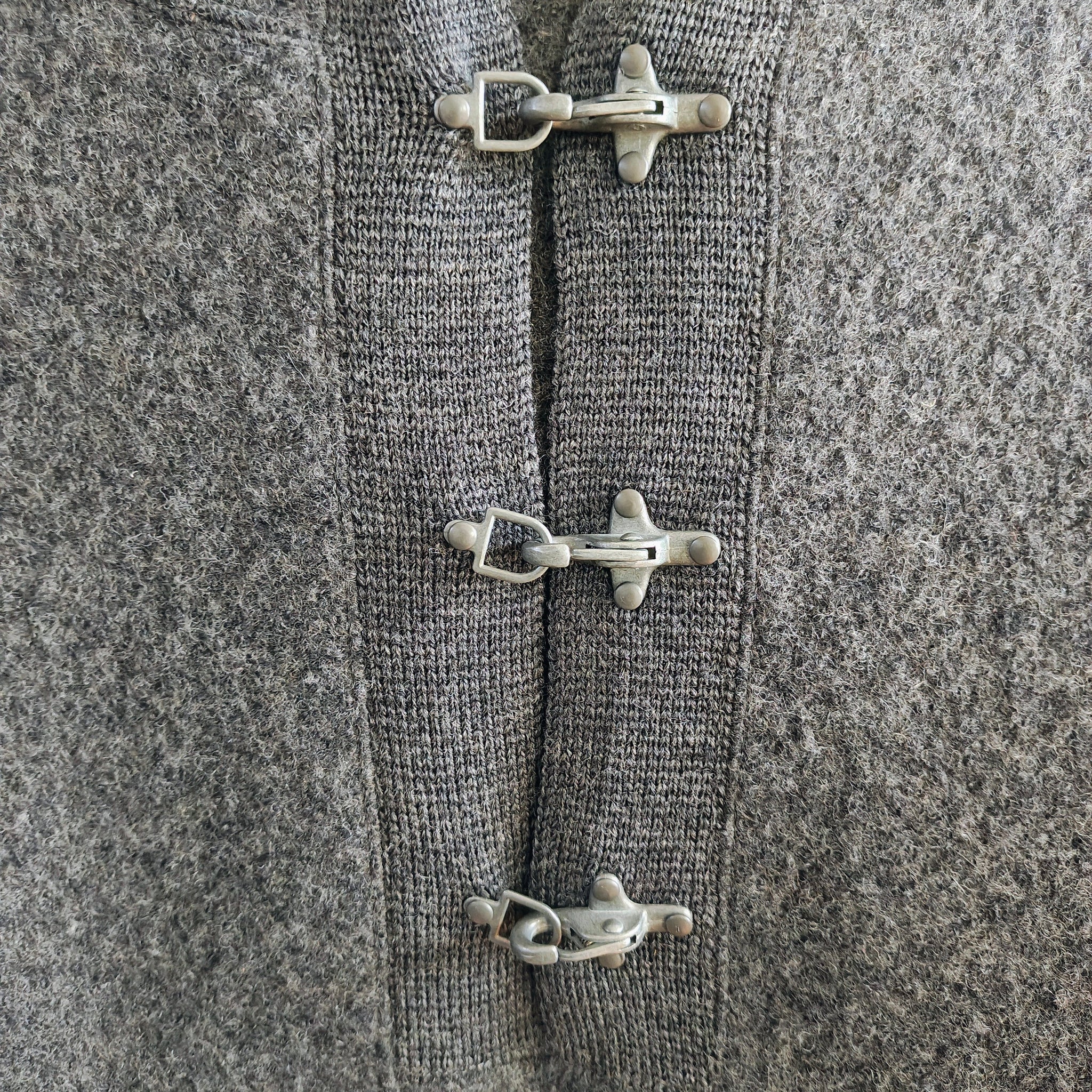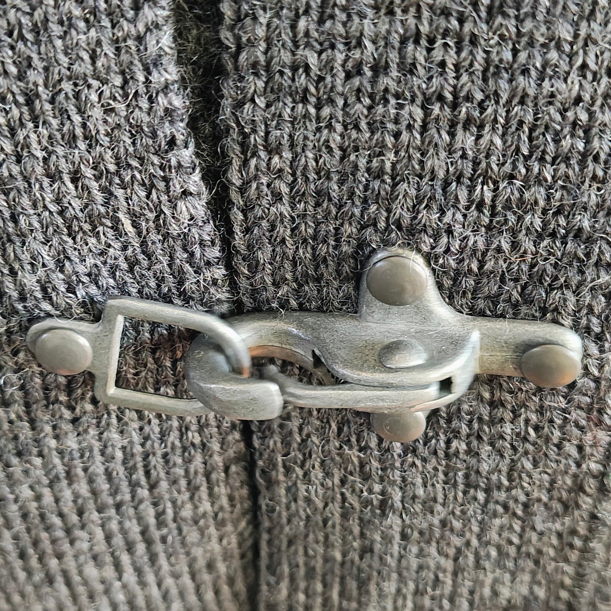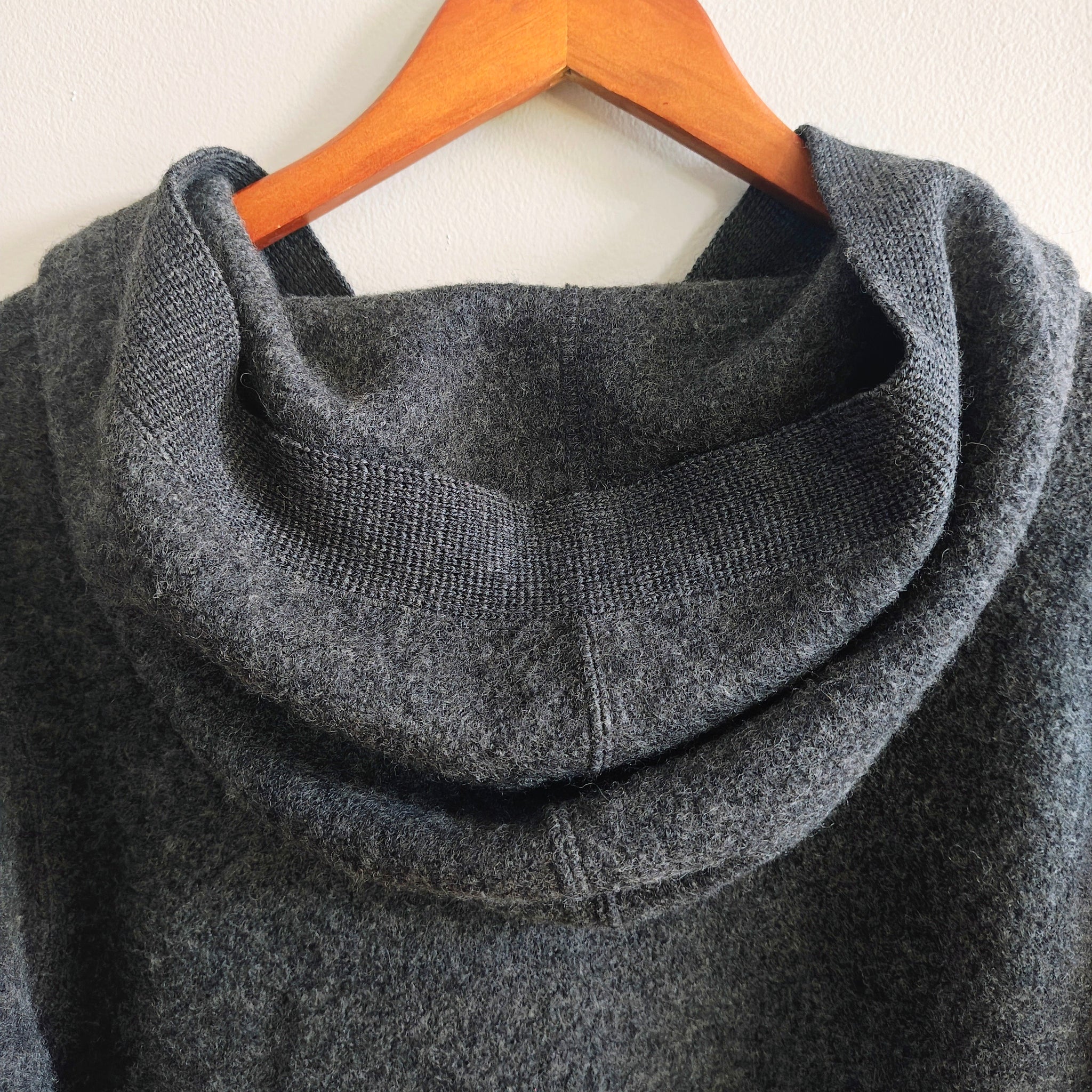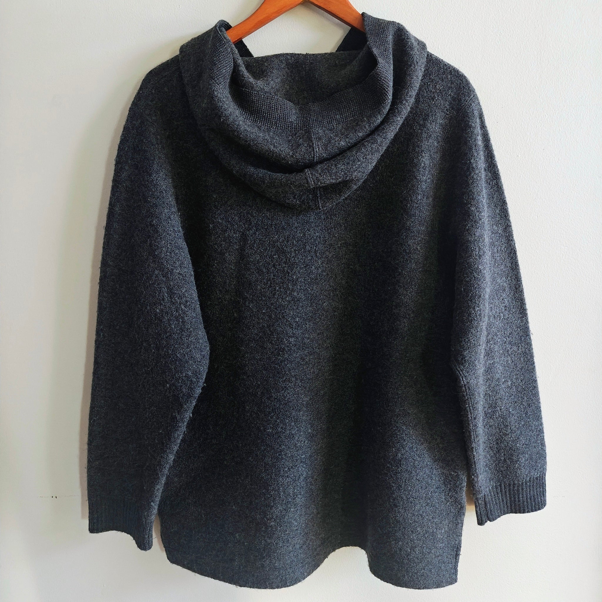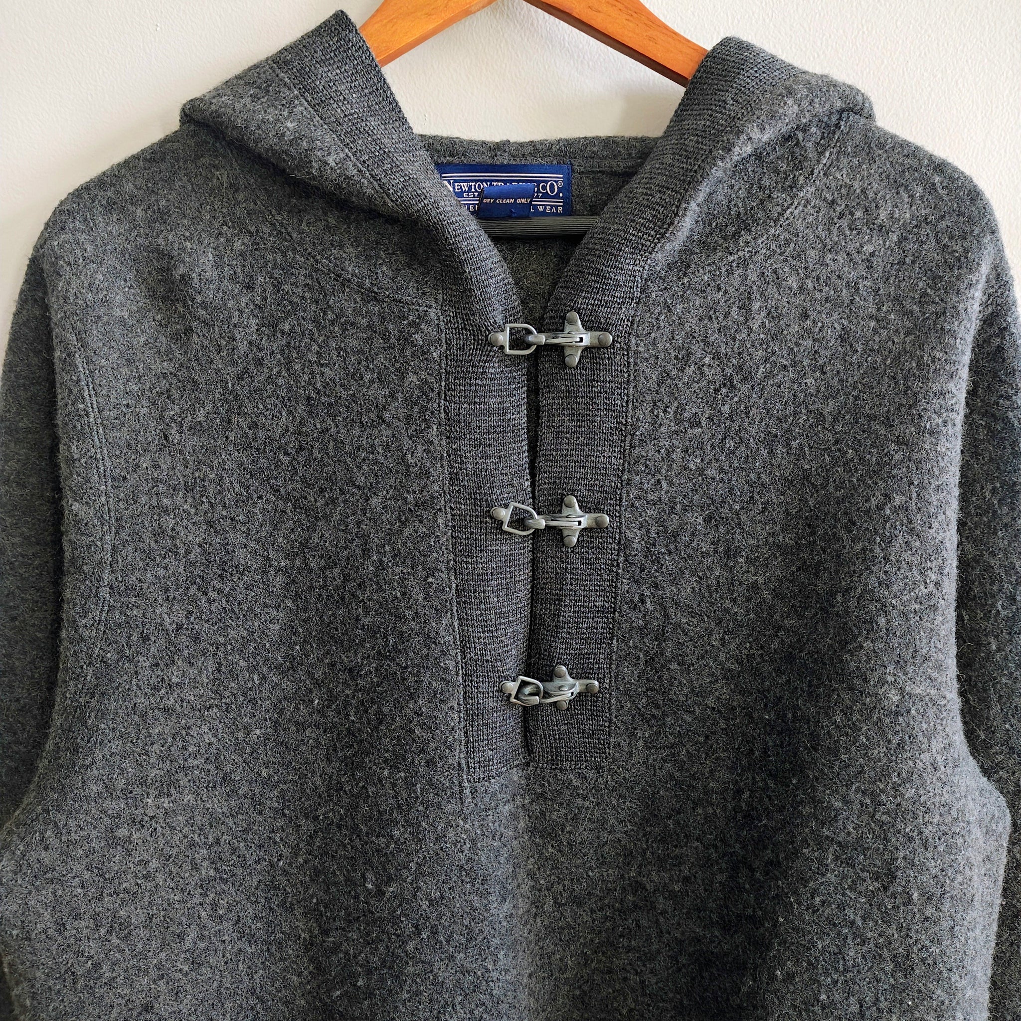 Hooded wool sweater with unique metal toggle closures by the brand Newton Trading Co.