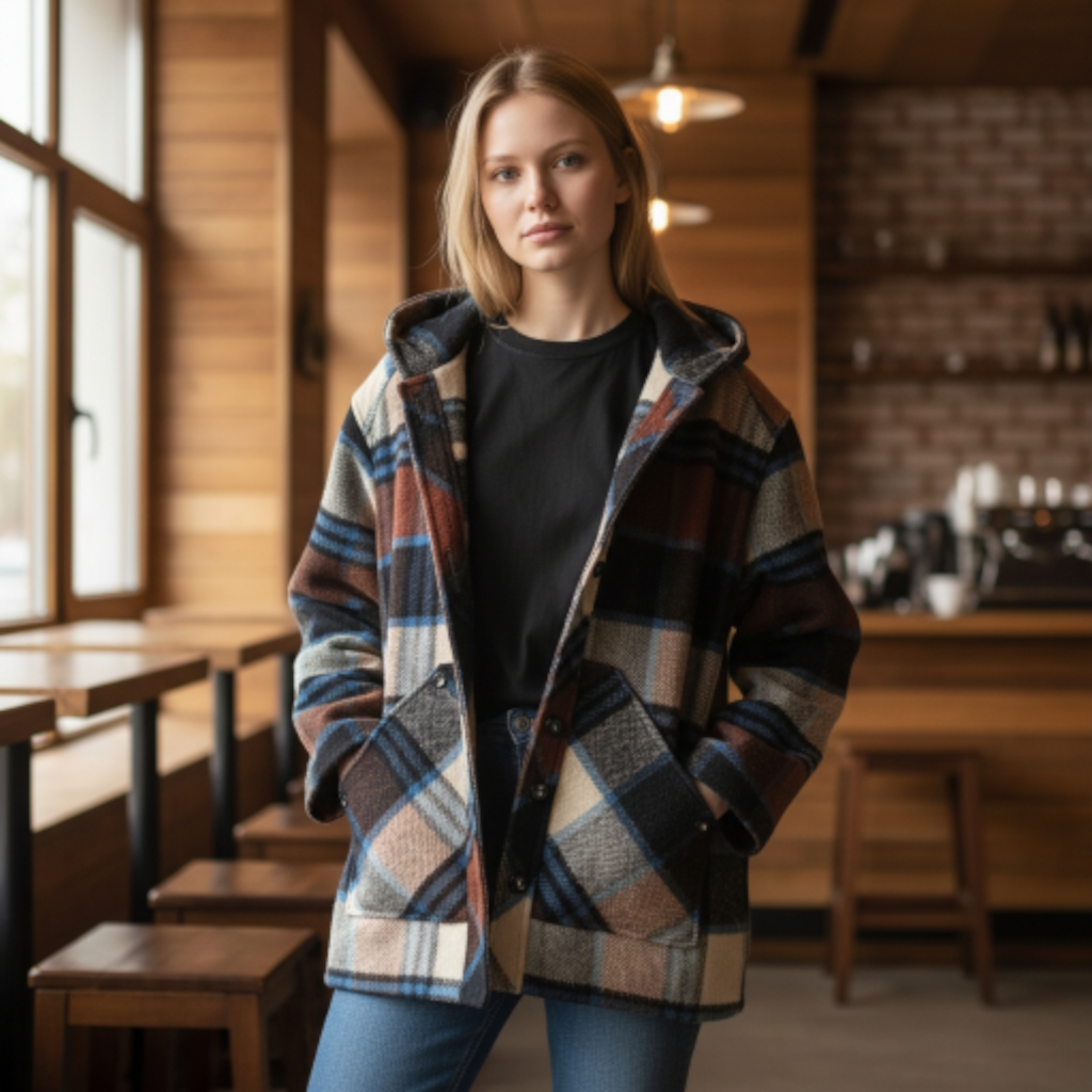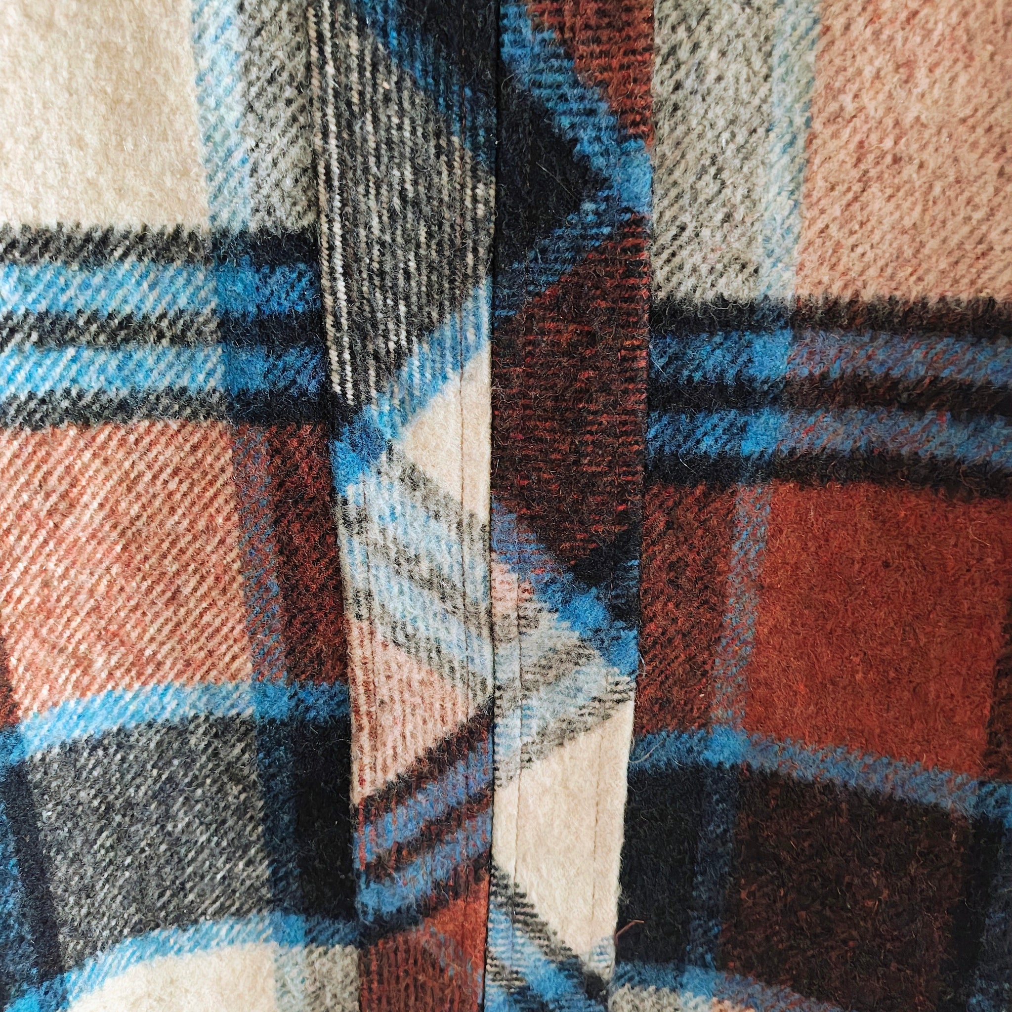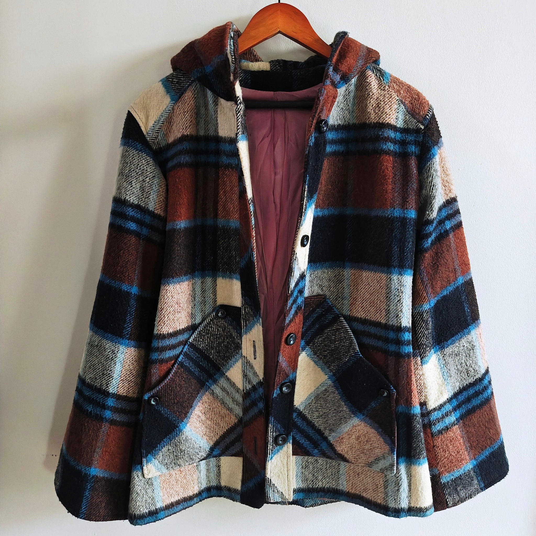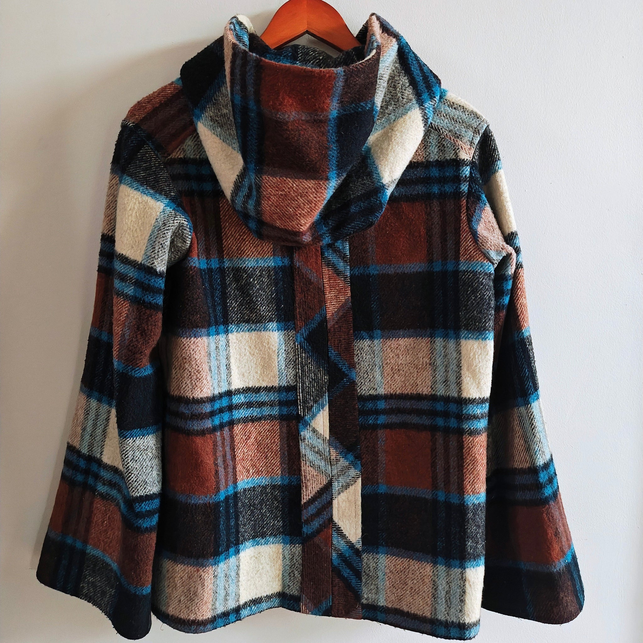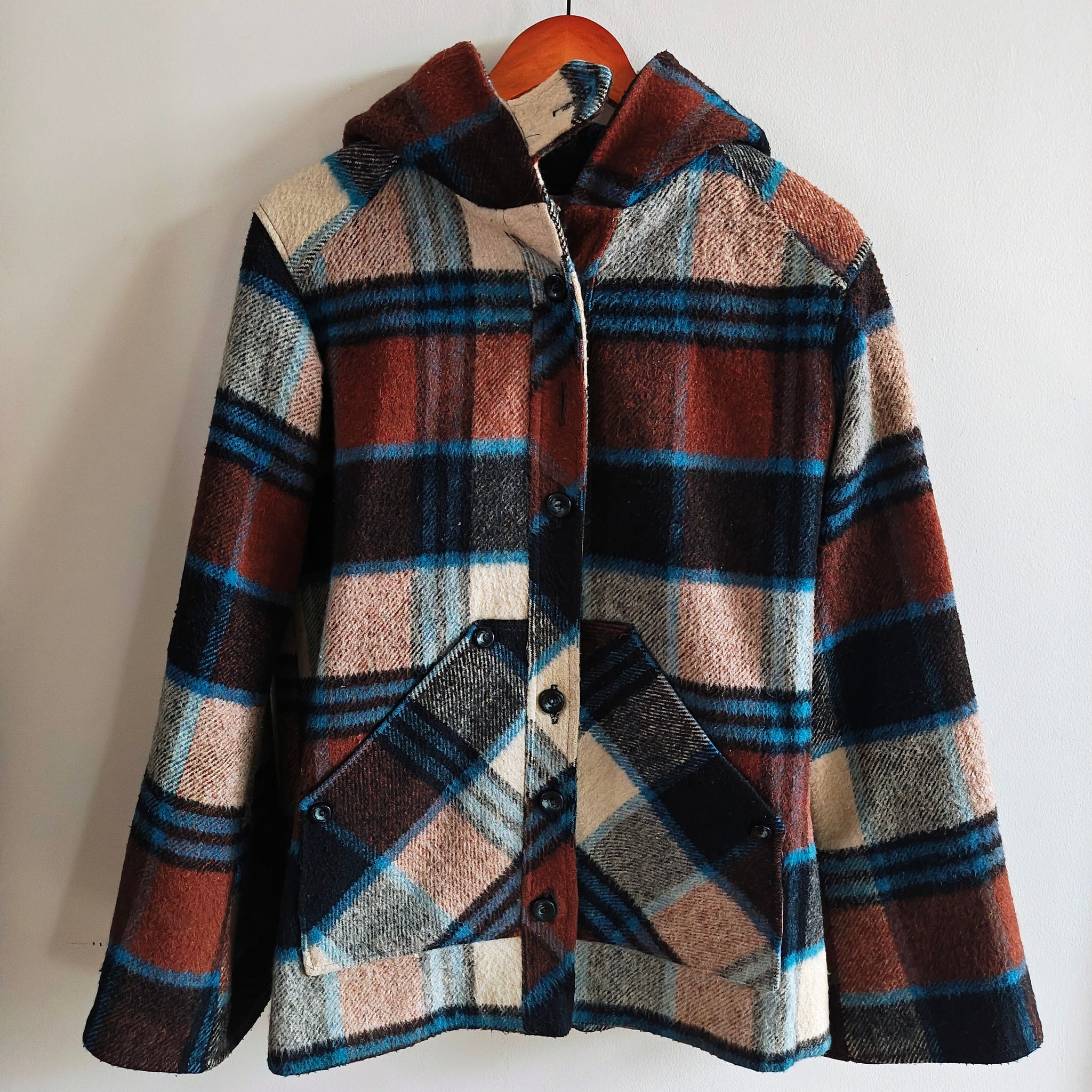 Vintage plaid wool hooded jacket or blanket coat, typically found from brands like Woolrich, Pendleton, or other vintage retailers. The jacket is made from a thick wool or wool blend material and feature a distinctive plaid or tartan pattern in colors such as brown, blue, black, and cream.