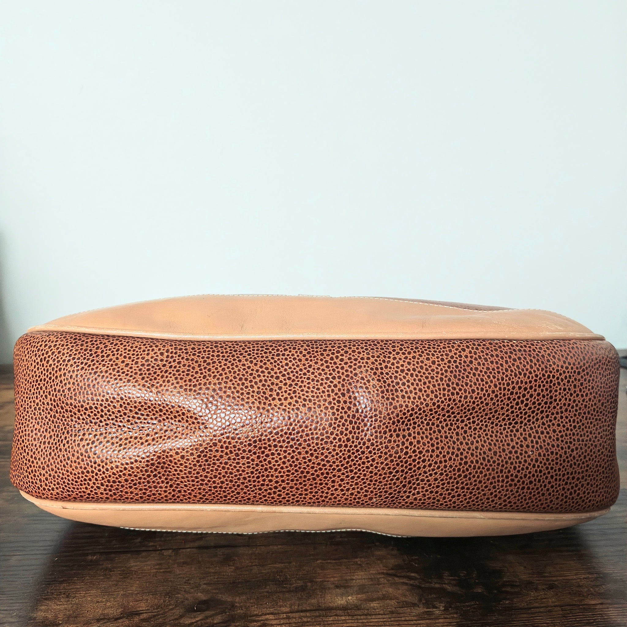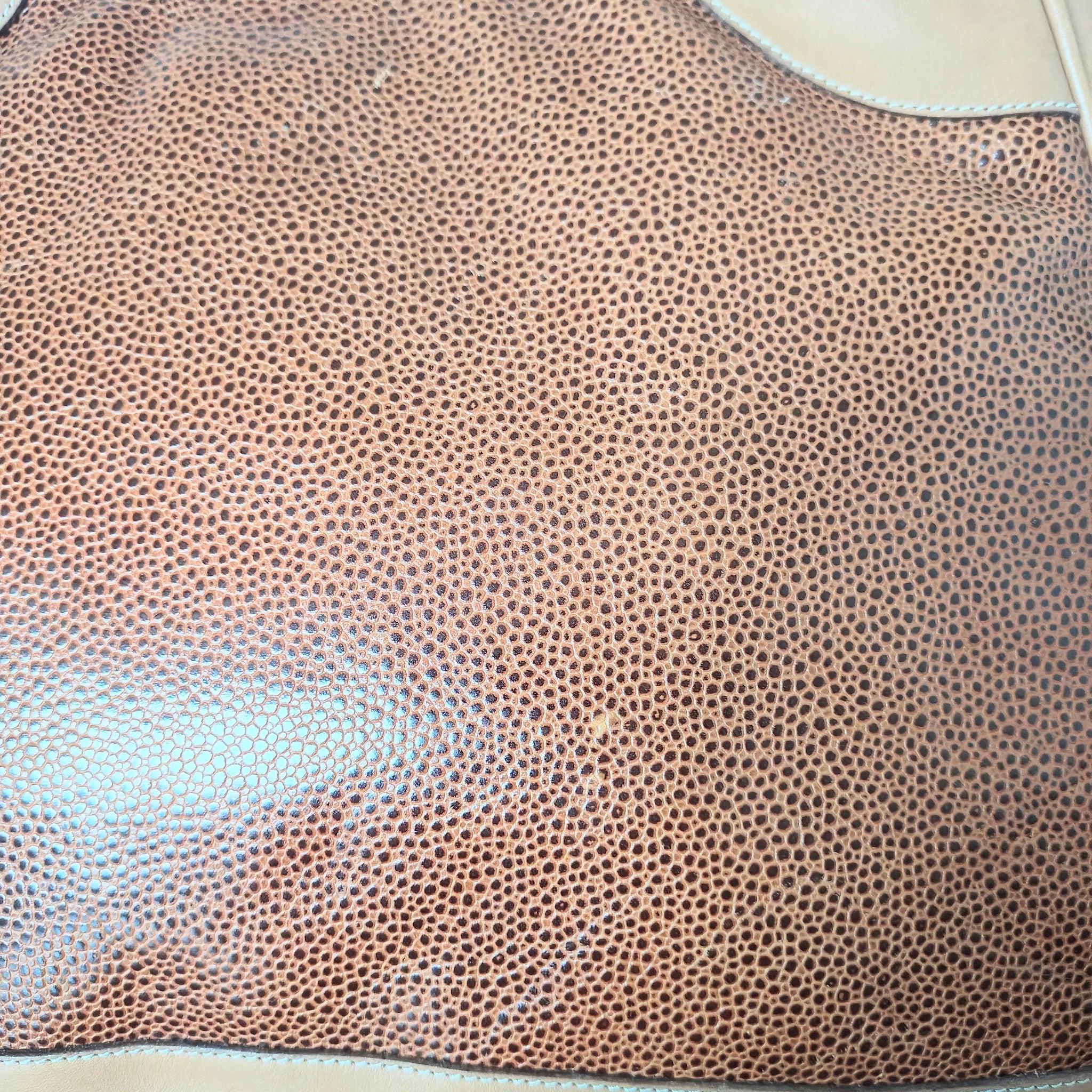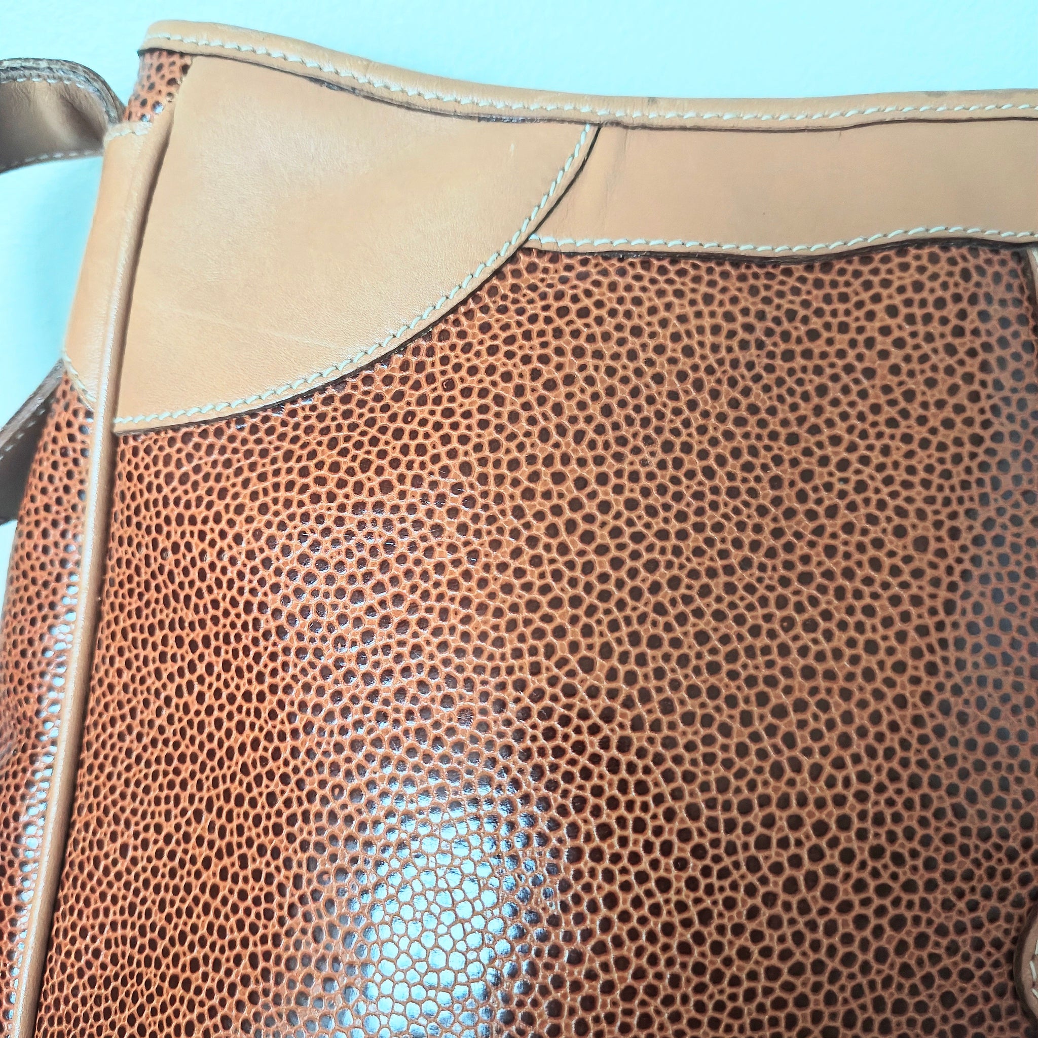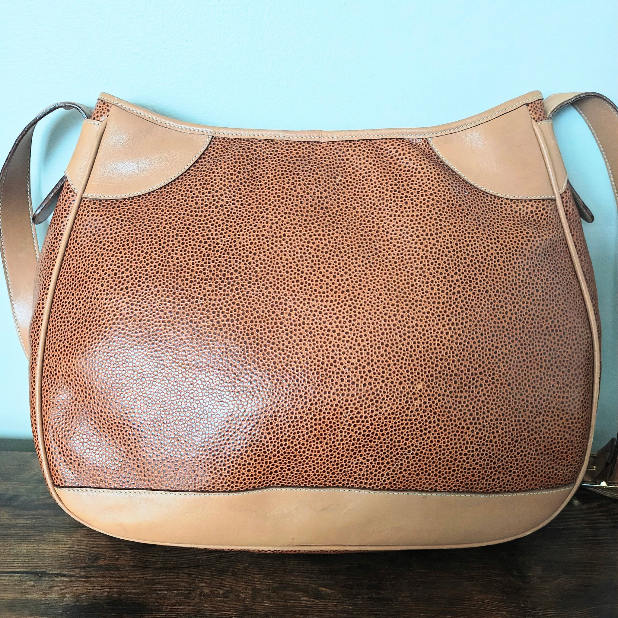 Material: Genuine leather with a distinctive texture, and smooth leather trim in a lighter tan or beige color.