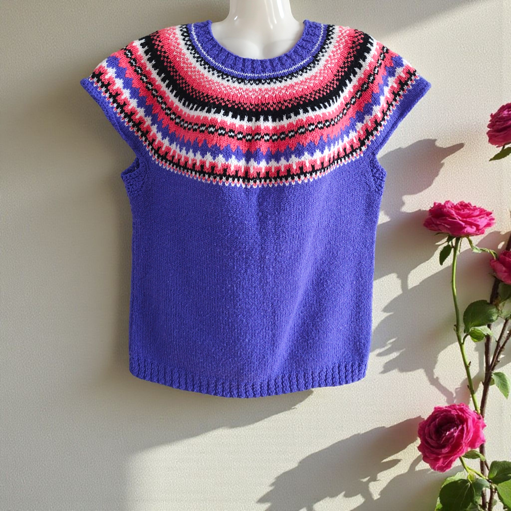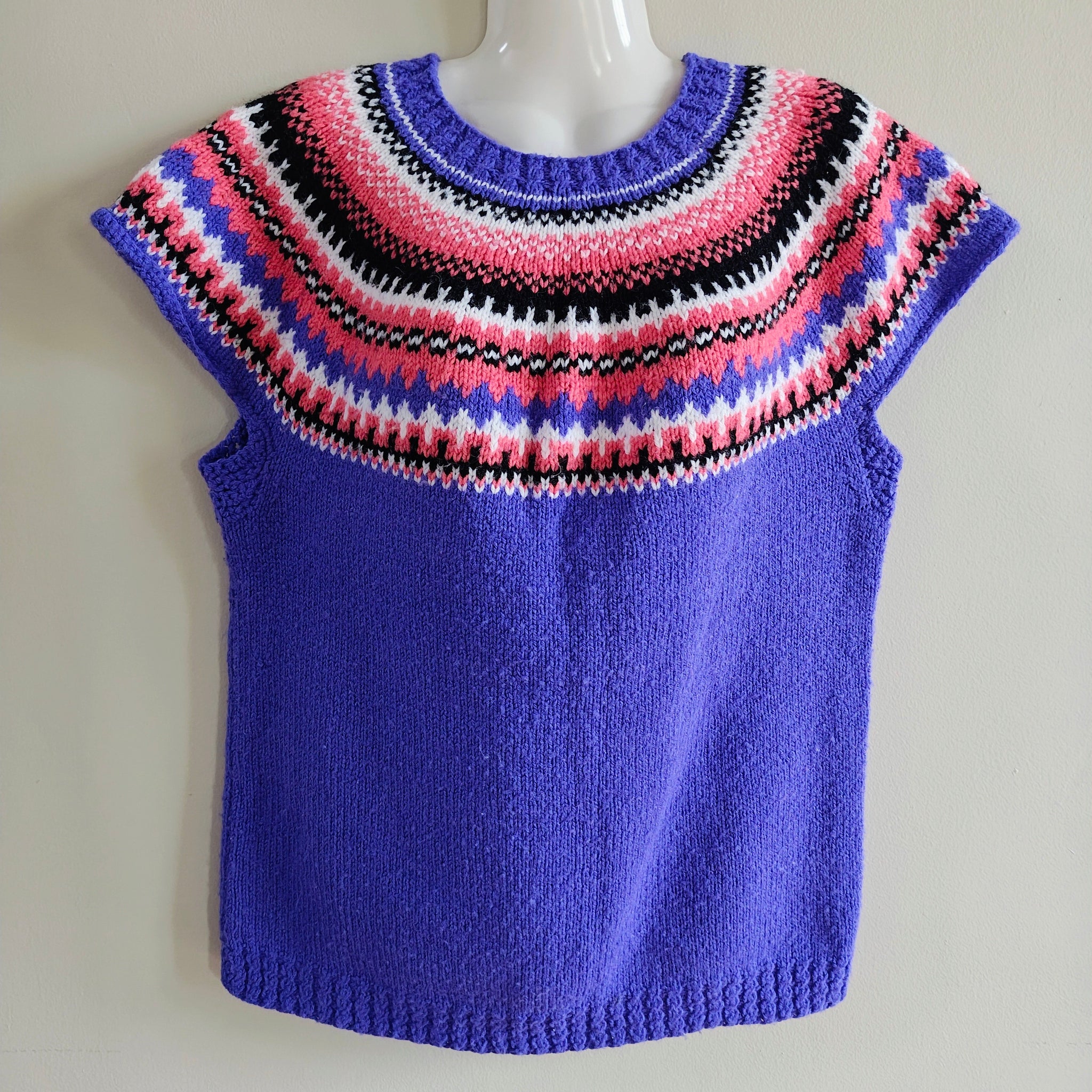 Style: Pullover, crew neck, casual, short-sleeved pullover featuring an "addictive 1x1 colourwork yoke". It is worked seamlessly in the round from the top down