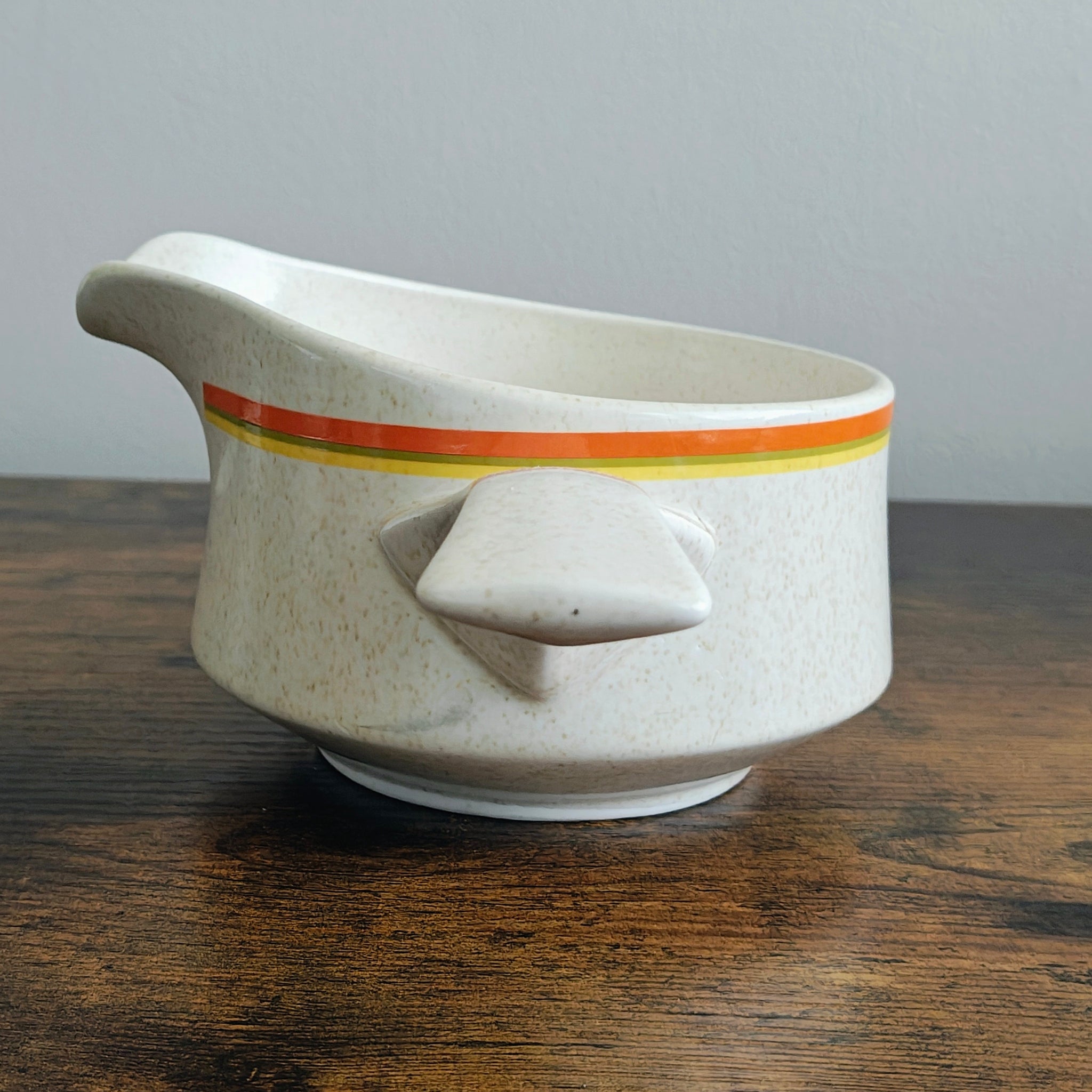 Vintage Fire Flower pattern gravy boat by Lenox, part of their Temperware line. This specific pattern, featuring orange flowers with green leaves and an orange rim, was produced in the USA from approximately 1974 to 1983 and is now a discontinued design.