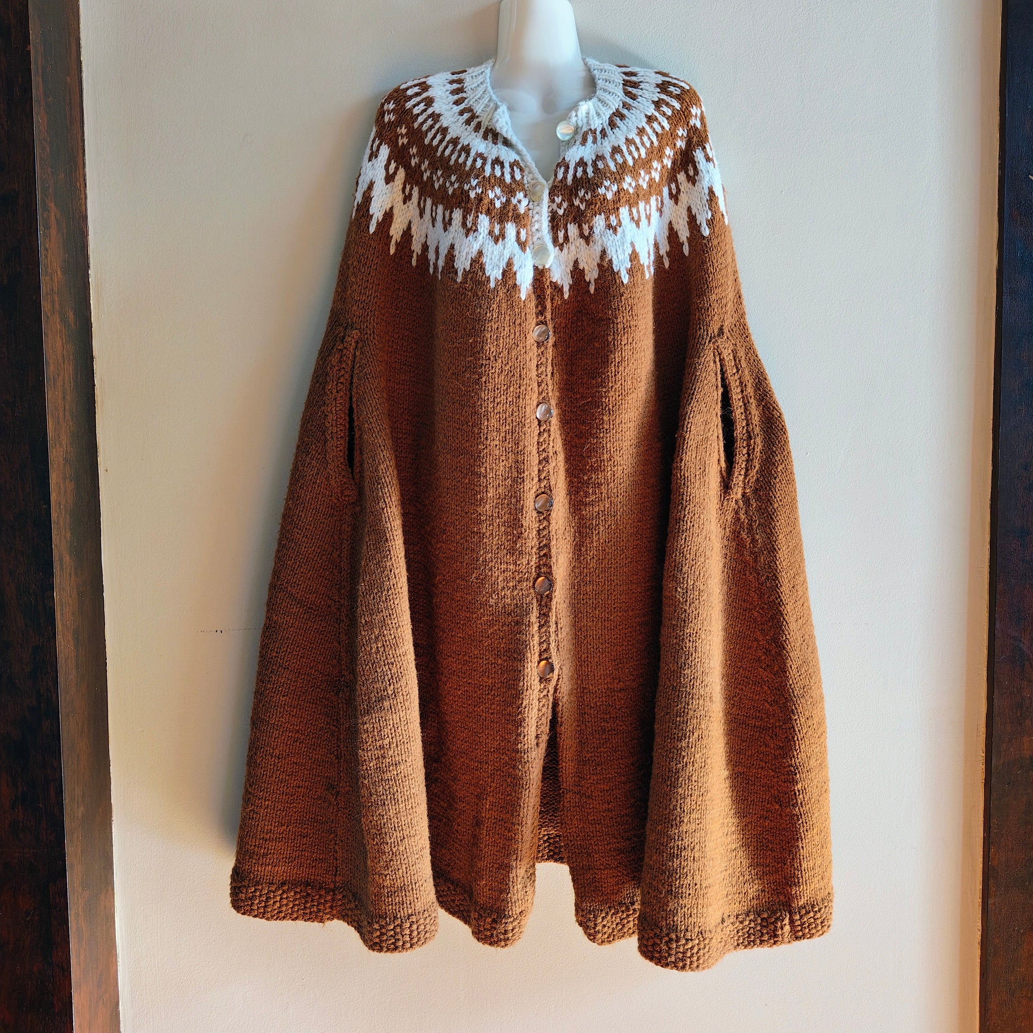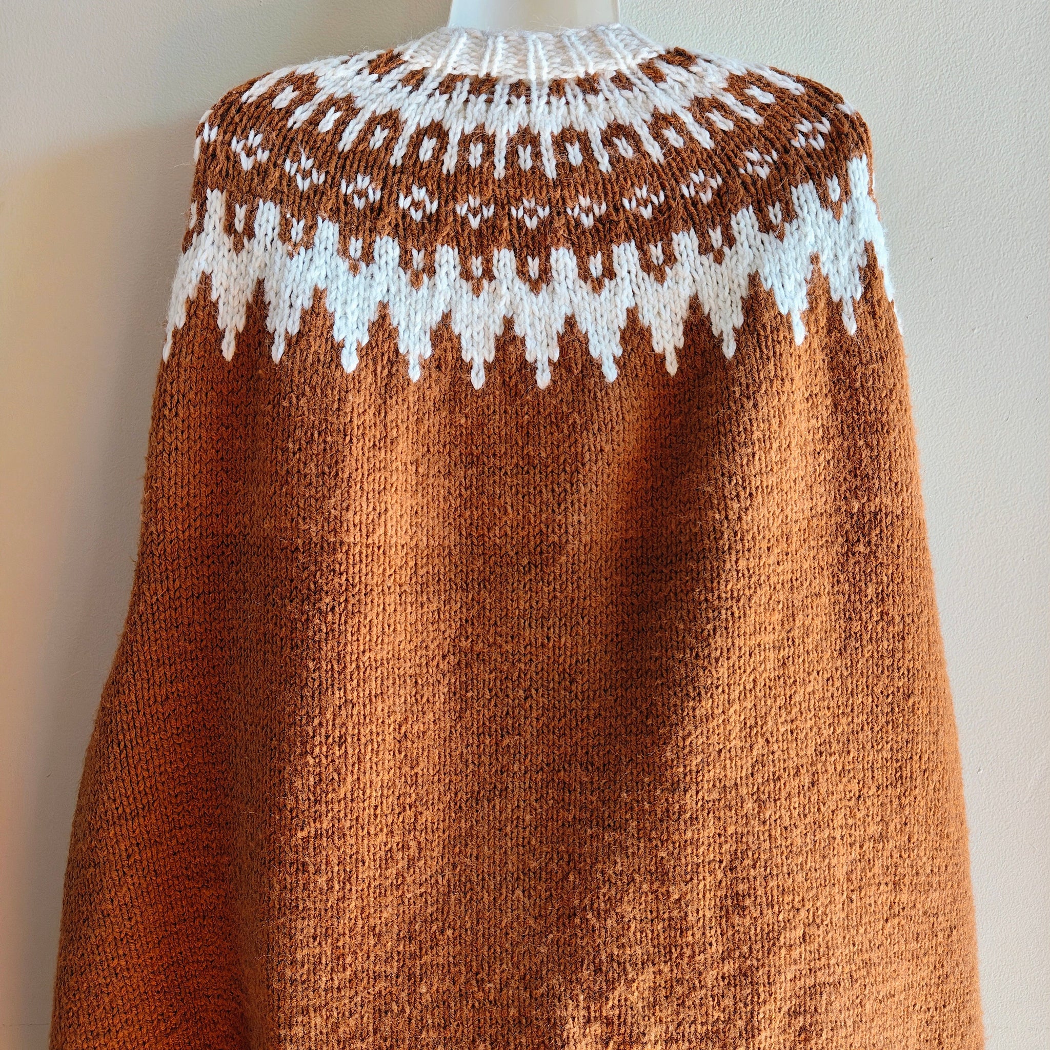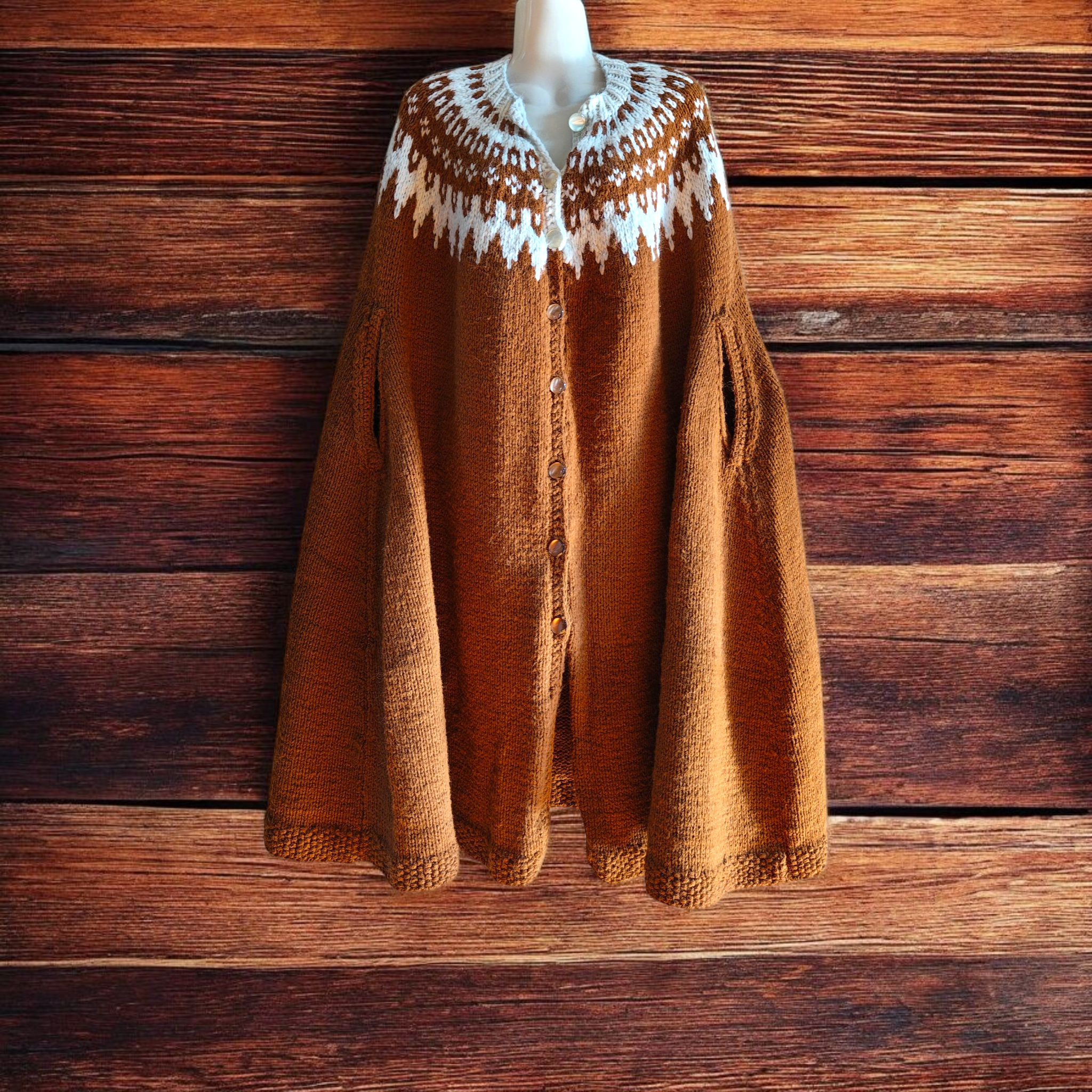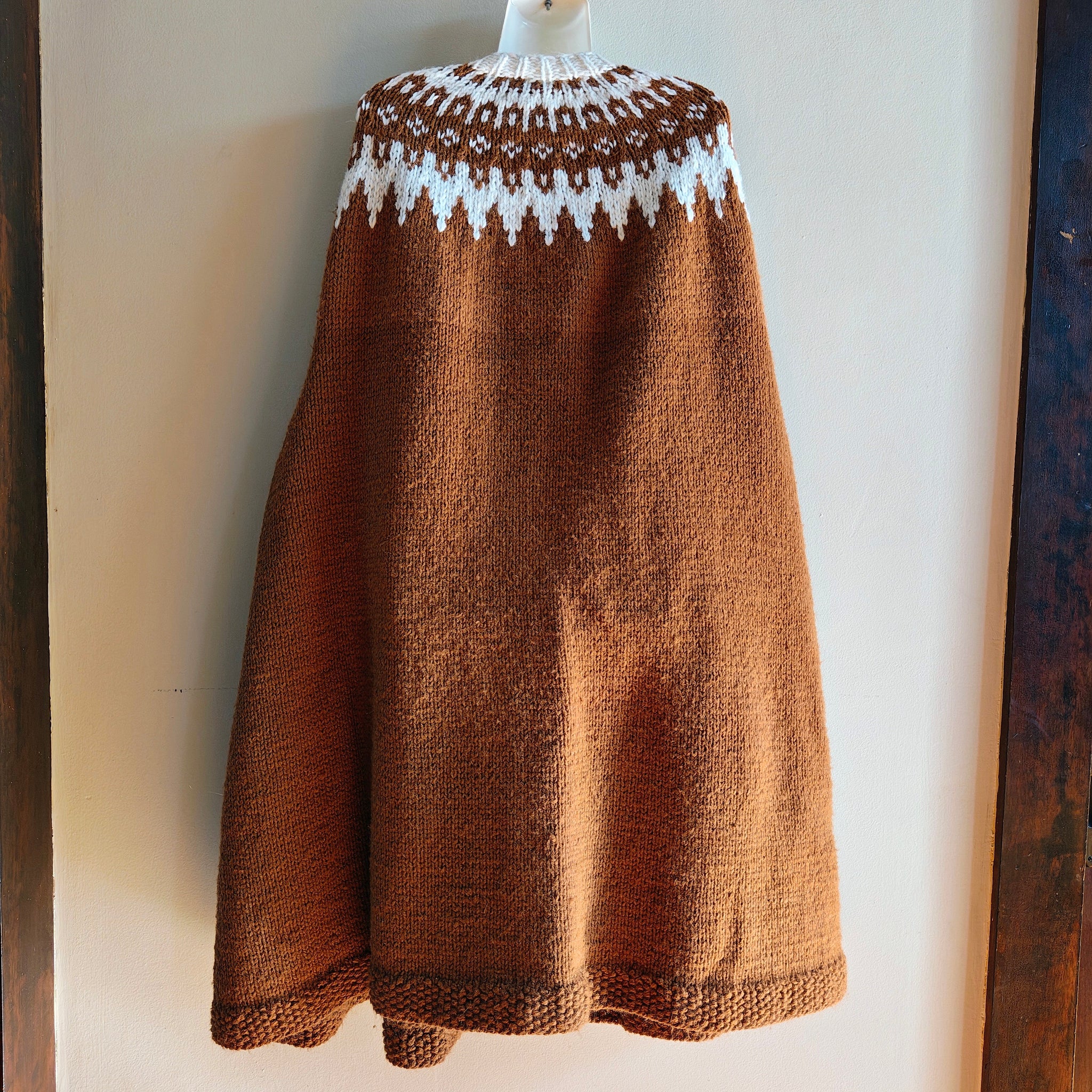 Design: The cape has a distinctive wide, circular pattern around the shoulders, which is a hallmark of the Icelandic lopapeysa style.
